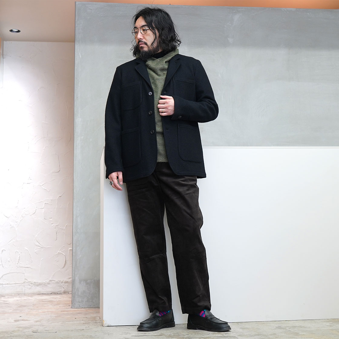 Fieldジャケットは、1ST PAT-RNなりにニットジャケットというものをモダナイズしたもの。シルエットはややゆったり目にし、シームはイングリッシュシームという袋縫いで裏地は付けず、できるだけ軽く柔らかく作られています。