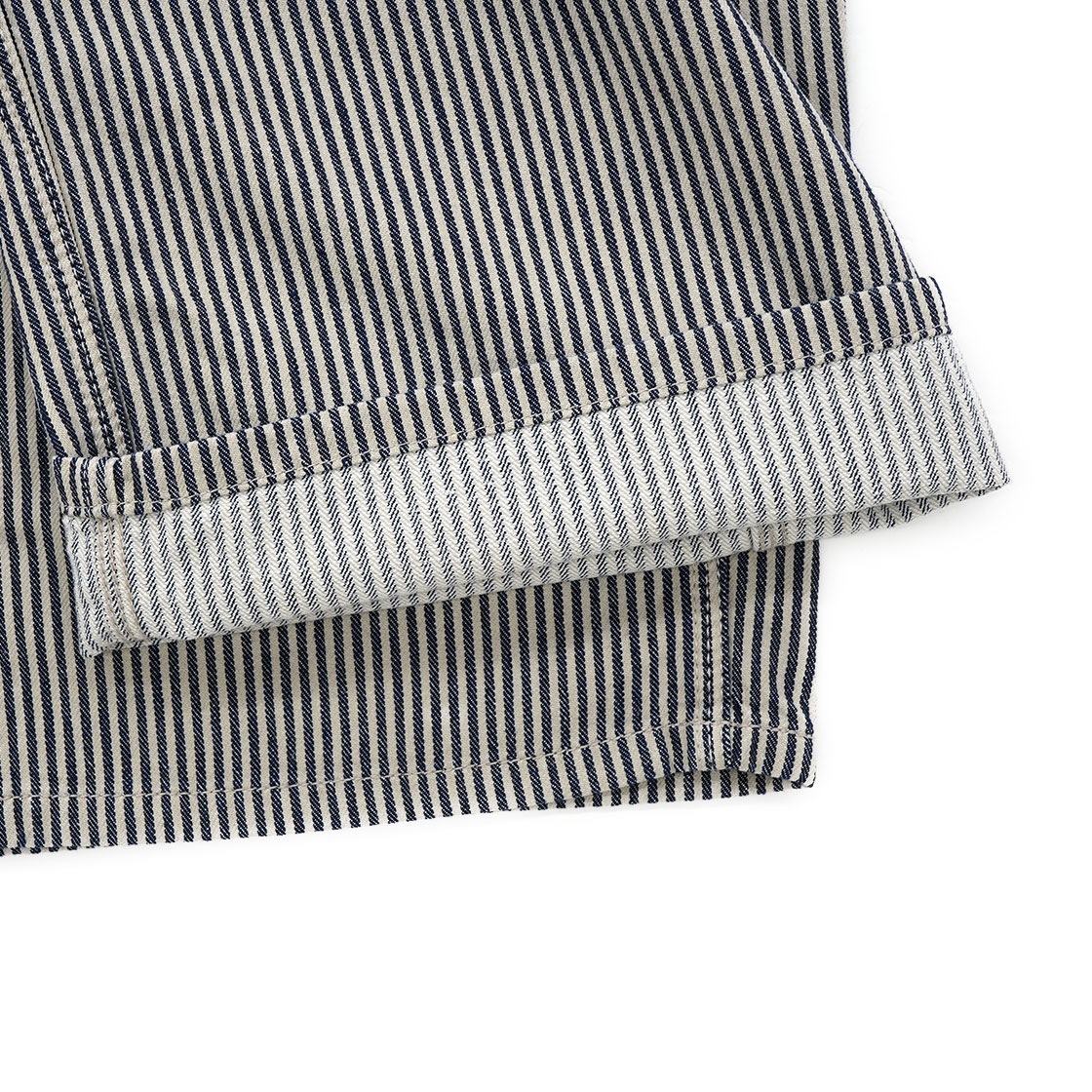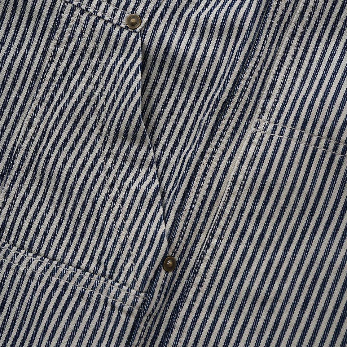 ヘリンボン組織のヒッコリーストライプ生地からは、立体感を感じることができます。その秘密はタテ糸。左綾となる方のタテ糸にはムラ感のある超長綿のマナプール糸を、右綾となる方のタテ糸にはふくらみとコシのある空紡糸を使用しています。その理由は、左綾の方は糸が締まり、右綾の方は糸が緩み膨らむという特性を利用し、水を通すごとにヴィンテージさながらの凹凸が出るようにするため。