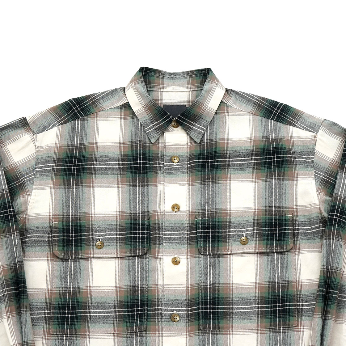 コムアーチにしては珍しいチェックシャツ。生地は、国内でシャツ用の生地を専門に開発・生産をしているメーカーで製作されたシャンブレー生地。その生地に起毛加工を施し、ネルシャツのように仕上げています。