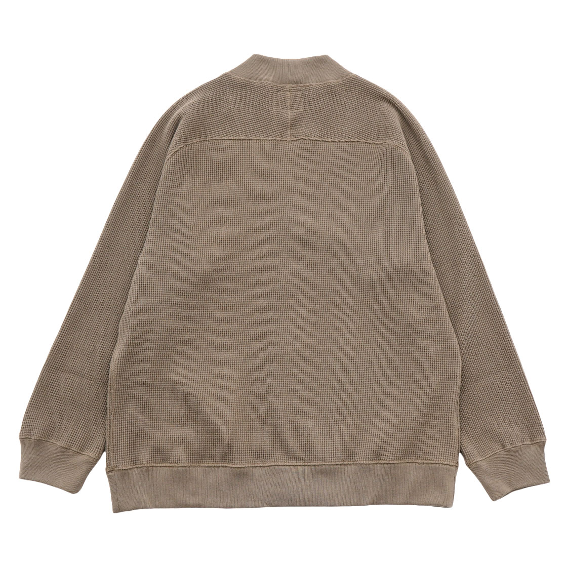 特にメンフィス綿は、かつてアメリカ最大の綿市場があり、良質な綿が育つ土壌があります。乾いた空気と昼夜の大きな寒暖差により、ドライタッチでハリのあるタフな性質を持ちます。その綿を用い、撚糸をやや甘くした糸を製作。その糸を元に、今度はワッフル生地をタイトに編み立てました。それは「触感は柔らかいのに、型崩れしにくい」製品を作るため。しっかりと編まれているため、綿1枚地ながらボリュームがあり、またストレッチ性にも富むので着る人の体にあわせてなじんでいきます。さらにラグランスリーブにすることで、その優しいフィット感を最大限に高めています。
