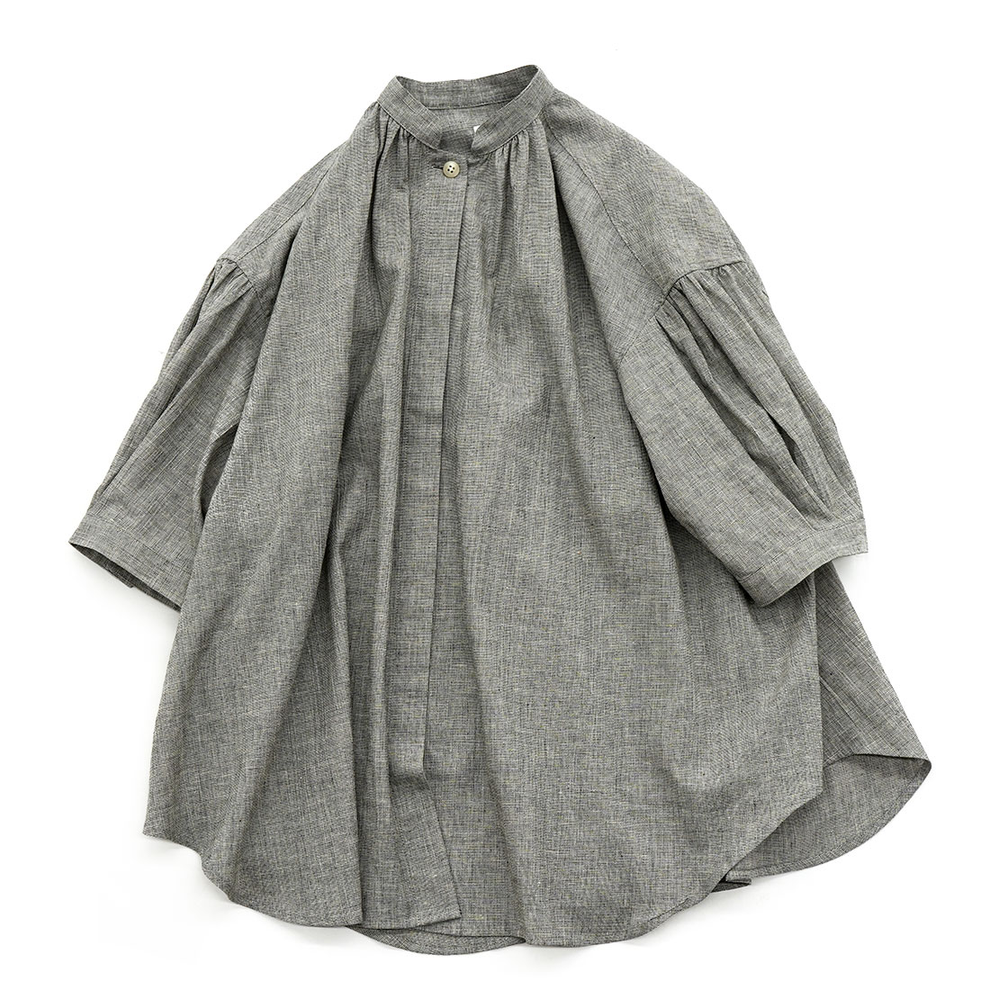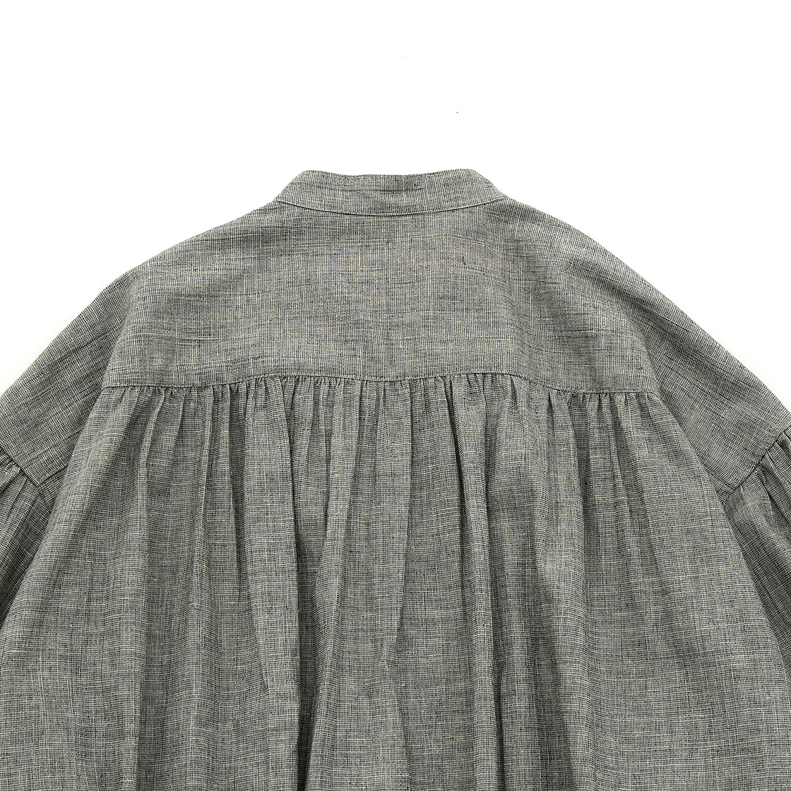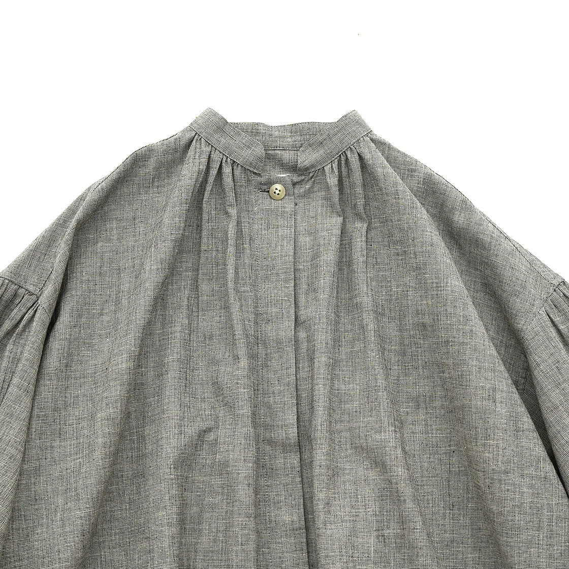 形はクラシックな生地とは正反対に、シンプルでモダンなデザイン。スタンドカラーにフライフロント(比翼仕立て)の組み合わせがとてもシンプルで、生地を前面に押し出しています。首、肩、背中にはたっぷりギャザーを取り、貴重なデッドストック生地をたっぷり使った贅沢な仕様です。