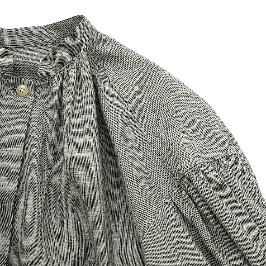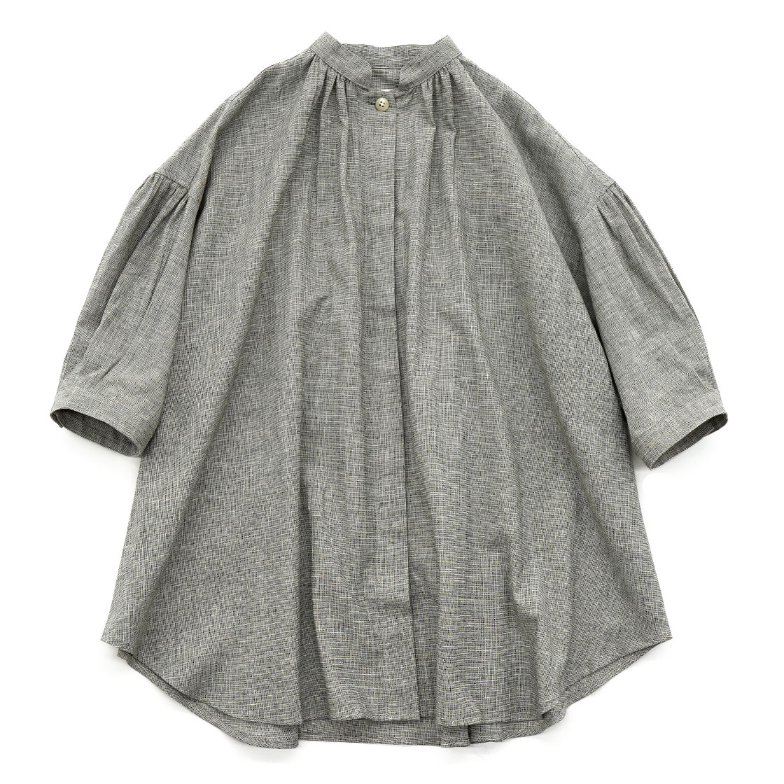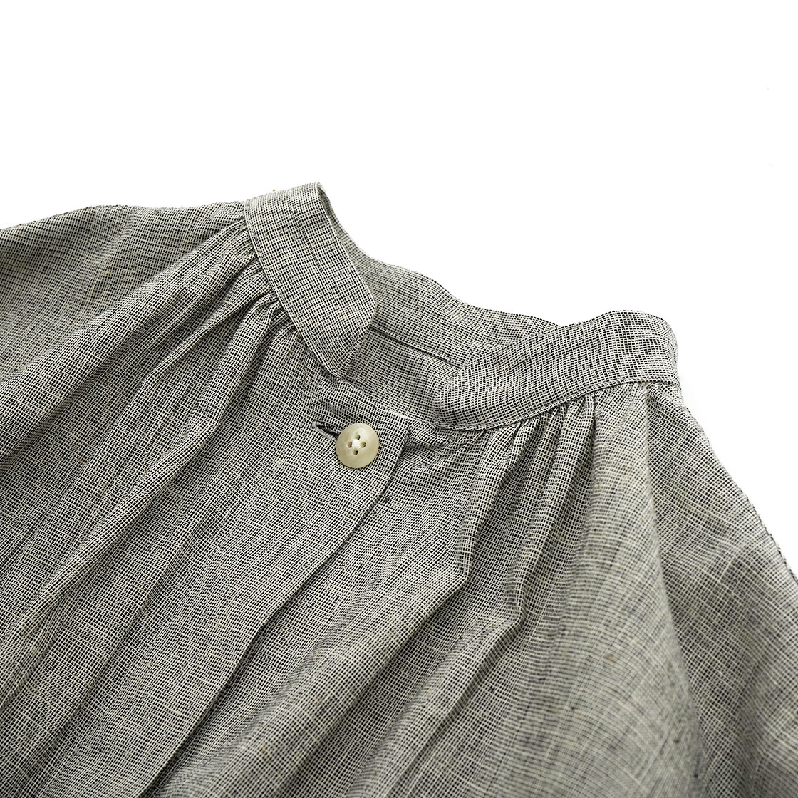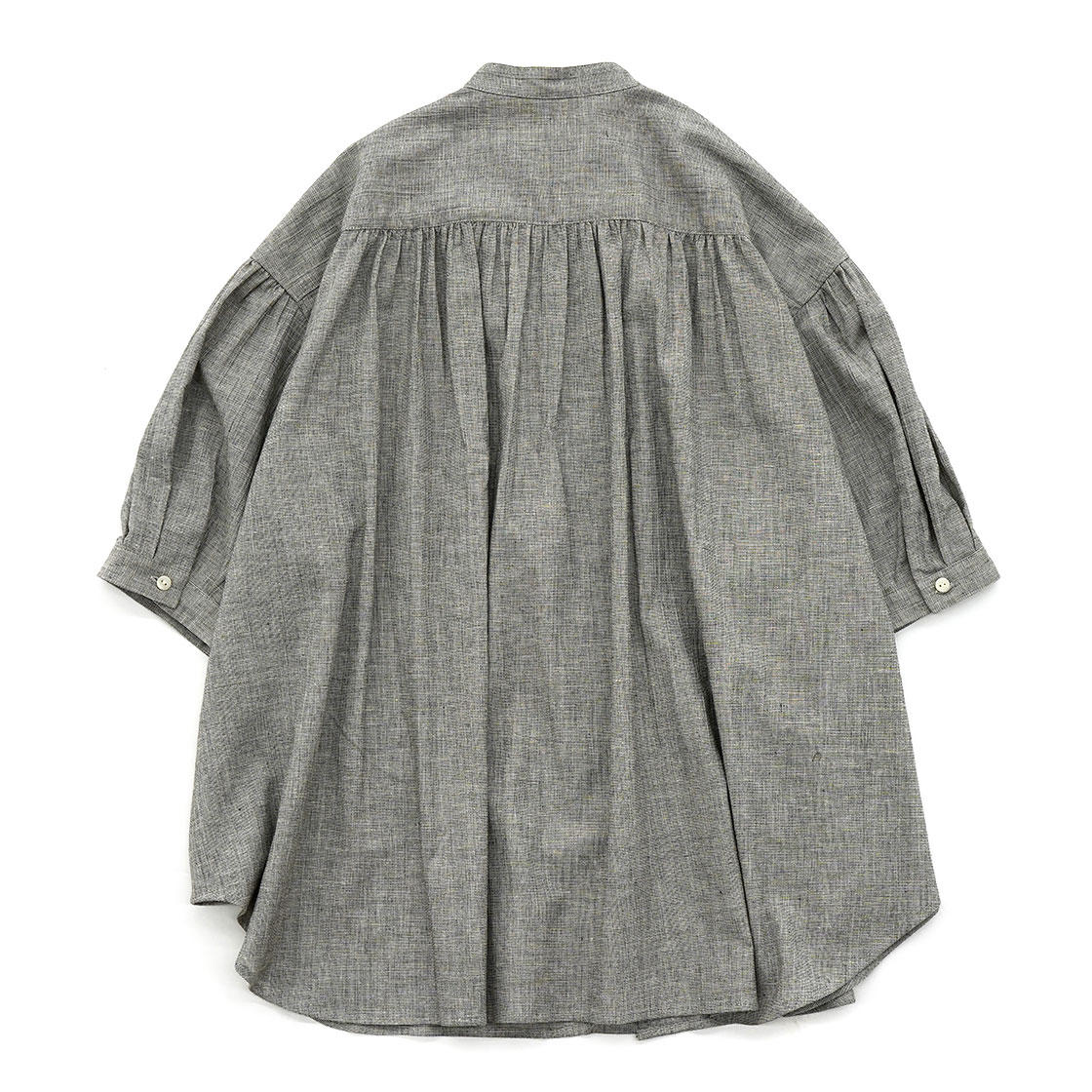 形はクラシックな生地とは正反対に、シンプルでモダンなデザイン。スタンドカラーにフライフロント(比翼仕立て)の組み合わせがとてもシンプルで、生地を前面に押し出しています。首、肩、背中にはたっぷりギャザーを取り、貴重なデッドストック生地をたっぷり使った贅沢な仕様です。