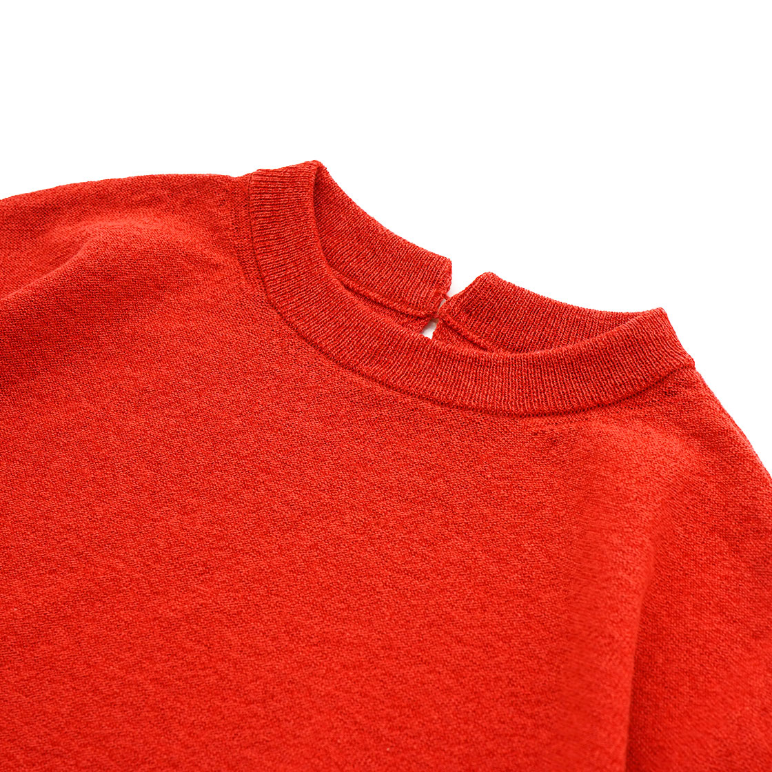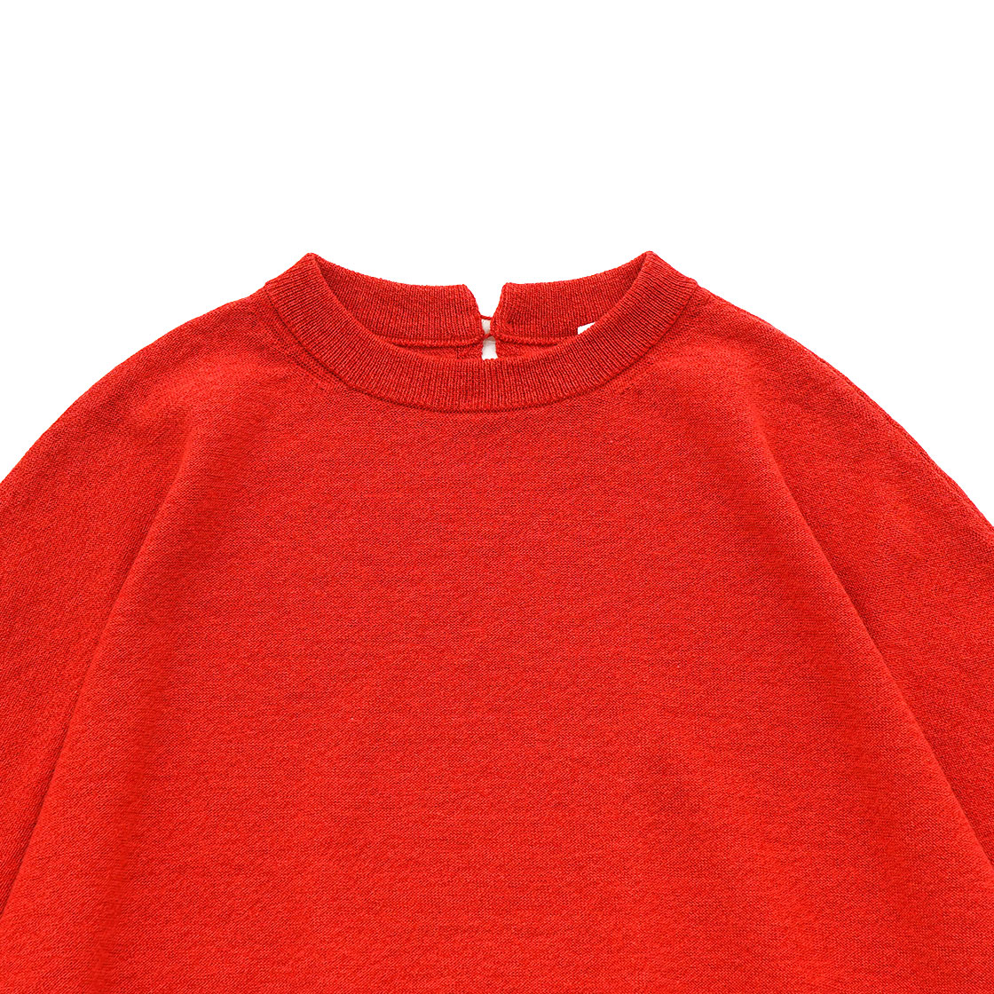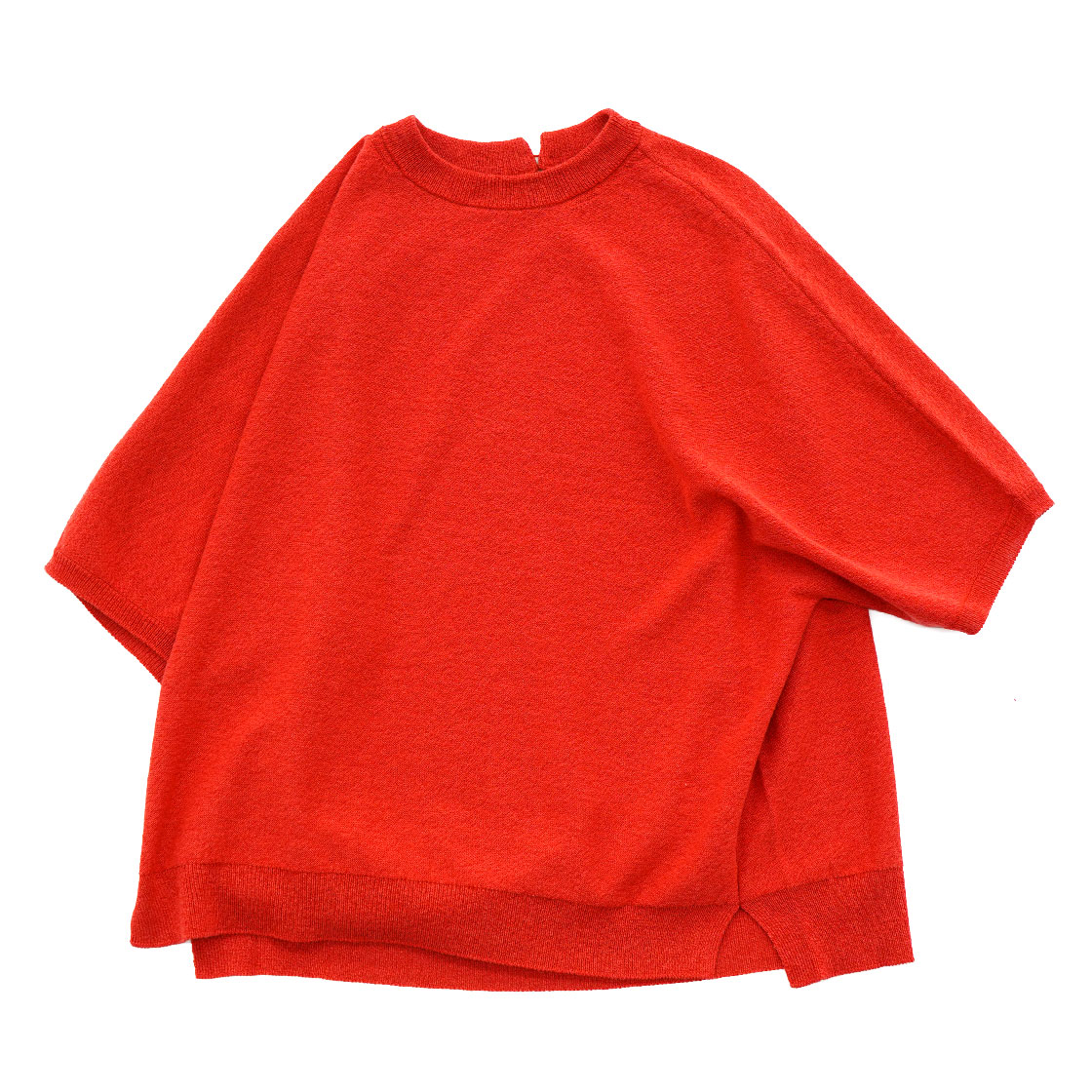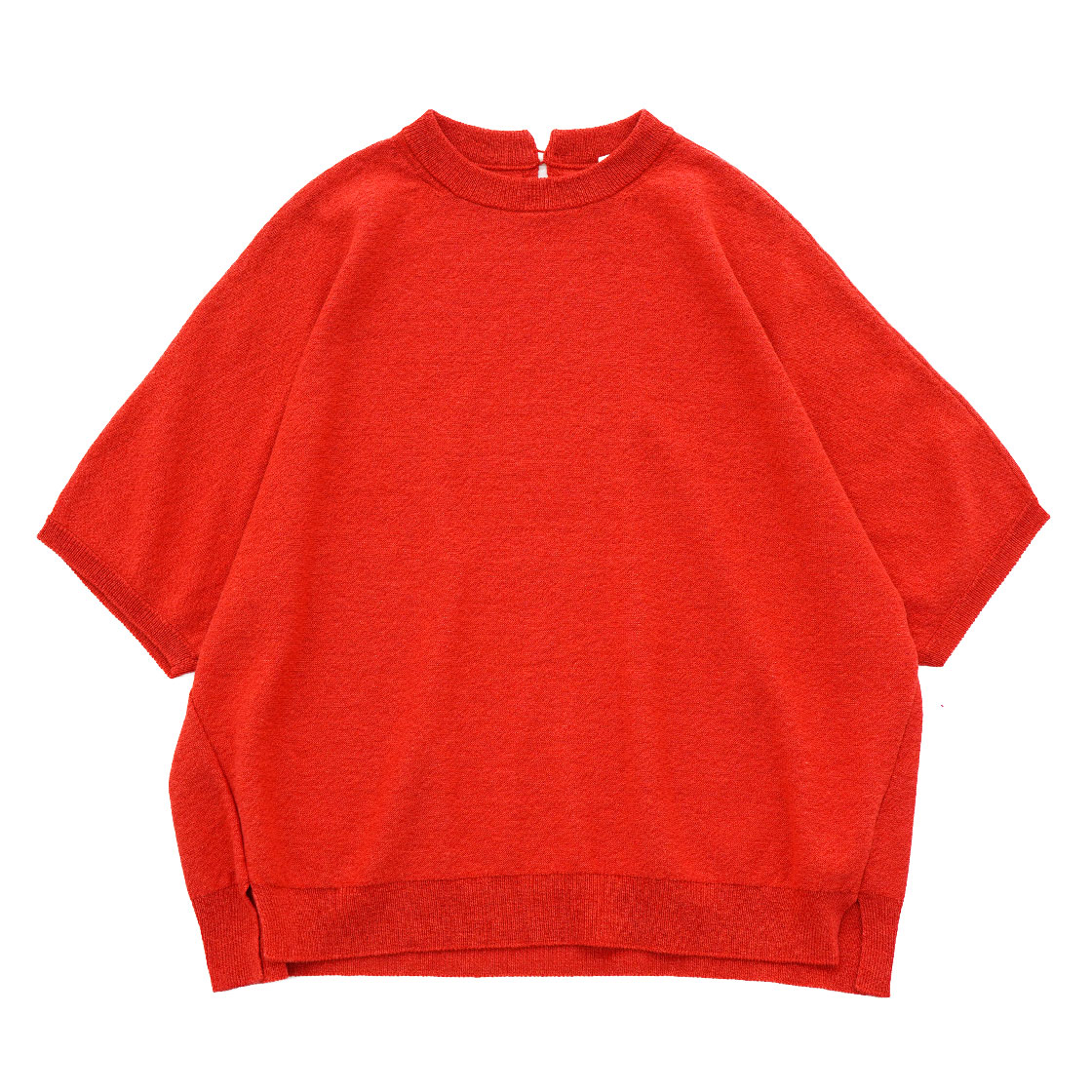 形はドルマンスリーブを採用したシンプルな半袖ニット。よく見ると身頃脇が少し前にズレています。これは前後だけでなく横から見た際にはスマートに見えるようにするための仕様。