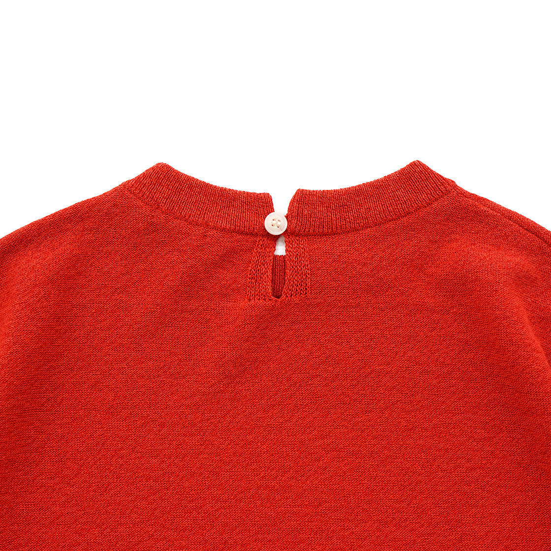 またリネンとコットンで染色時の染まり方が異なるため杢感が出ます。そのため、編み立てて生地にすると、単色ながら非常に奥行きのある風合いに仕上がっています。また編地は、天竺編みを裏使いしています。表側の天竺だとフラットな見た目になってしまうため、あえて裏にすることで生地の素材感・立体感を表現しています。