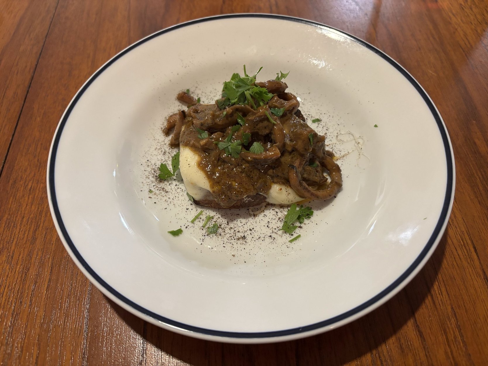 これはイカの肝をお酒のチンザノで煮込んで、モッツァレラチーズの上に載せたやつとのこと。