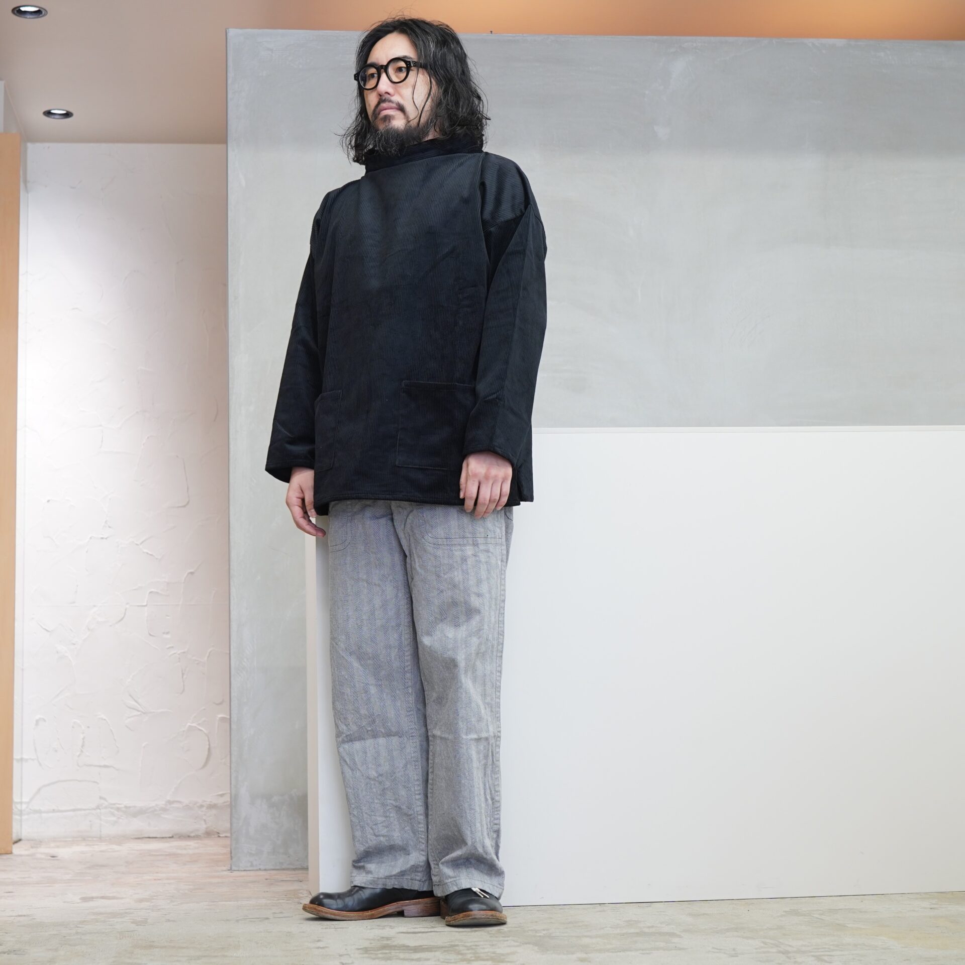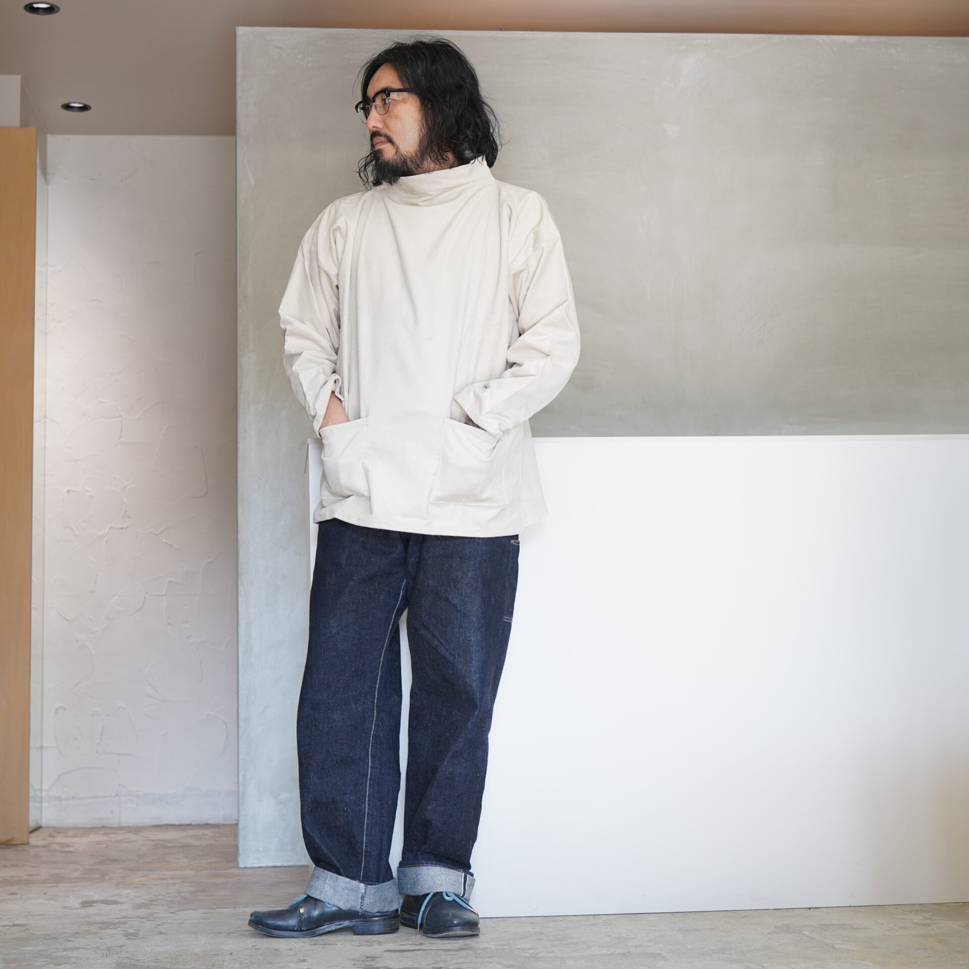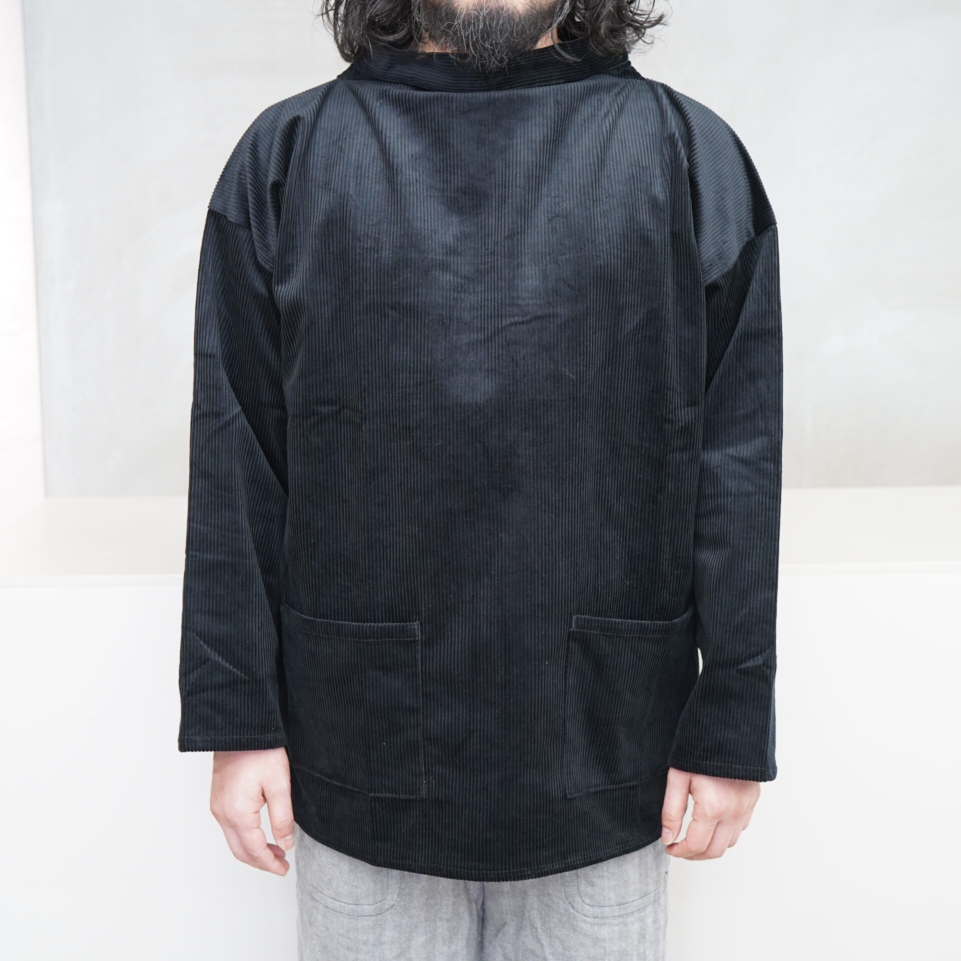 なんなら前後どちらで着てもいいですからね。形はフィッシャーマンスモックがベースになっているので。