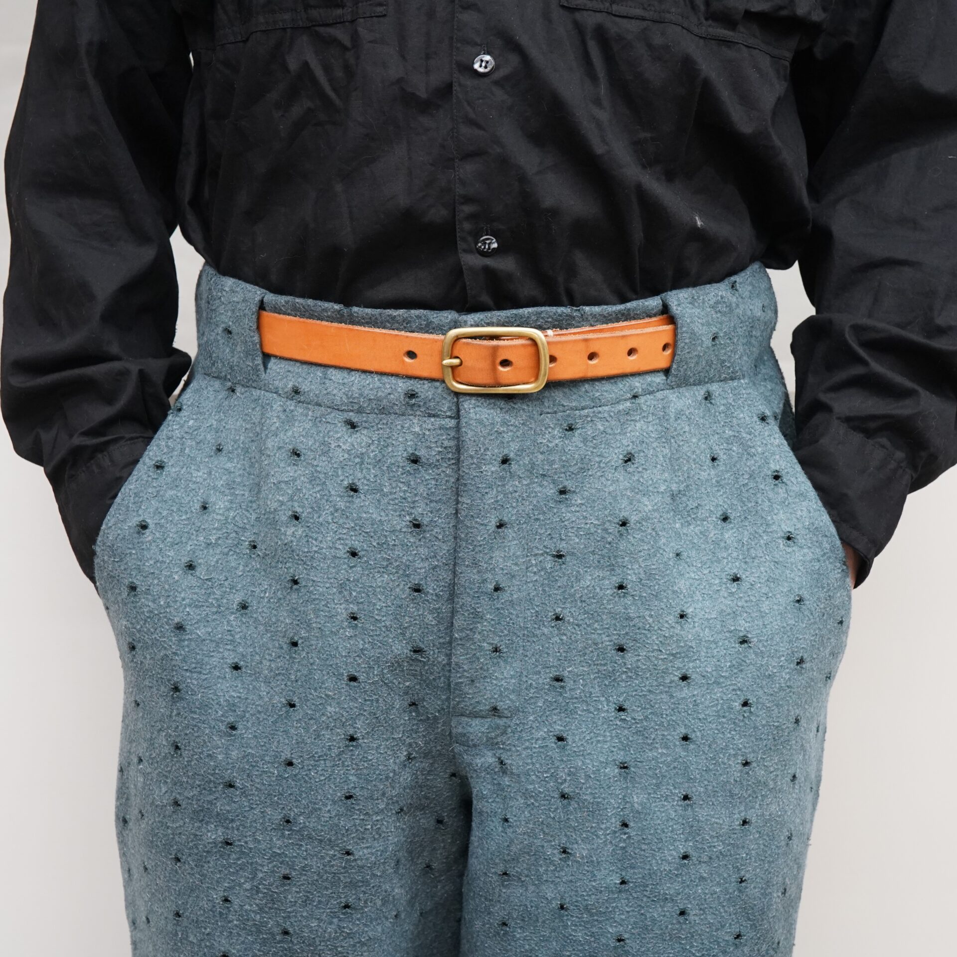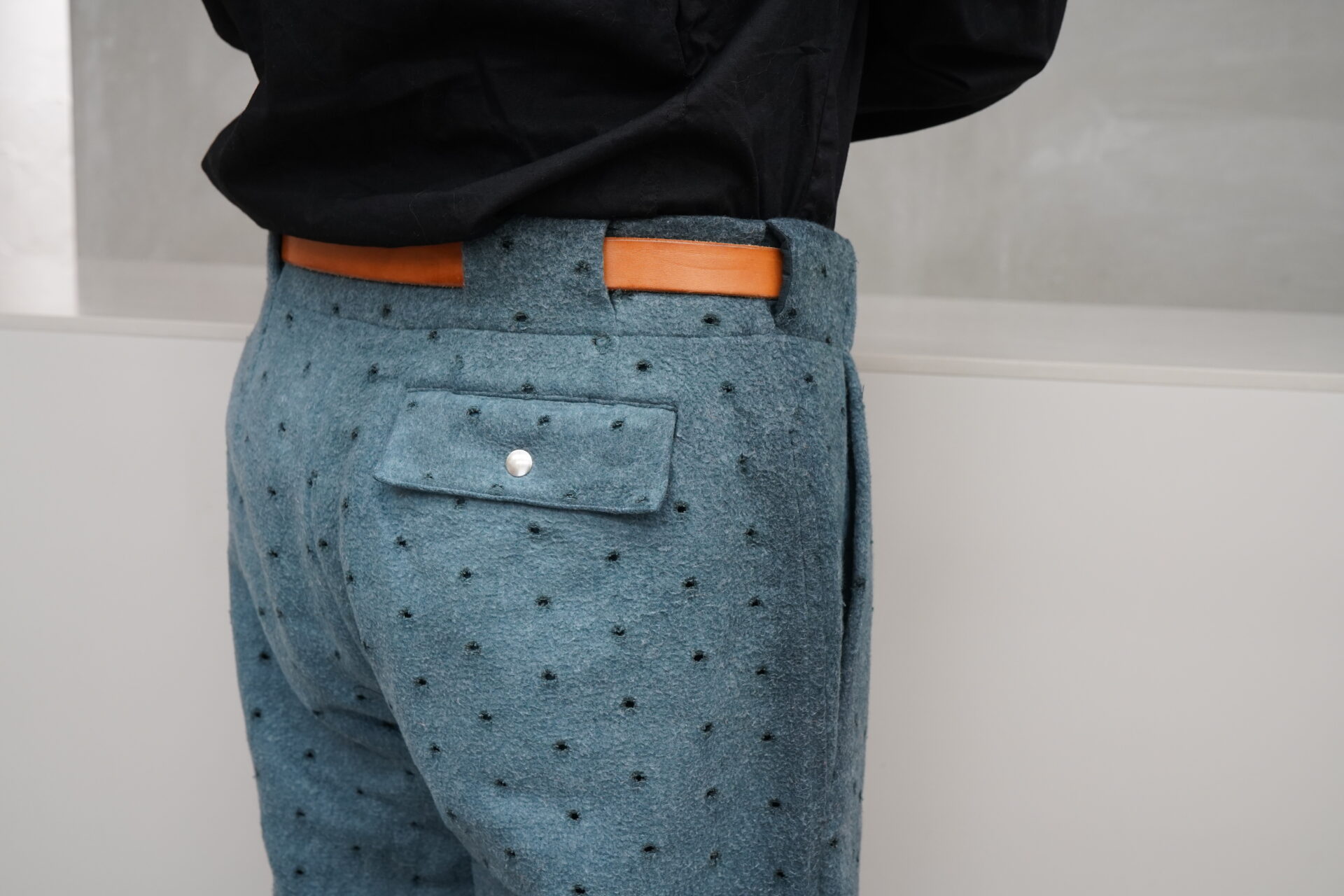 このパンツ、ベルトループの構造が面白くて、ベルトループを設けずに腰帯にスリットを入れて、そこにベルトを通す構造なんです。