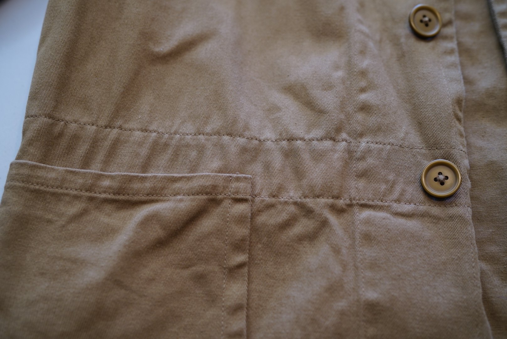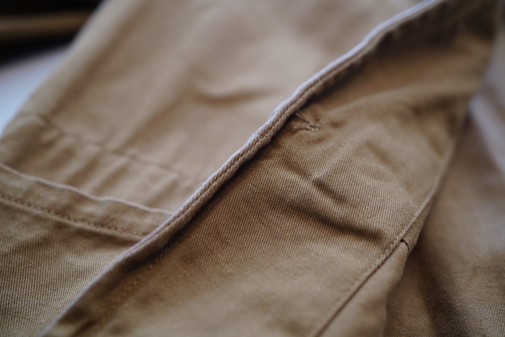 適当に洗濯機にぶち込んで洗って、ちゃんと形を整えずに干したせいで前立てがねじれちゃってますが、なんとも思いませんね。