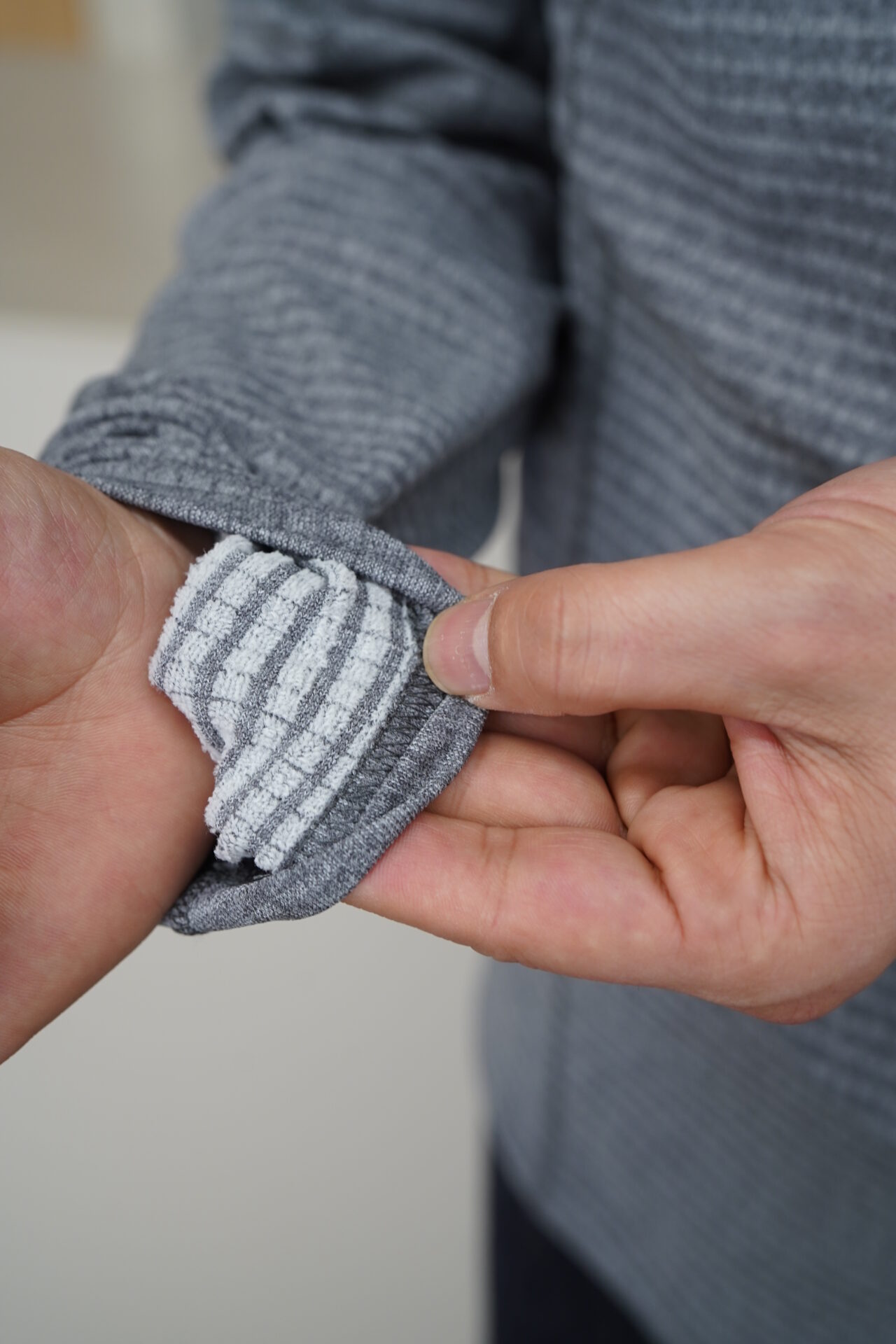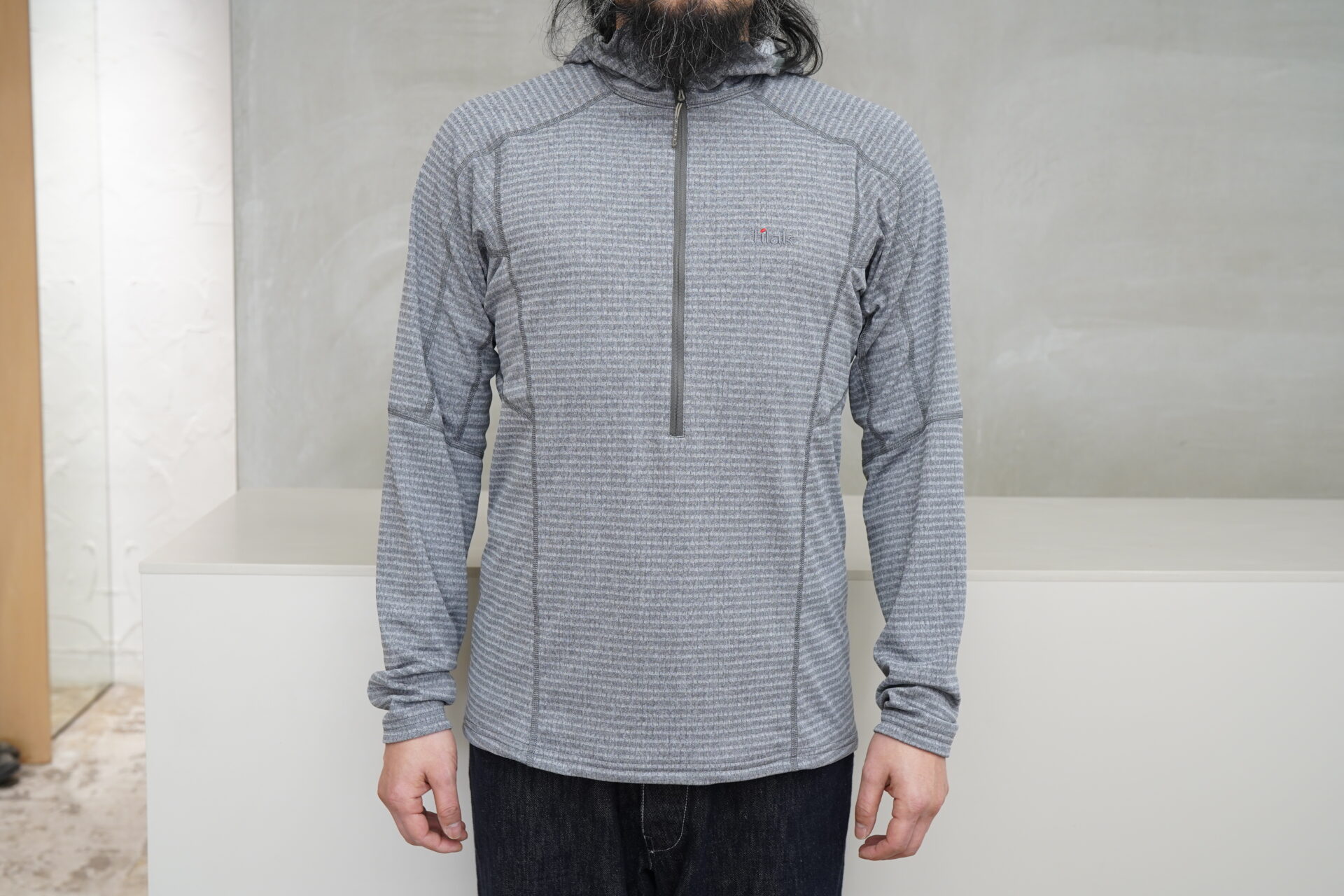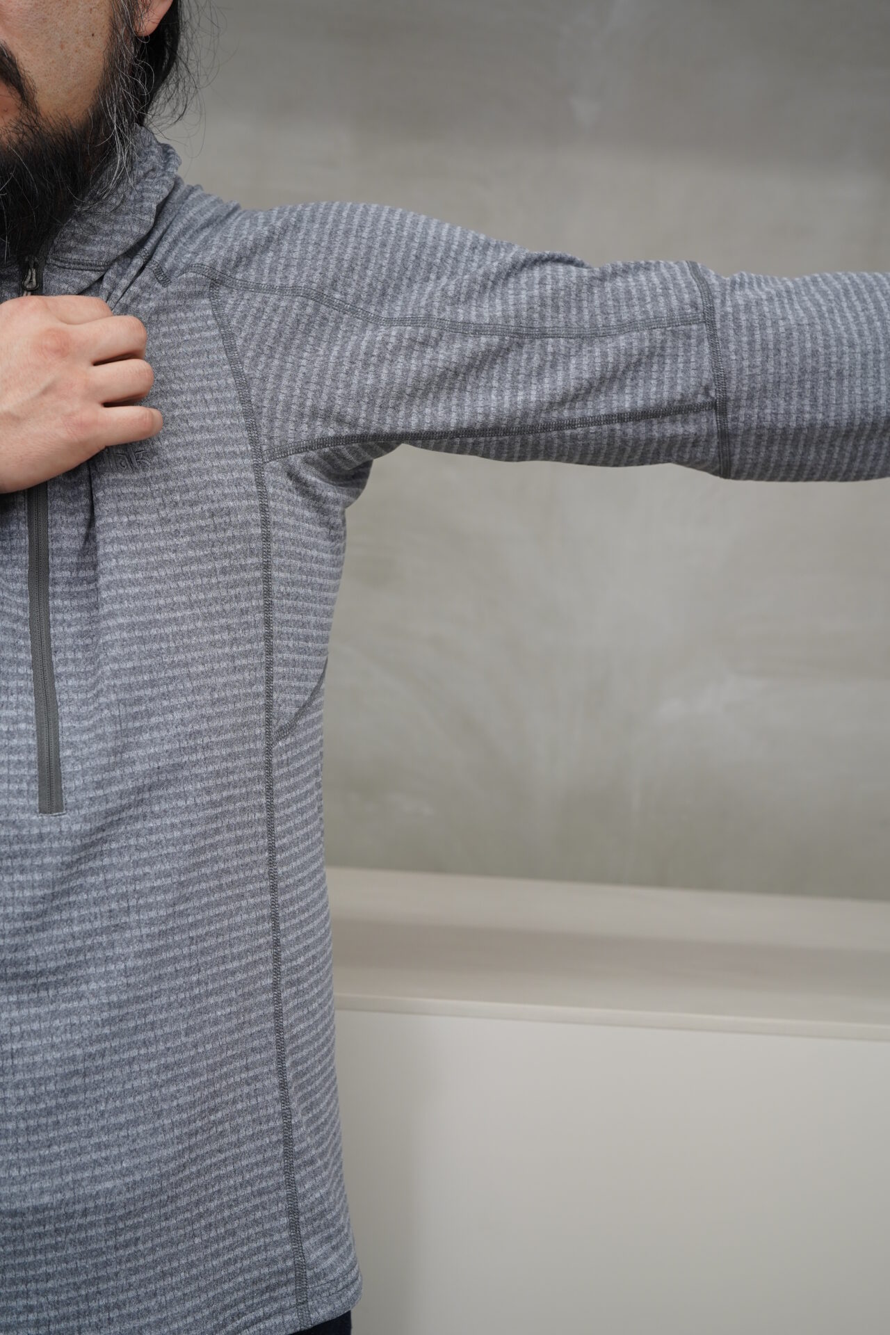 また温度調節は、生地だけでなく深いハーフジップでも行いつつ、さらに脱ぎ着もしやすいという機能も併せ持っています。