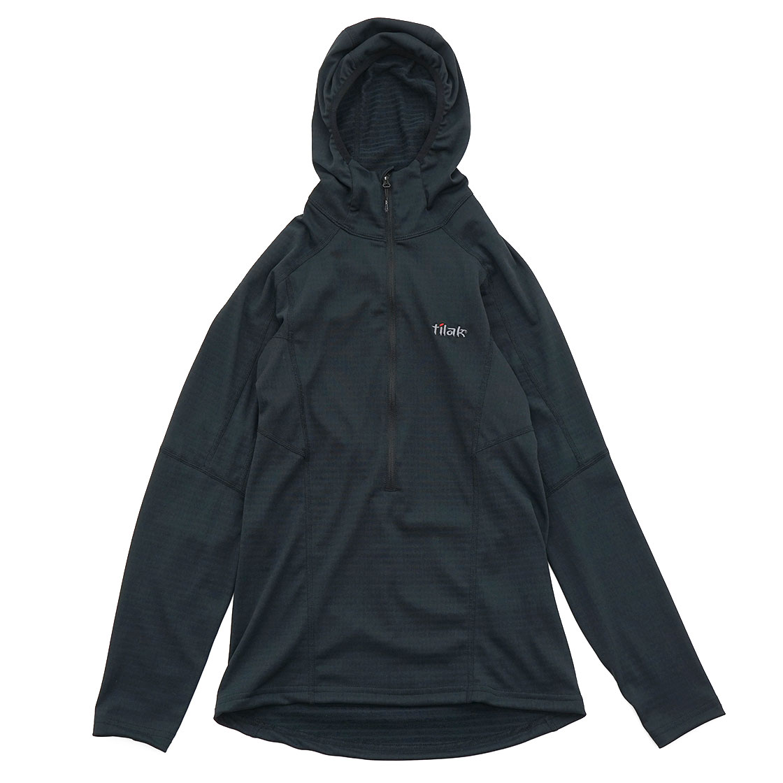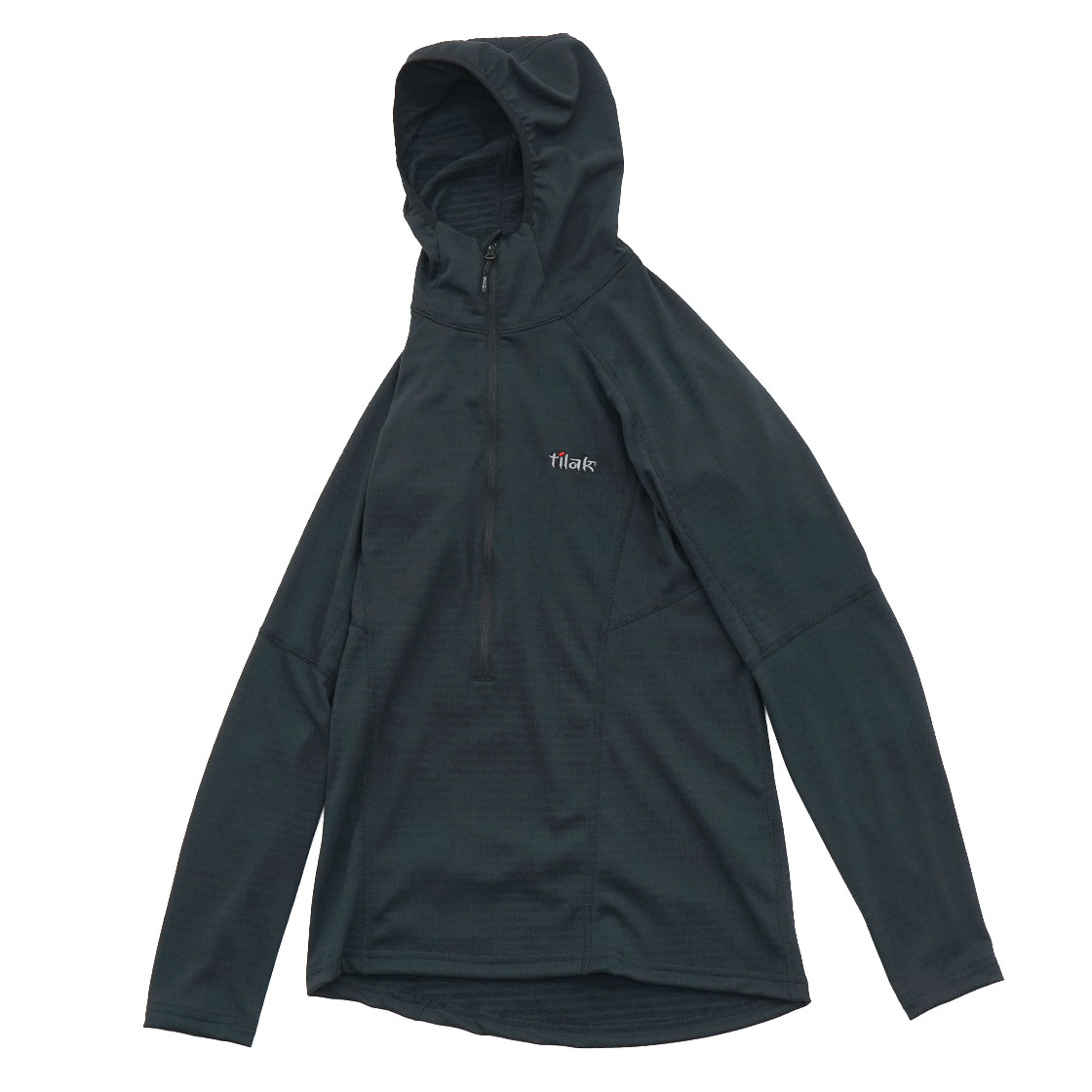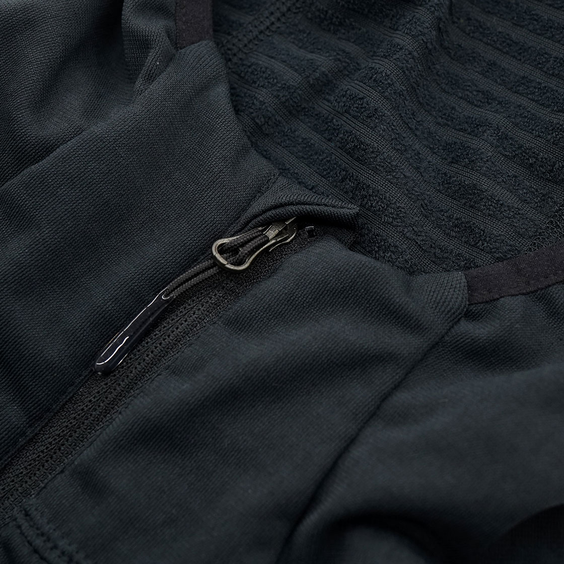 また温度調節は、生地だけでなく深いハーフジップでも行いつつ、さらに脱ぎ着もしやすいという機能も併せ持っています。