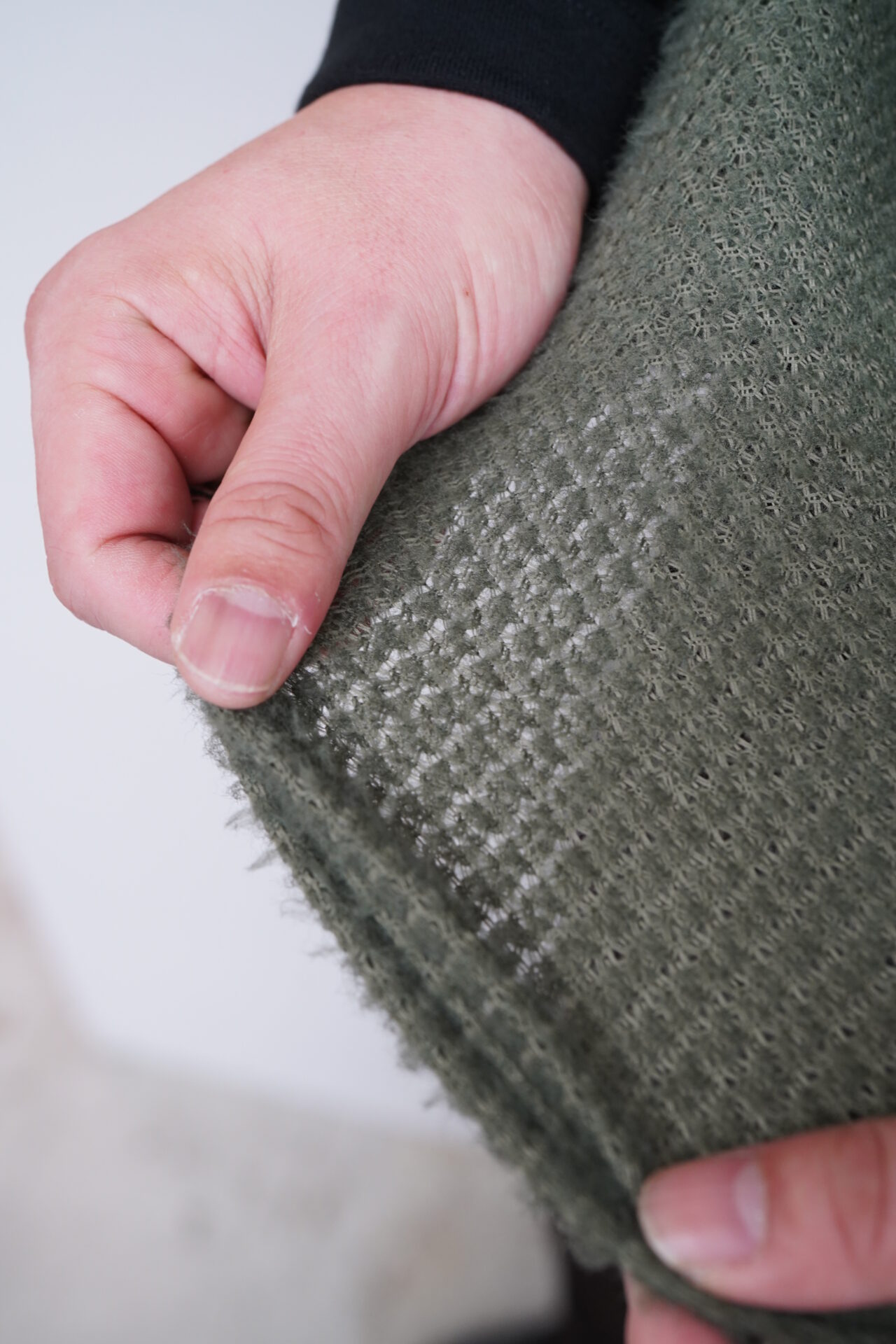 生地をよく見ると、毛足の長い部分と短い部分が格子上に連なった生地となっており、これが通気性を高め蒸れに強い理由です。