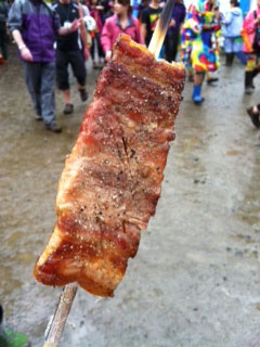 これはフジロック名物「もち豚の串焼き」。ハイネケンと一緒にかぶりつけば昇天します。