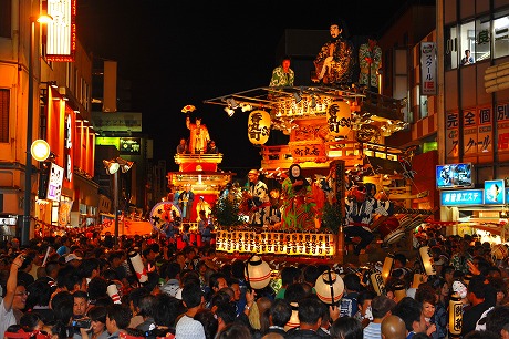 格式高い神輿をはじめとして,絢爛豪華な山車や勇壮な幌獅子など四十数台が市中心部を巡行します。