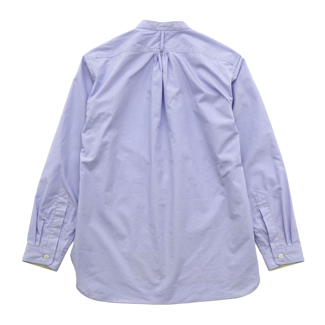 ヨークの前後には、ギャザーを設けふんわりと。第二ボタンは高めに設定しているため、第一ボタンをはずしてもあまり衿が開かないようになっています。裾はマチ付き。