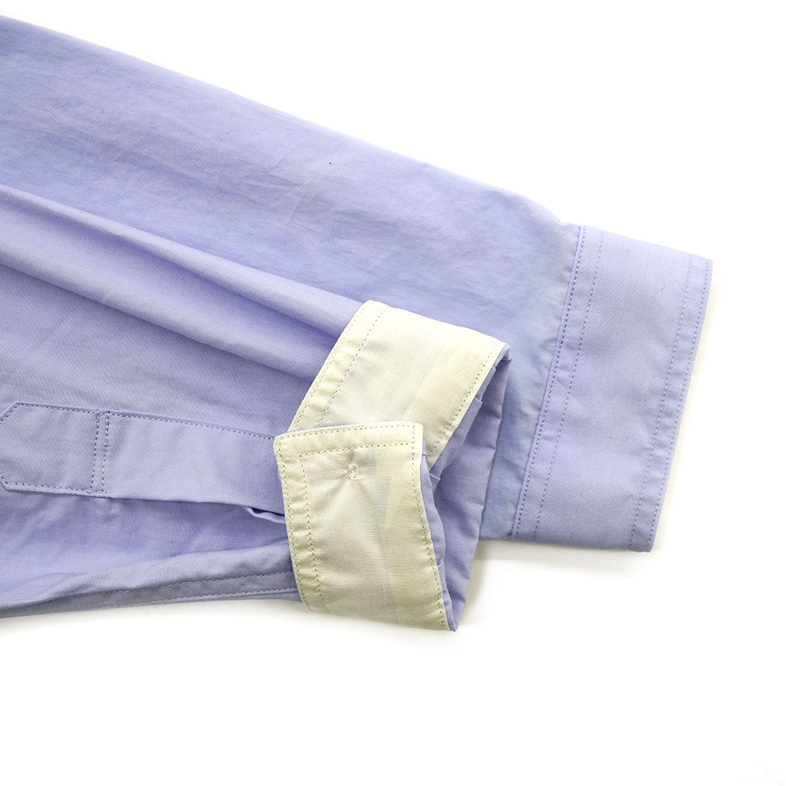 こちらはHandwerkerが定番で作るカラーレスシャツ。デザイナーがイギリス在住時、好んで集めていたカラーレスシャツ。代表的な物ではイギリスのミリタリーシャツや、フランスの古いワークシャツなどがありますが、それらを実際に着て見て研究しデザインされたシャツです。