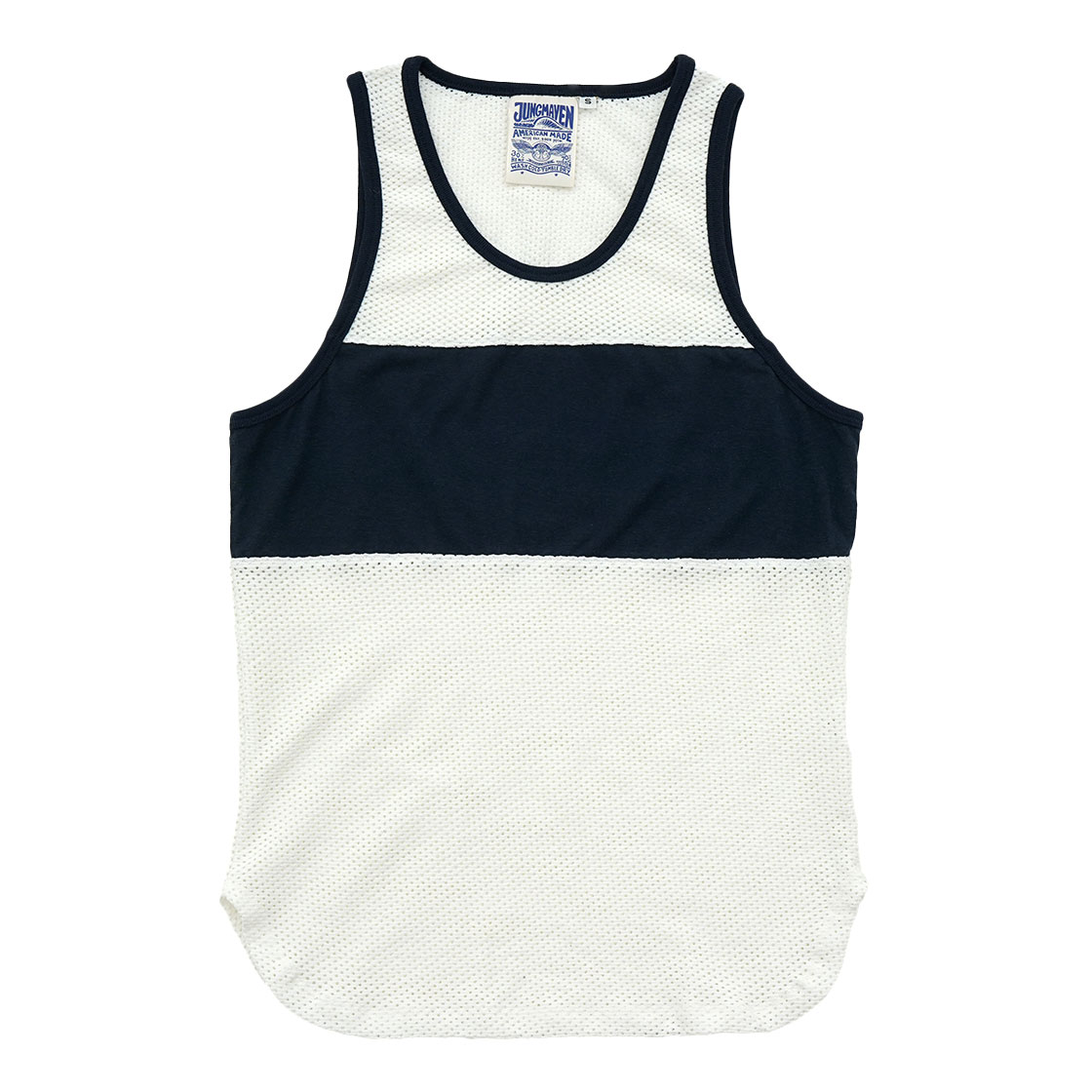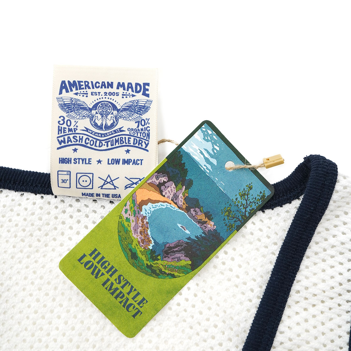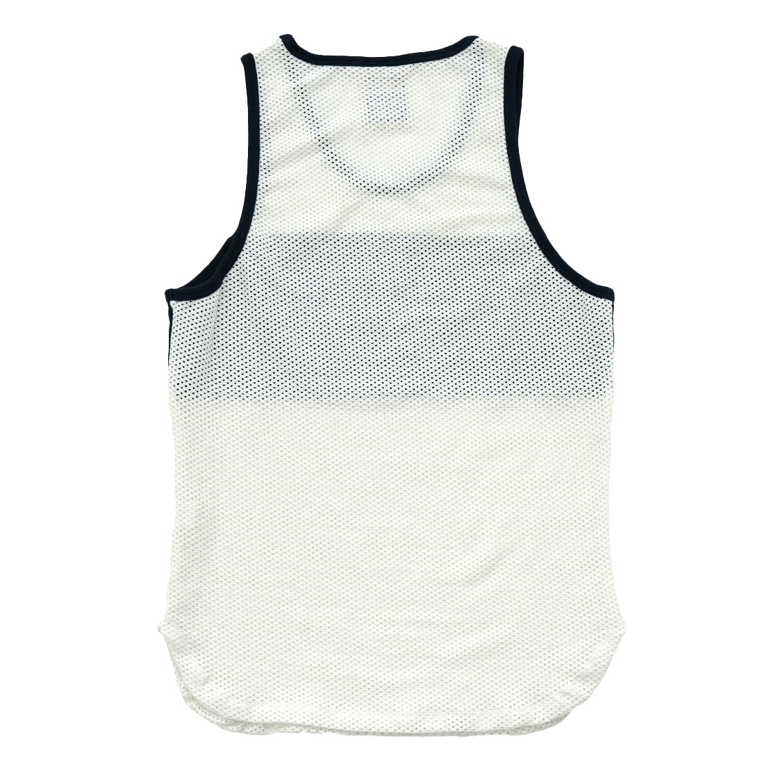 そんな1970年代をイメージしたメッシュのタンクトップです。驚くべきは生地。なんとヘンプとコットンを使用したメッシュ素材。メッシュはなぜナイロン素材しかないのか?という疑問から生まれました。汗をかいた時のベタつき、だんだんと沈着する嫌な臭い、それらを解消するために天然繊維で作ろうとしましたが製作には困難を極め、数か月かけてようやく完成しました。