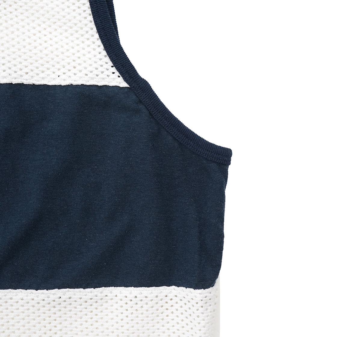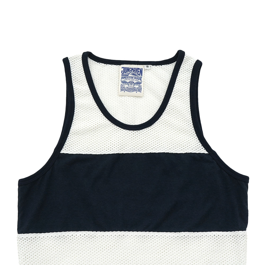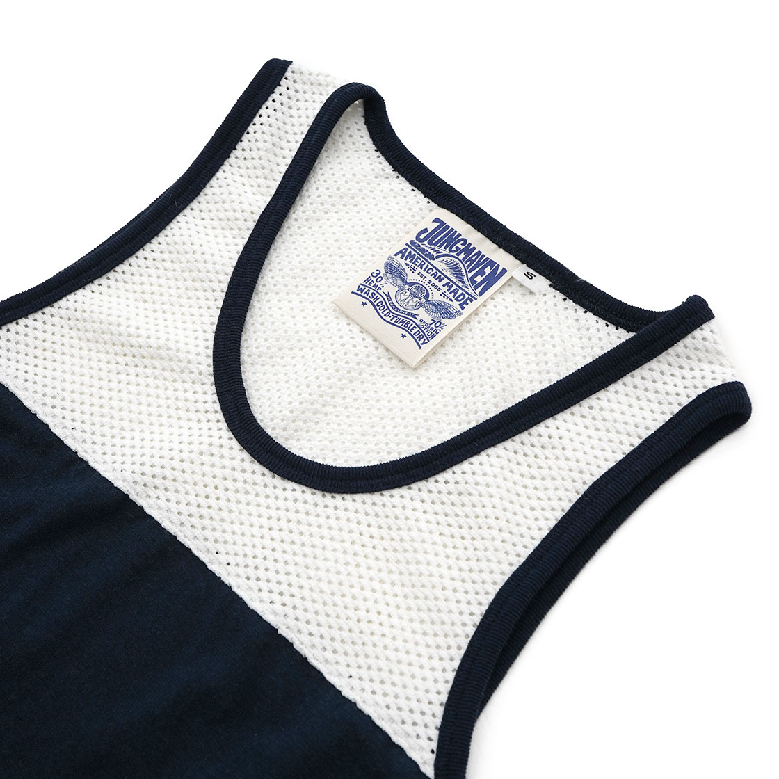 そんな1970年代をイメージしたメッシュのタンクトップです。驚くべきは生地。なんとヘンプとコットンを使用したメッシュ素材。メッシュはなぜナイロン素材しかないのか?という疑問から生まれました。汗をかいた時のベタつき、だんだんと沈着する嫌な臭い、それらを解消するために天然繊維で作ろうとしましたが製作には困難を極め、数か月かけてようやく完成しました。