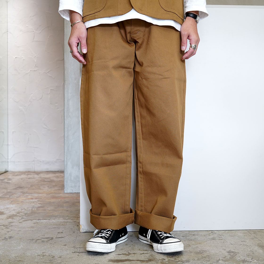 ワイドストレートパンツです。同素材のベルト付き。ギュッと絞ってワンサイズアップ。イギリスの劇作家・ジョーオートンのロングターンナップがお勧めです。