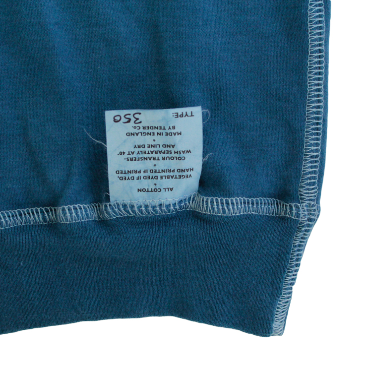 こちらはナチュラルなteeにテンダーおなじみのWoad染めしたもの。染められているため、通常よりも小さめです。寸法をご確認ください。