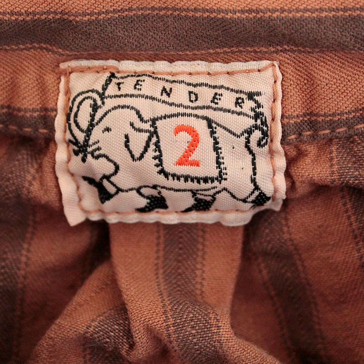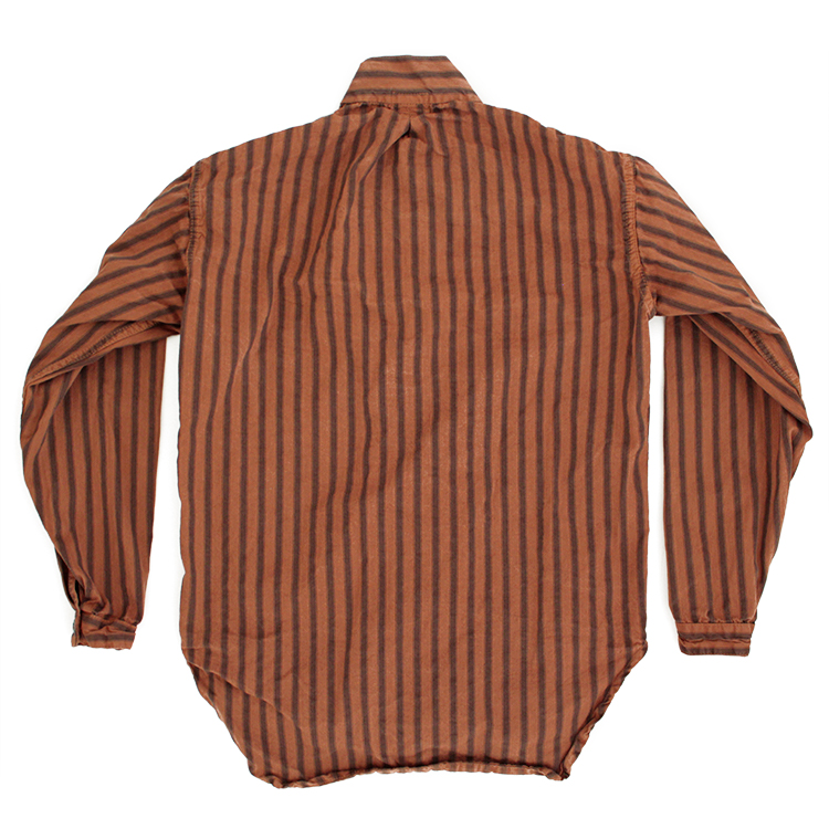 元々の色はヘリンボーン地の青と白のストライプ柄。そのストライプをアカシアで染め上げており、白い部分は赤土色に、青部分は灰色のような独特の色使いに染まっています。