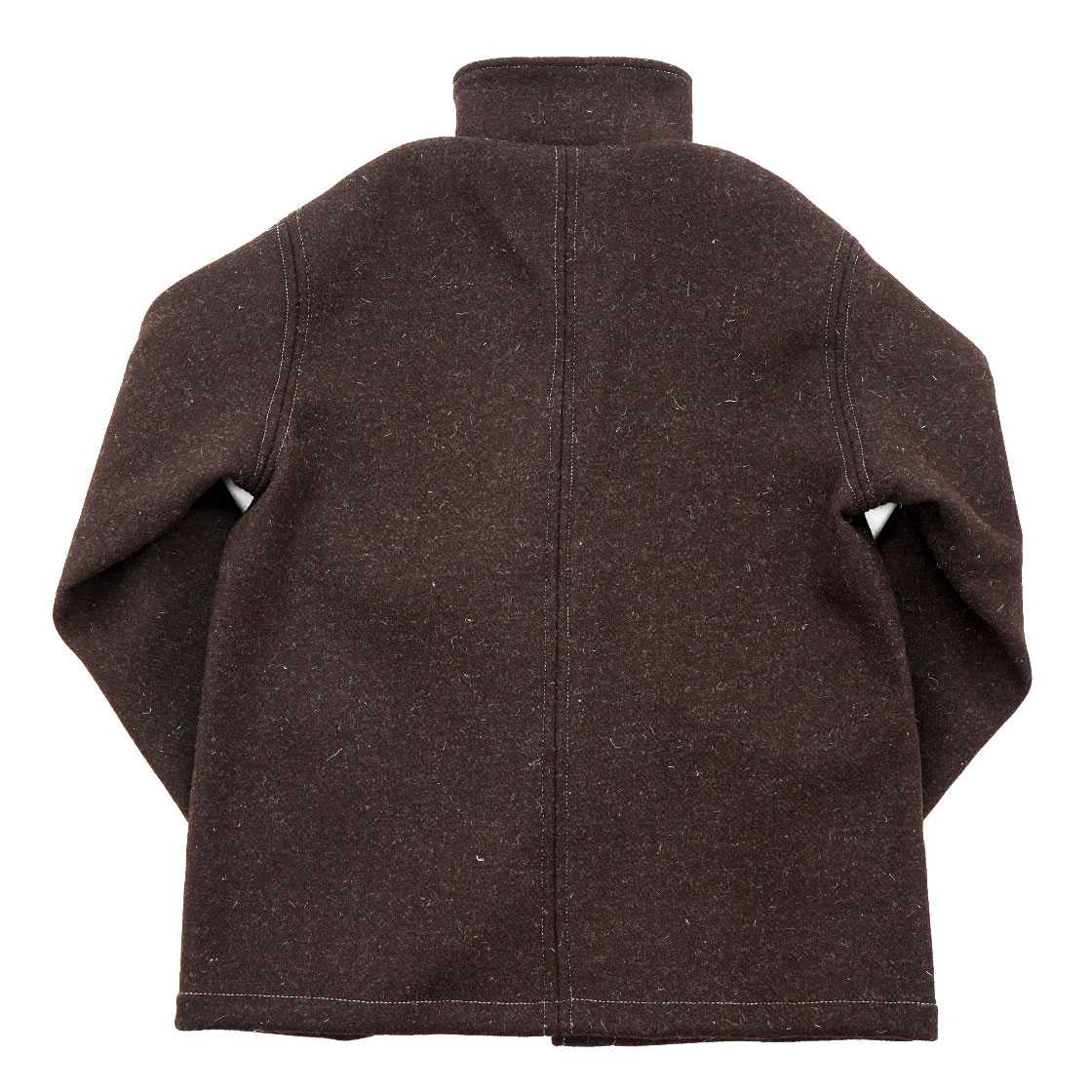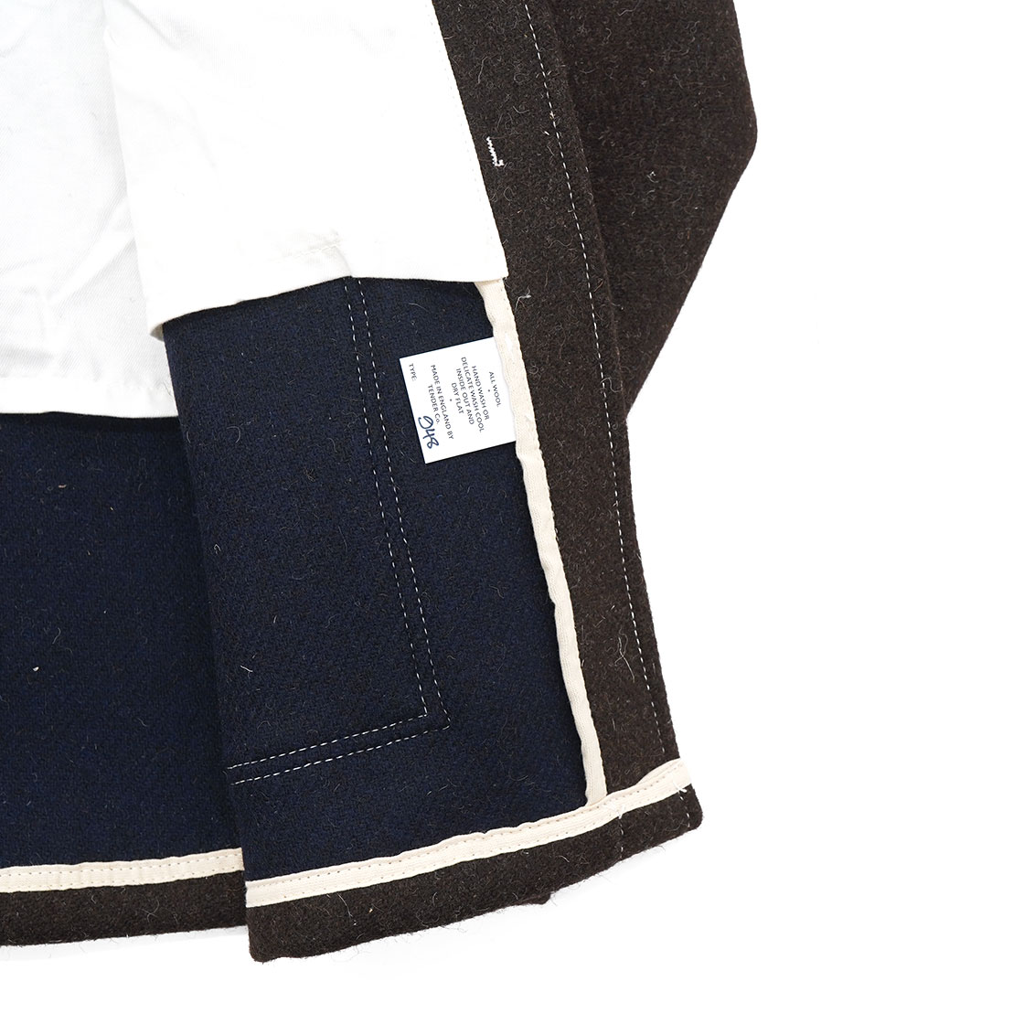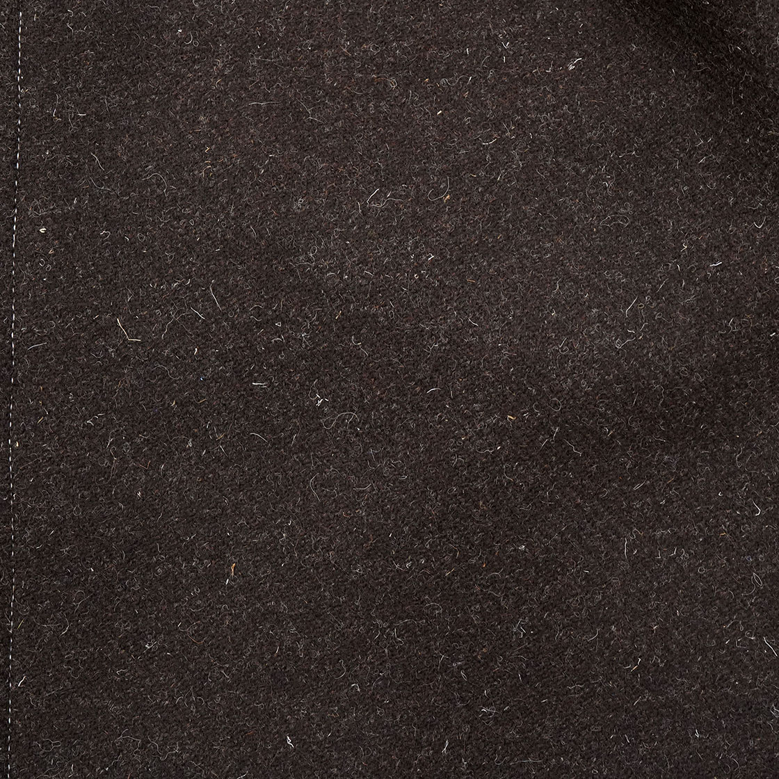 用いる生地は、オリジナルのデッドストックの生地を使用した、「ダブルフェイスジェイコブウールメルトン」というもの。そのため数量限定アイテム。ヨークシャーで織られており、二種類の異なるメルトン生地を織り合わせた構造です。片面は斑模様のネイビーとミッドナイトブルー、もう片面は天然の未染色ジェイコブ羊毛となっています。キリストの十二使徒の一人・ジェイコブ(=ヤコブ)という名のつくこの羊の起源は古く、旧約聖書の「創世記」に登場するヤコブの羊がその祖先だとされています。17世紀に英国で品種として確立されました。毛足が長く丈夫なのが特徴です。