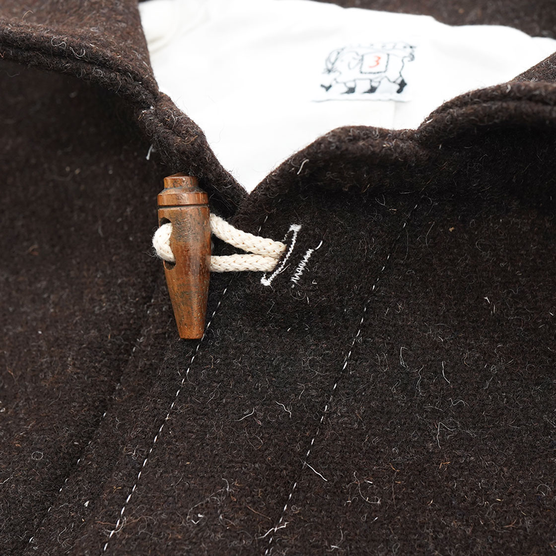 ダッフルコートといえばのトグルボタンは、なんとマホガニー材。マホガニー材は、深みのある美しい赤褐色と、光の当たり方で表情を変えるリボン杢が特徴で、古くから高級家具や楽器などに使われてきました。しかしマホガニーは、歴史的な乱伐や違法伐採により資源が枯渇したため、現在ではワシントン条約(絶滅のおそれのある野生動植物の種の国際取引に関する条約)によって、天然木の国際取引が厳しく制限されています。ではこのトグルで使用されているマホガニー材はどこから持ってきたのかというと、なんと古い家具等から削り出したものになります。このトグルはFSC認証マホガニー材となり、回収された材料のみを100%使用したマホガニー製品を指します。これは、新たな木材を一切使用せず、使用済み製品などから得られた再生材で製造されるため、資源の循環利用を促進し環境保護に貢献するというものです。