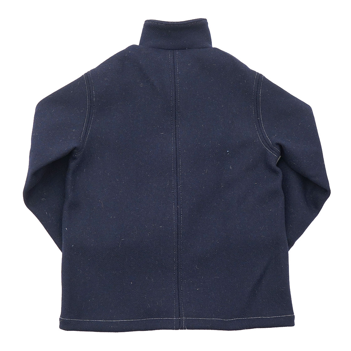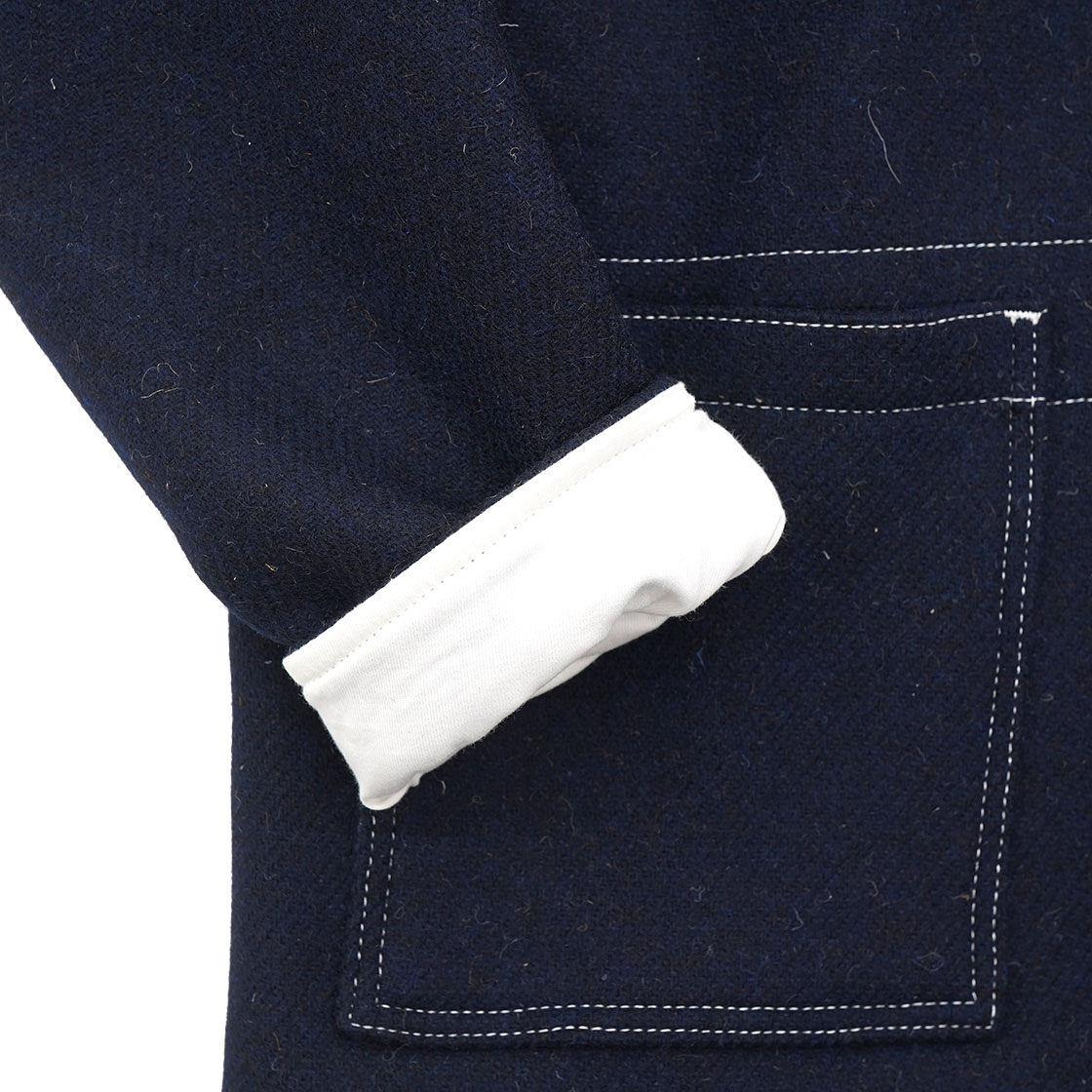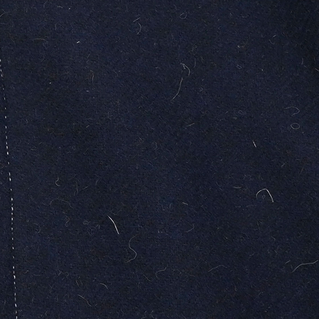 用いる生地は、オリジナルのデッドストックの生地を使用した、「ダブルフェイスジェイコブウールメルトン」というもの。そのため数量限定アイテム。ヨークシャーで織られており、二種類の異なるメルトン生地を織り合わせた構造です。片面は斑模様のネイビーとミッドナイトブルー、もう片面は天然の未染色ジェイコブ羊毛となっています。キリストの十二使徒の一人・ジェイコブ(=ヤコブ)という名のつくこの羊の起源は古く、旧約聖書の「創世記」に登場するヤコブの羊がその祖先だとされています。17世紀に英国で品種として確立されました。毛足が長く丈夫なのが特徴です。