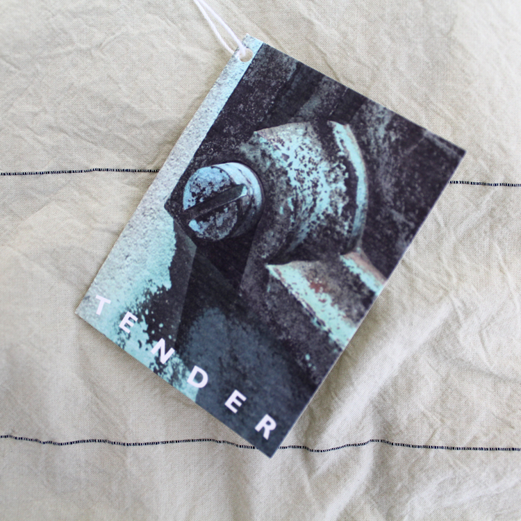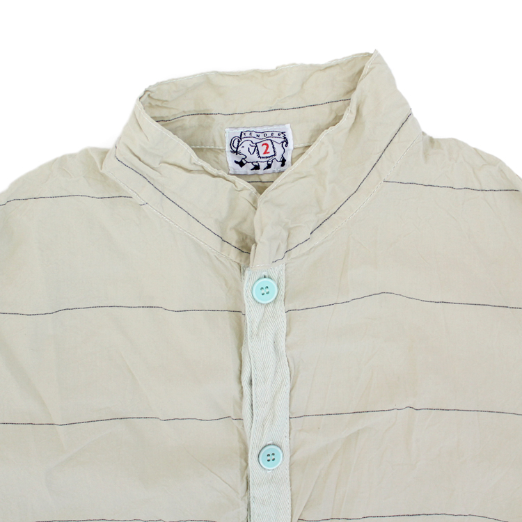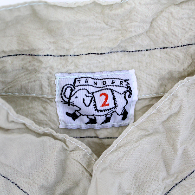今季のカラーである緑青(りょくしょう)染め。銅から抽出されたターコイズカラーが特徴です。今季のシャツはTesseract(4次元立方体)と名付けられ、生地を折り紙のように折りポケットを作っています。後ろのシルエットはTENDER Co.定番のテールシャツのように長くなっています。2018年春夏発表の新型のシャツ。