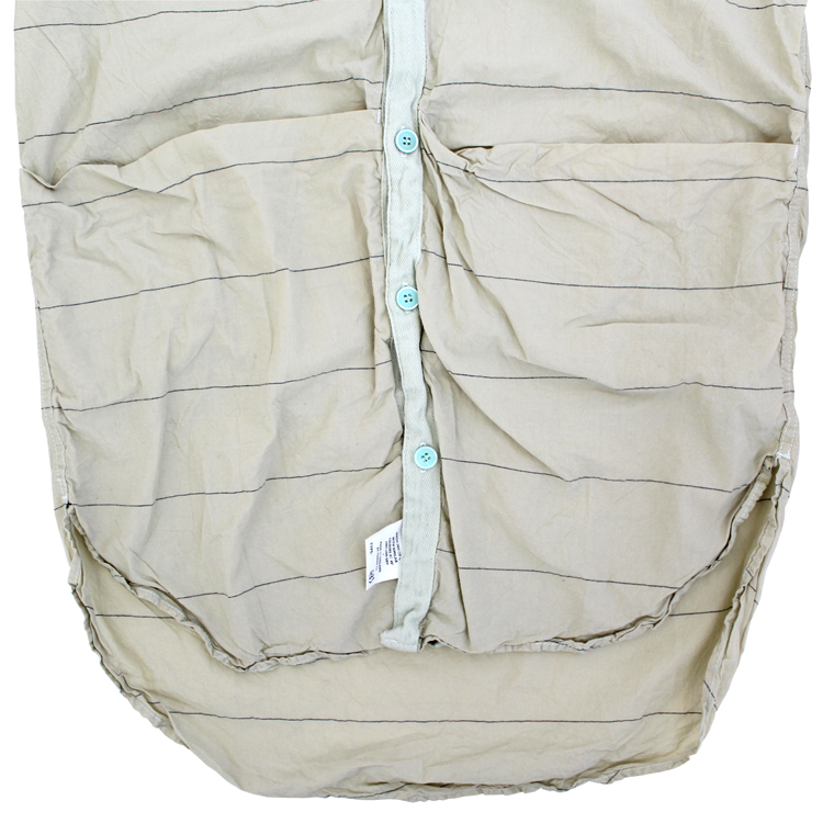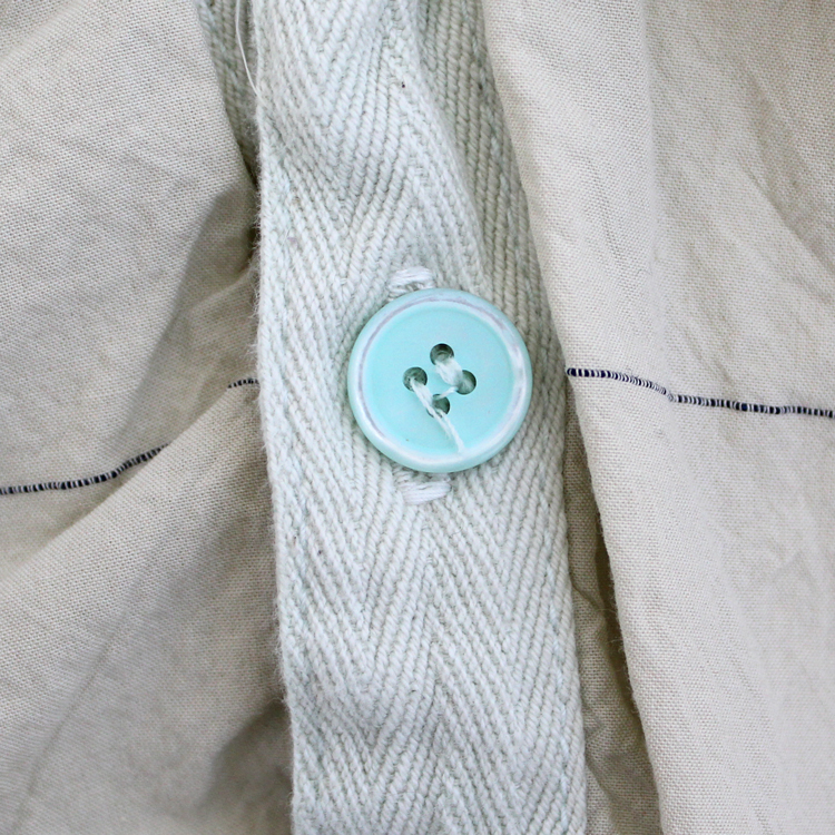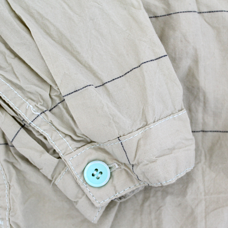 ボタンは貝ボタン。ボタンも錆染め。ボタン補強の為、コットンヘリンボーン生地を当てています。生地は洗いと染めにより縮んでいるため、縫い目にパッカリングが見られます。着ていくうちにより風合いが増すことでしょう。