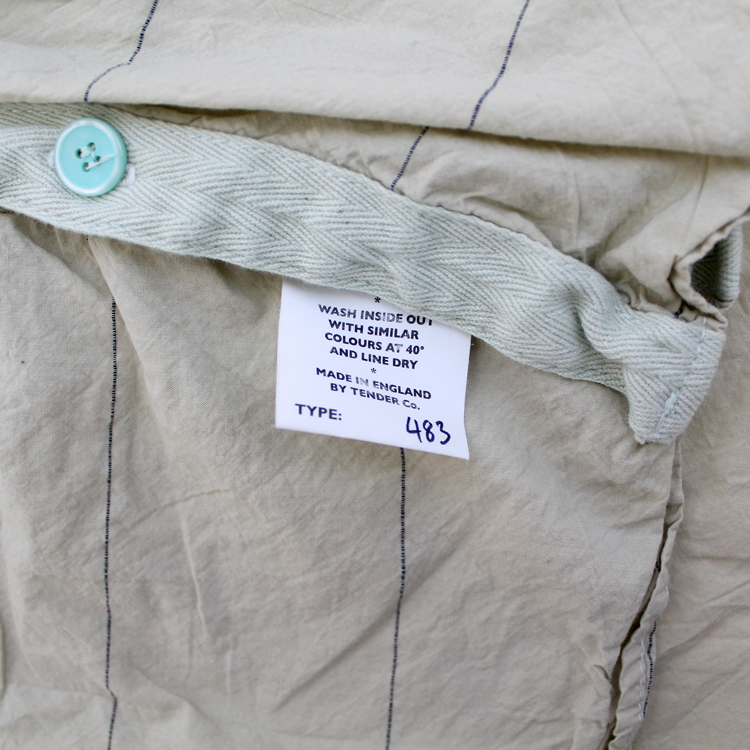 生地をよく見るとボーダーのようになっています。イギリスでロープ染めしたインディゴコットンを等間隔で配置し、ボーダー柄を表現しています。