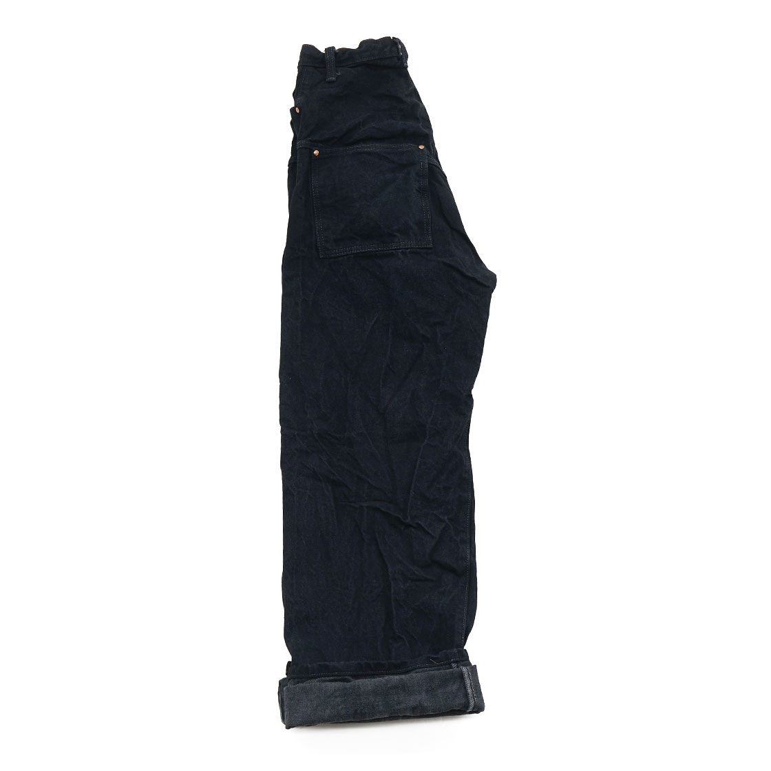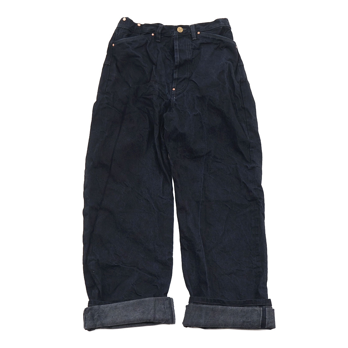 ウェーダージーンズと名付けられたこのパンツは、釣り用の胴長靴・ウェーダーから着想を得てデザインされました。そのためとんでもなく深い股上が特長です。スーパーハイウエストで穿いてもいいですし、ウエストの位置を落とすとサルエルパンツのようなシルエットで穿くこともできます。バックポケットは、見た目は低い位置に付いているように見えますが、股上が異常に深いために下の方に付いているように見えるだけです。