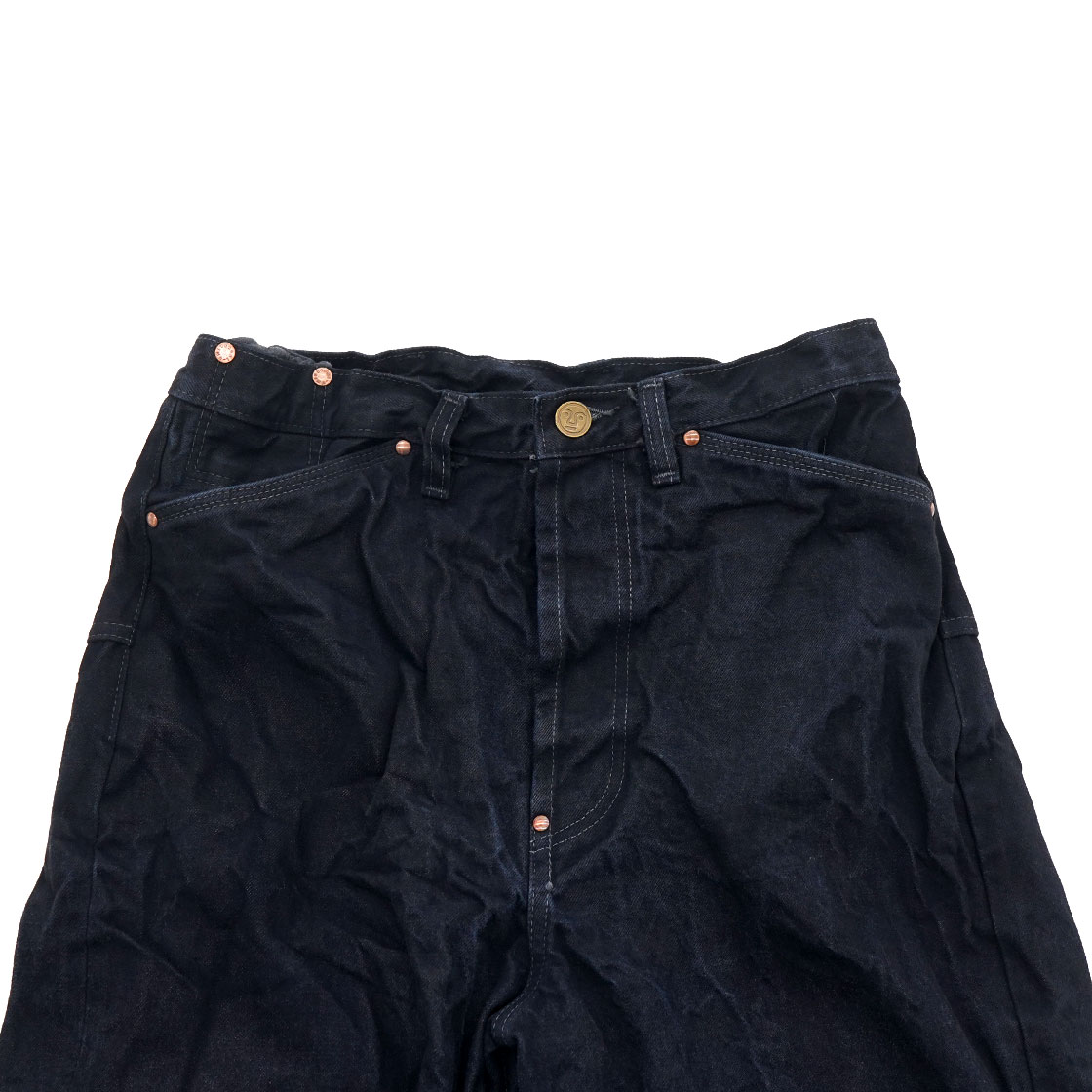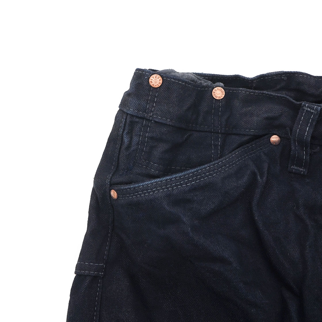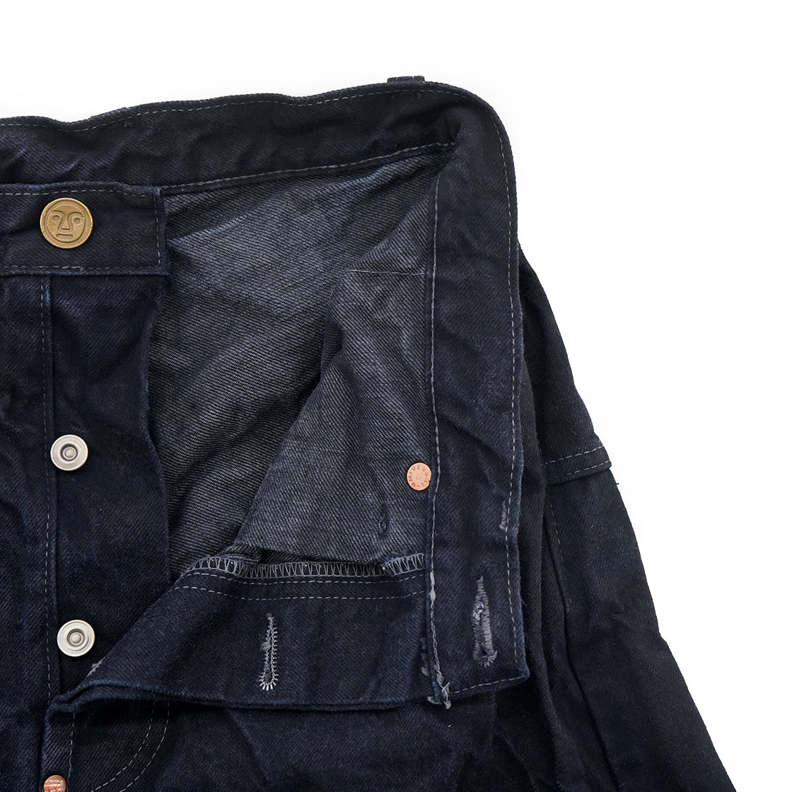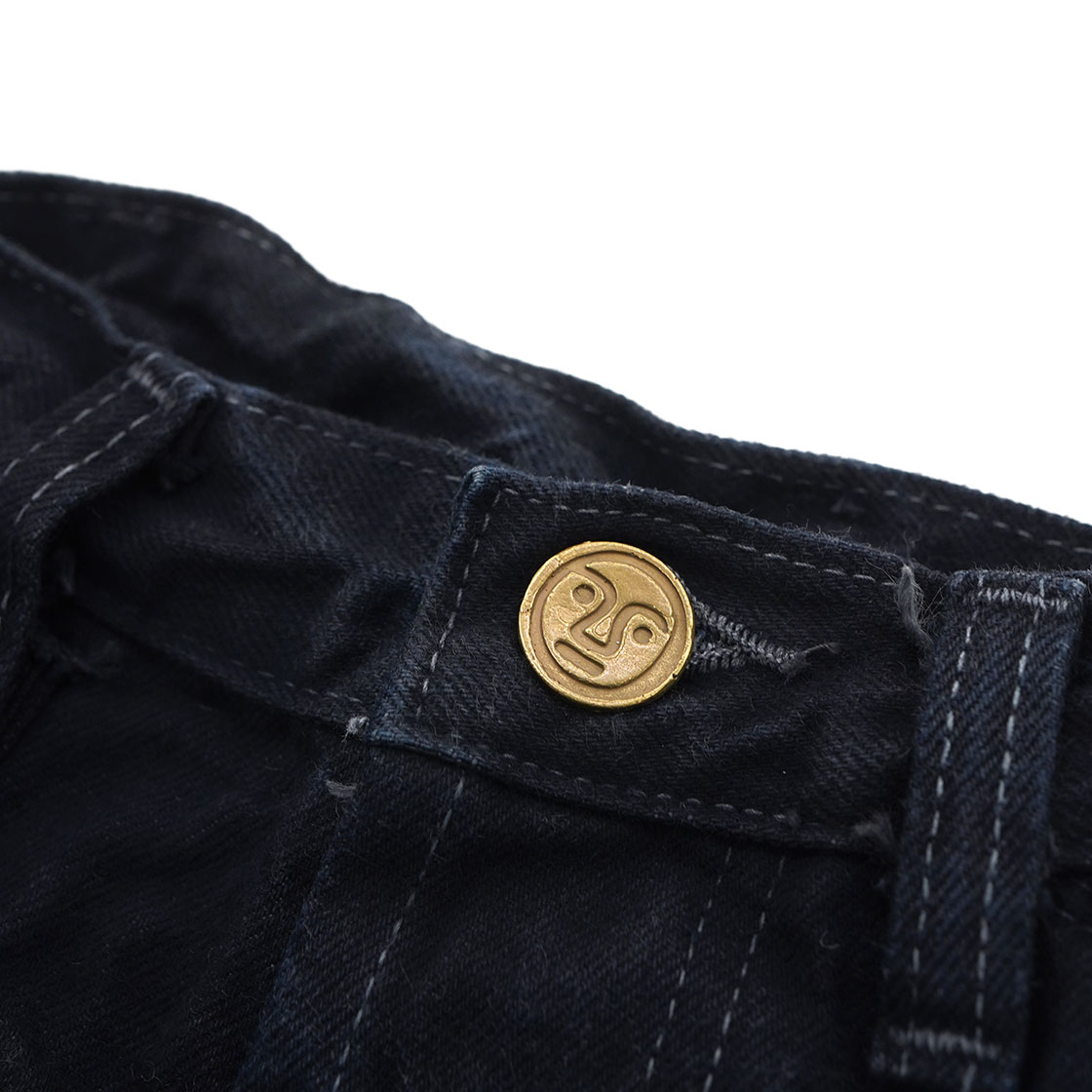 またポケットの袋も、通常はスレキという薄い生地を使用していますが、これもデニムを使用し強度を高め、さらにポケットの底にもミミがあしらわれています。ボタンフライのトップボタンには、オリジナルのチェンジボタンを使用。