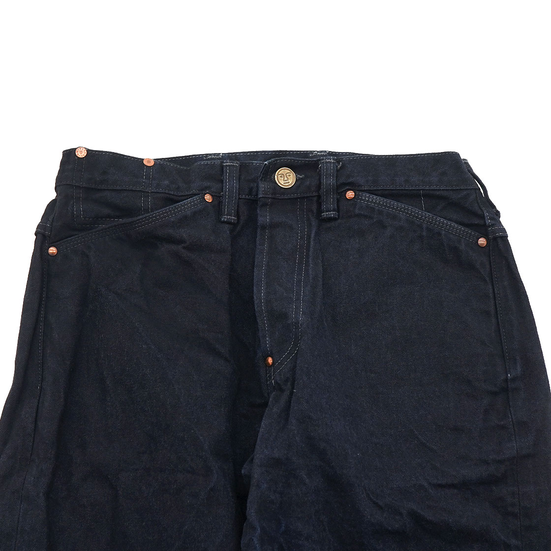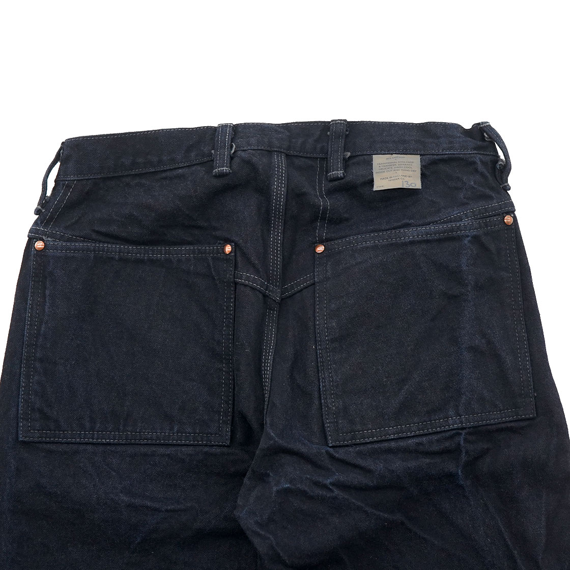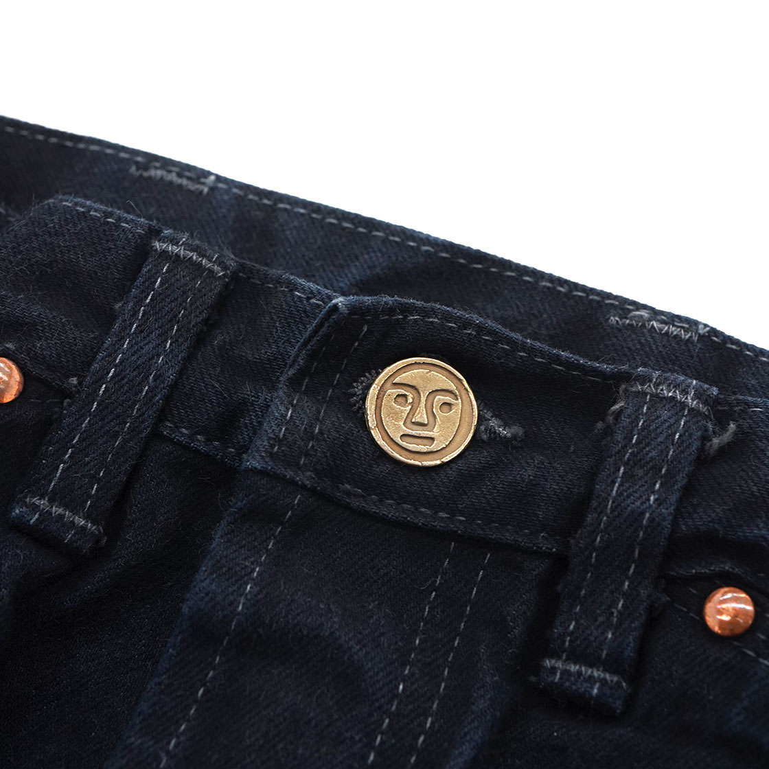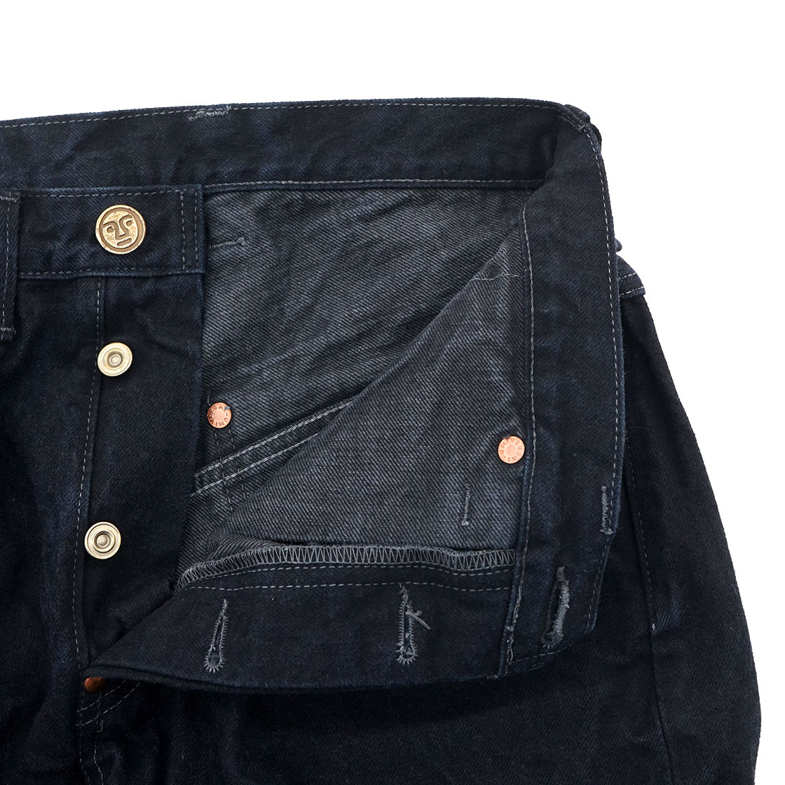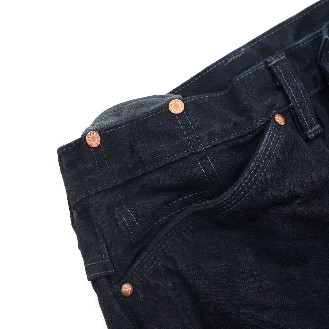 またポケットの袋も、通常はスレキという薄い生地を使用していますが、これもデニムを使用し強度を高め、さらにポケットの底にもミミがあしらわれています。ボタンフライのトップボタンには、オリジナルのチェンジボタンを使用。