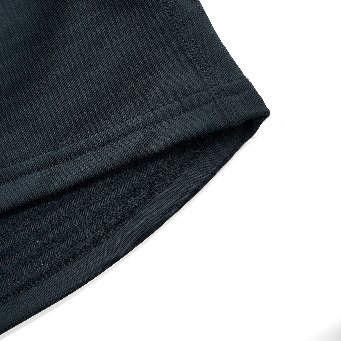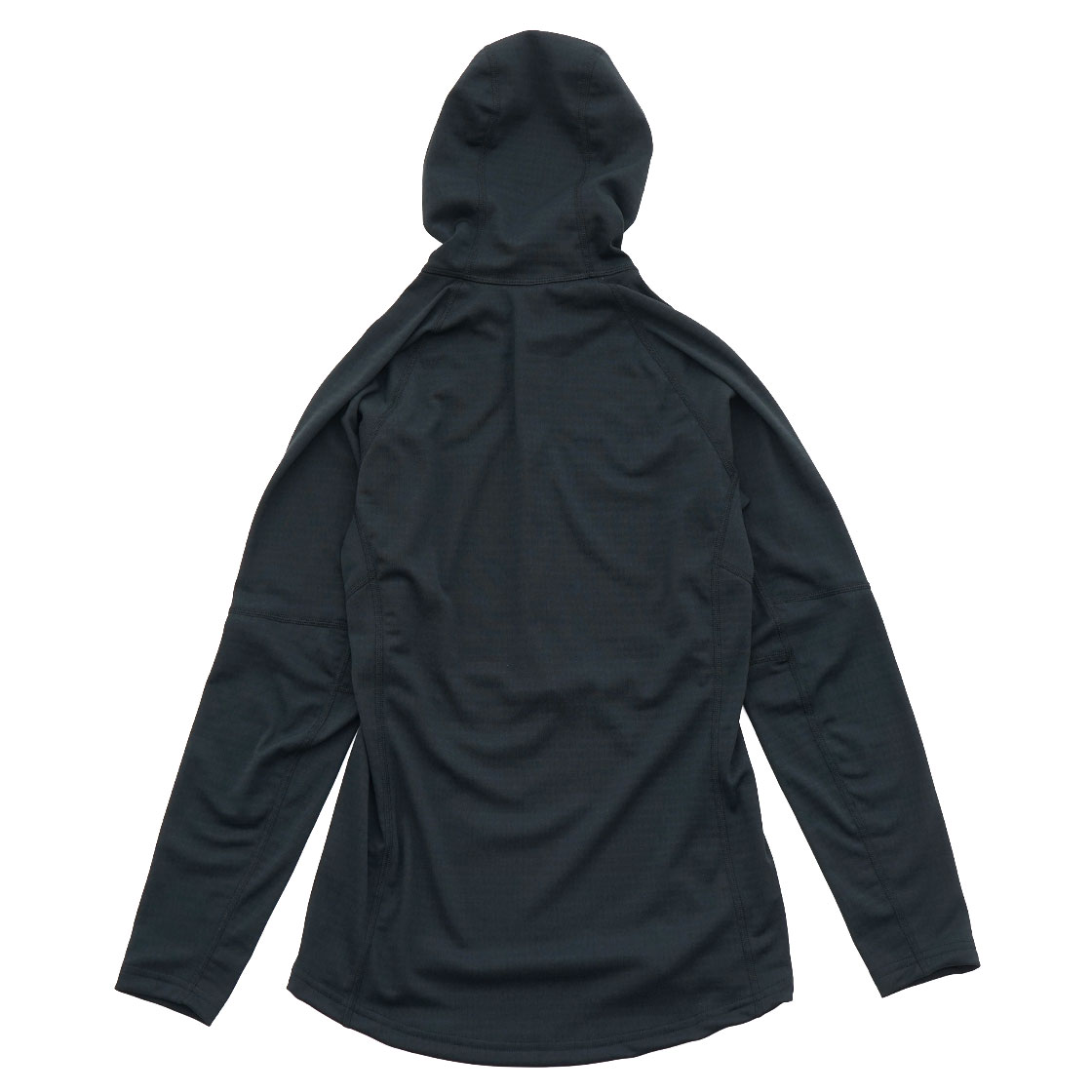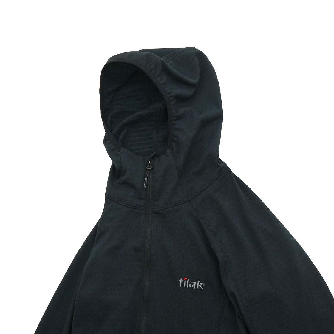 深いハーフジップで、さらに体温調節もしやすく、また着脱もスムーズに。縫製はフラットシームで、縫い目のごろつきはほとんどございません。フードの使い方がポイントで、半袖Tシャツや長袖シャツ、スウェットなど上に着る物はなんでもOK。寒い日はイヤーマフのように使用することもできます。