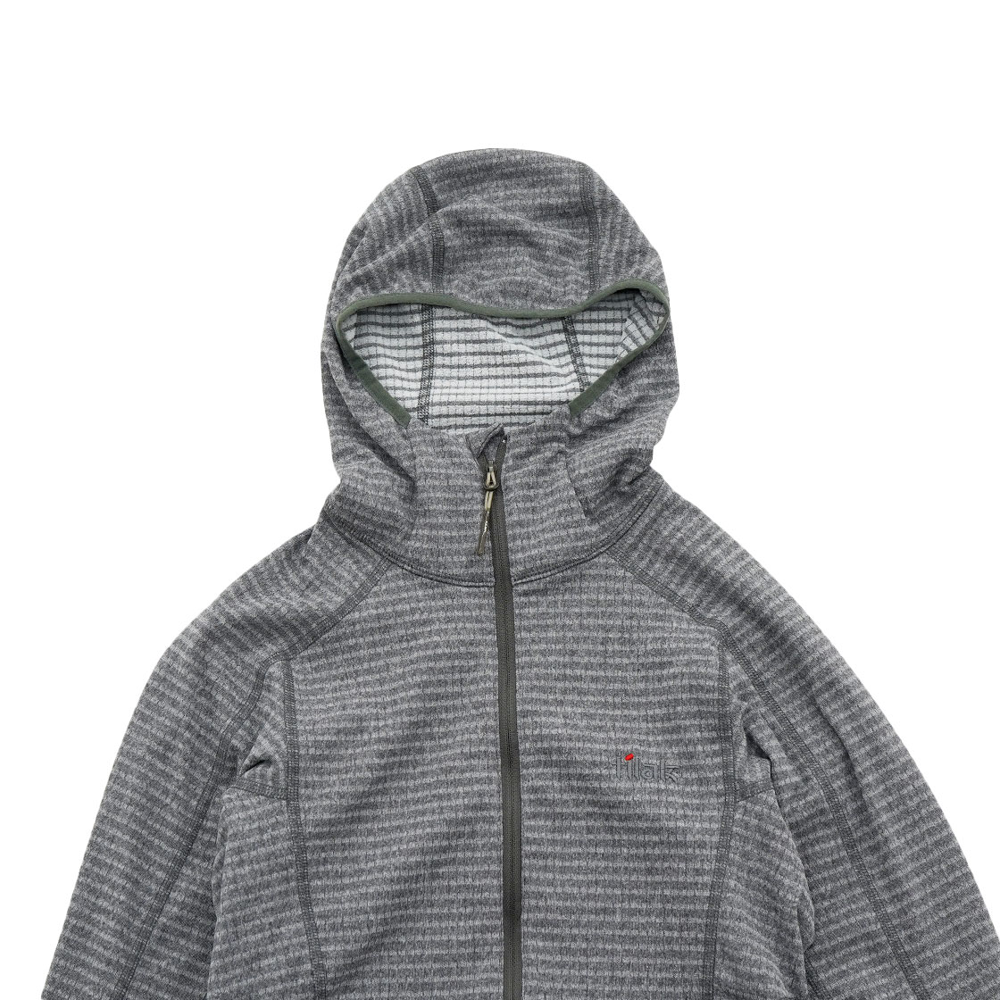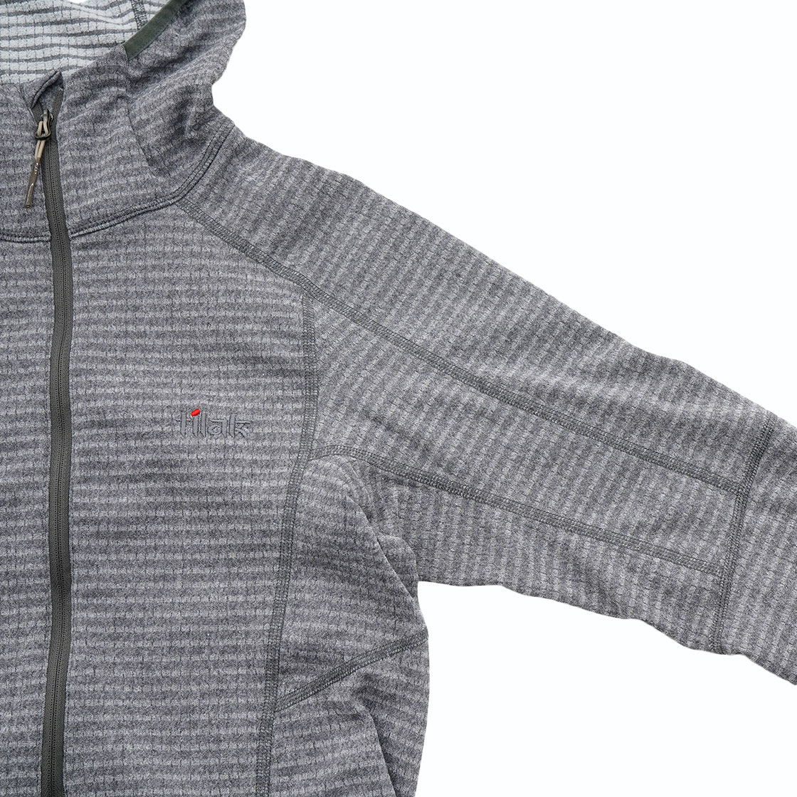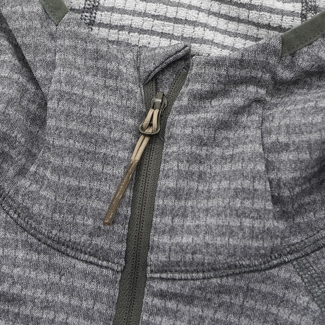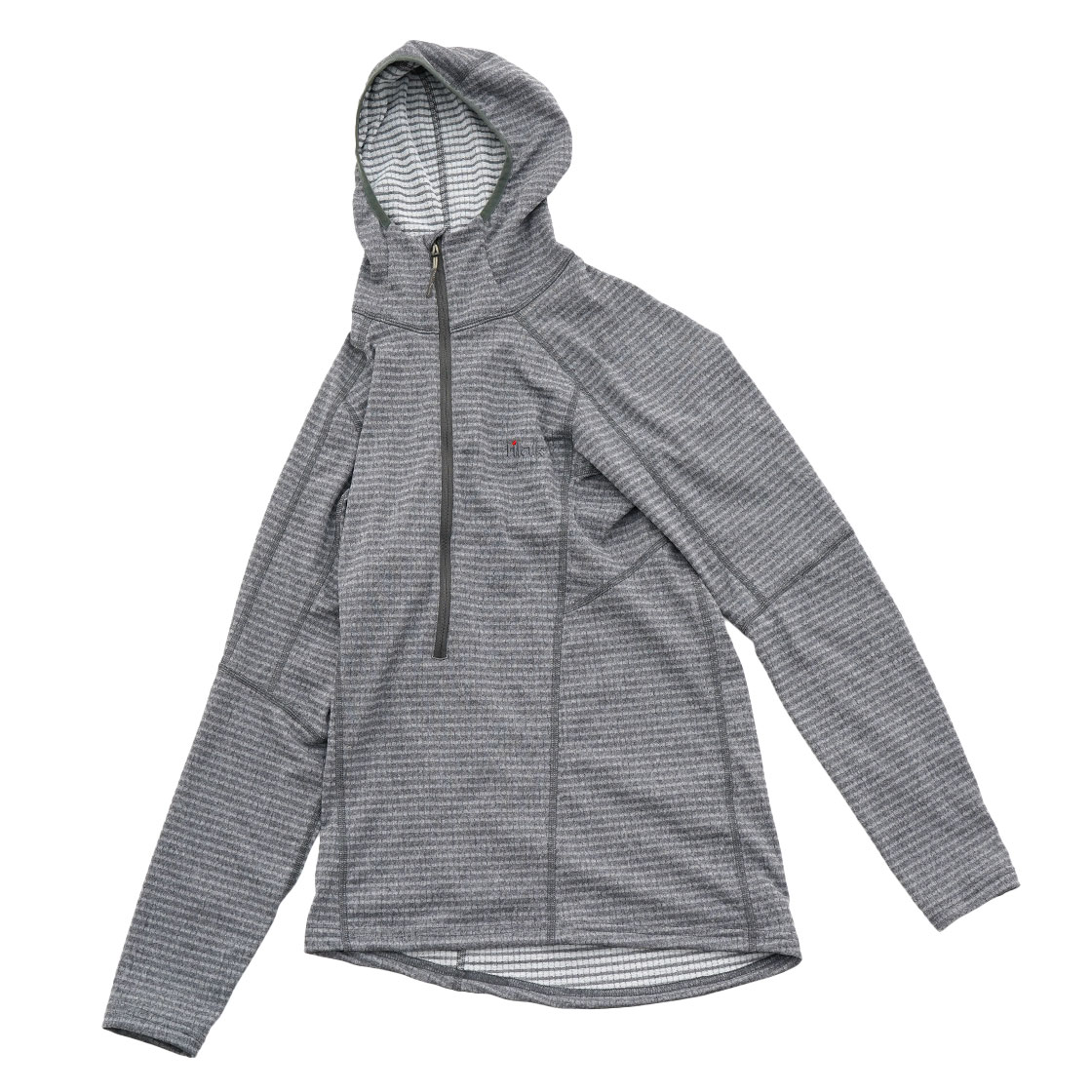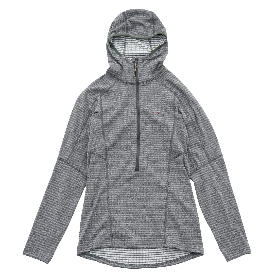 深いハーフジップで、さらに体温調節もしやすく、また着脱もスムーズに。縫製はフラットシームで、縫い目のごろつきはほとんどございません。フードの使い方がポイントで、半袖Tシャツや長袖シャツ、スウェットなど上に着る物はなんでもOK。寒い日はイヤーマフのように使用することもできます。