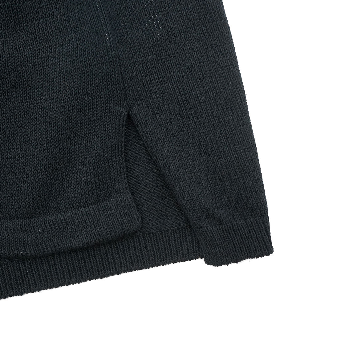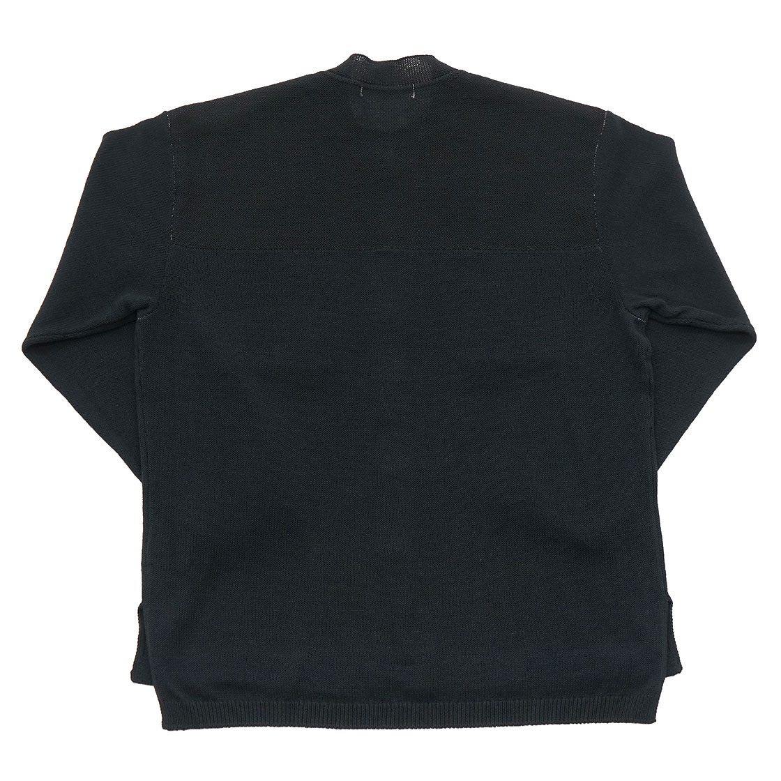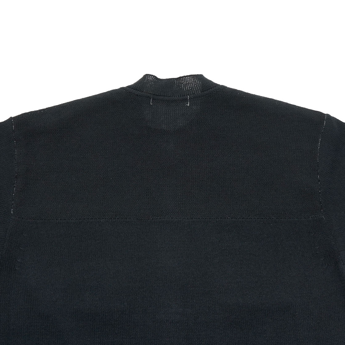 形は定番のバンドカラーシャツを踏襲したカーディガン。そのため、よくみるとシャツのサイドプリーツが入る部分に、ニットの減ら目を行っているという、細かすぎるデザイン。