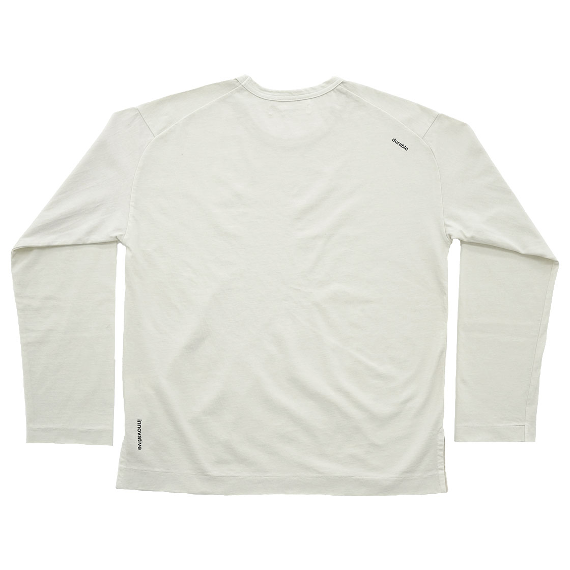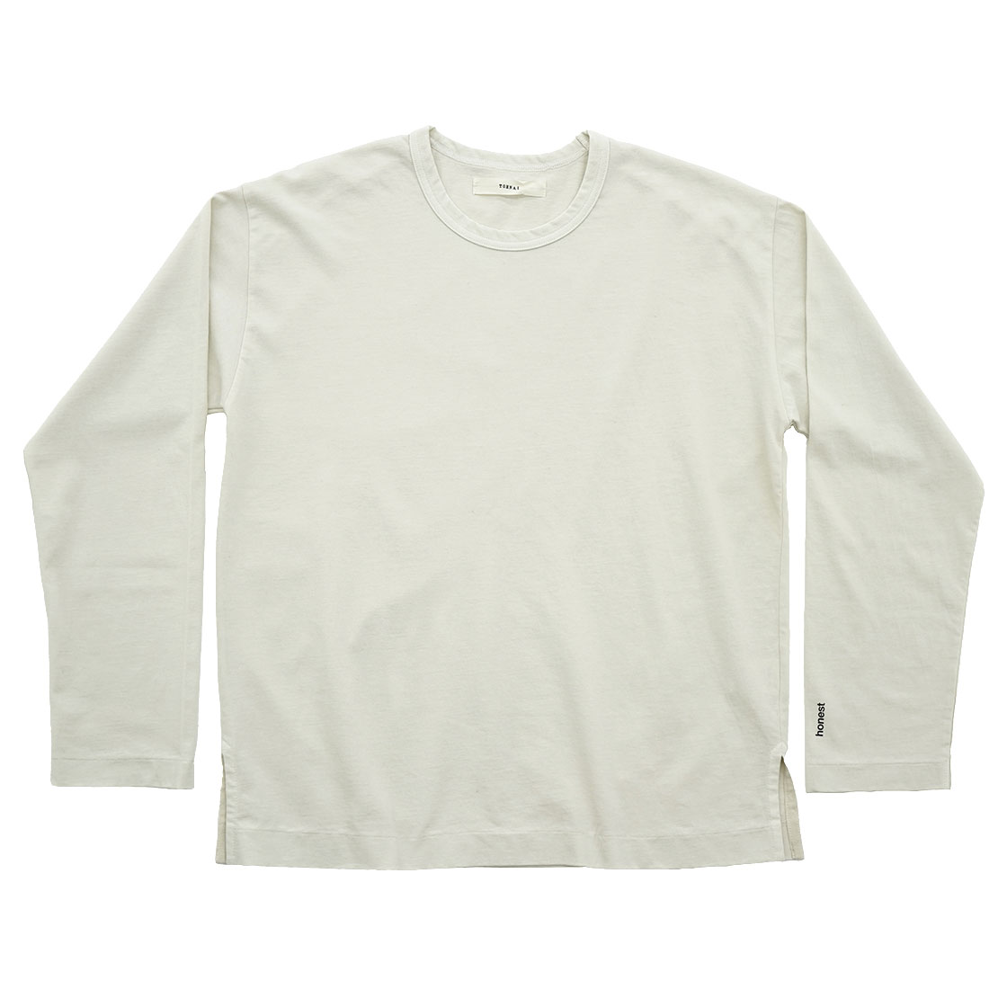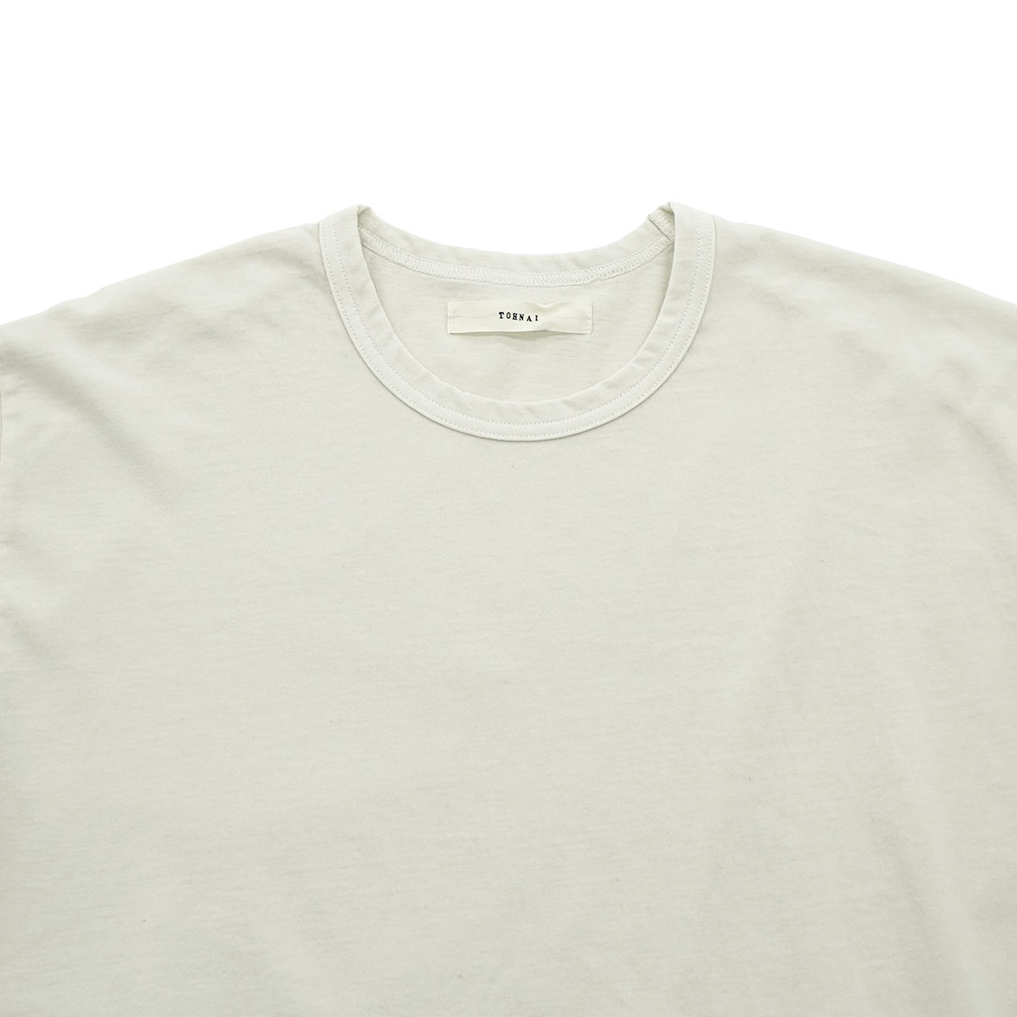定番となったTOHNAIのTシャツから、ロングスリーブバージョンが登場。肩回りのパターンが特徴で、セーターが好きな方なら見たことある構造だと思います。この形は、手横編み機の肩減らしを参考にしつつ、Tシャツでやってみたという面白いデザイン。