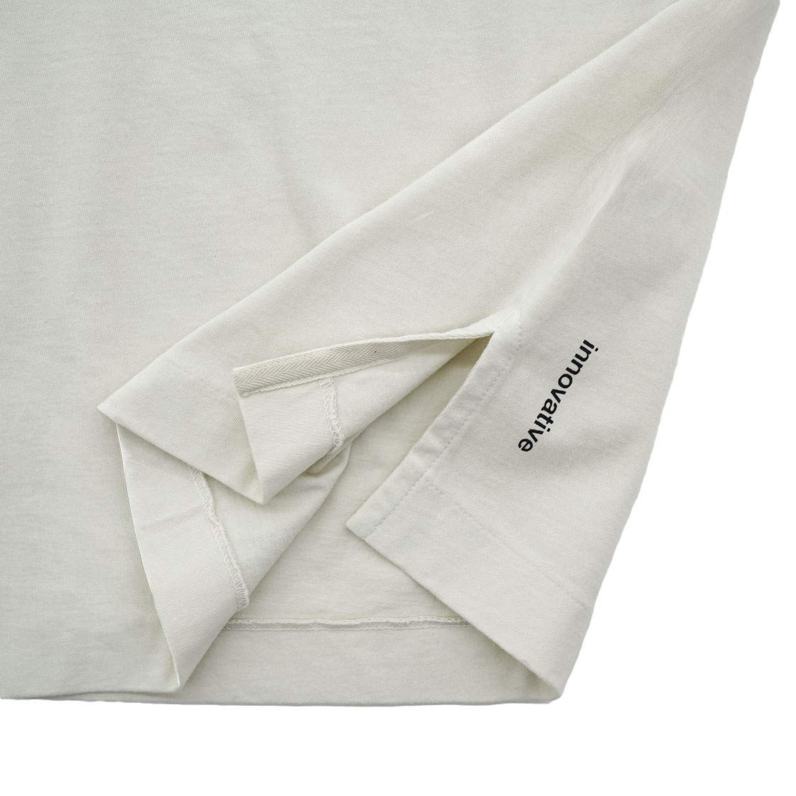 生地は、40番単糸の強撚糸を2本引き揃え、斜行感が出るように編んでいます。いつも通り度目を詰めて編んでいるのですが、強撚単糸の斜行が程よいヤレ感とシャリっとした肌触りを両立させており、クセになる着心地。この絶妙な生地は、特殊な編機とそれを調整できる職人の技術があるからこそ成立します。