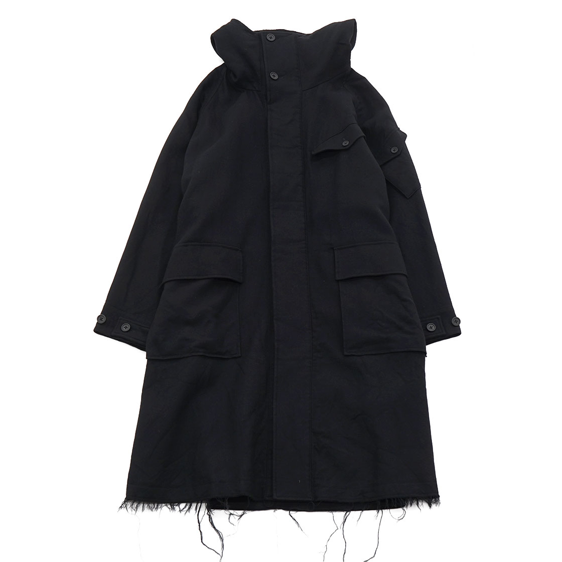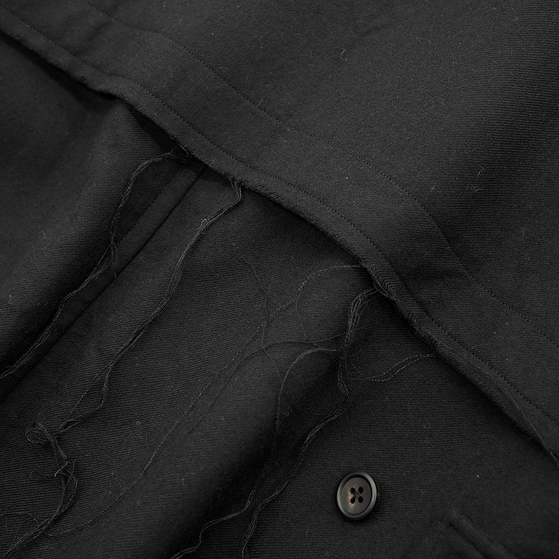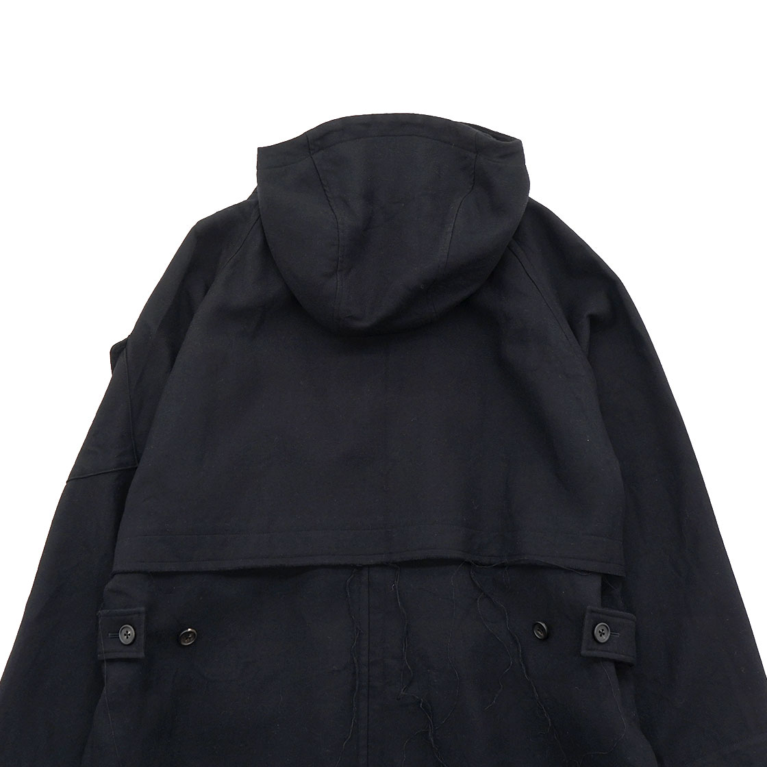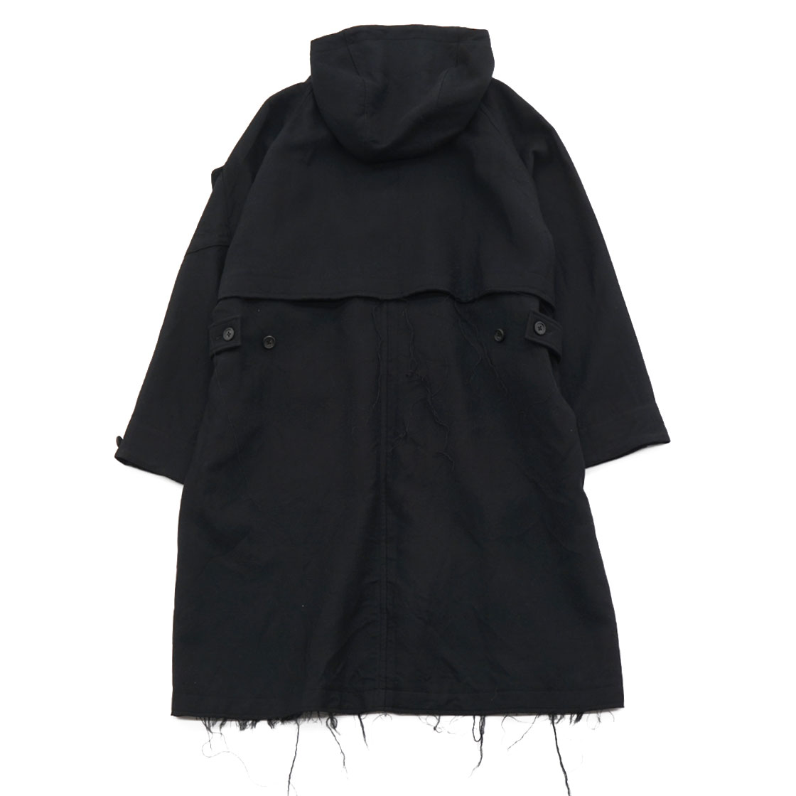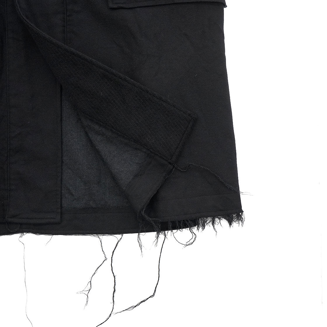 裾と背中のストームシールドは生地を断ち切りにし、あえてほつれさせています。昨年からのコンセプト「UNFINISHED」の流れを汲むデザイン。