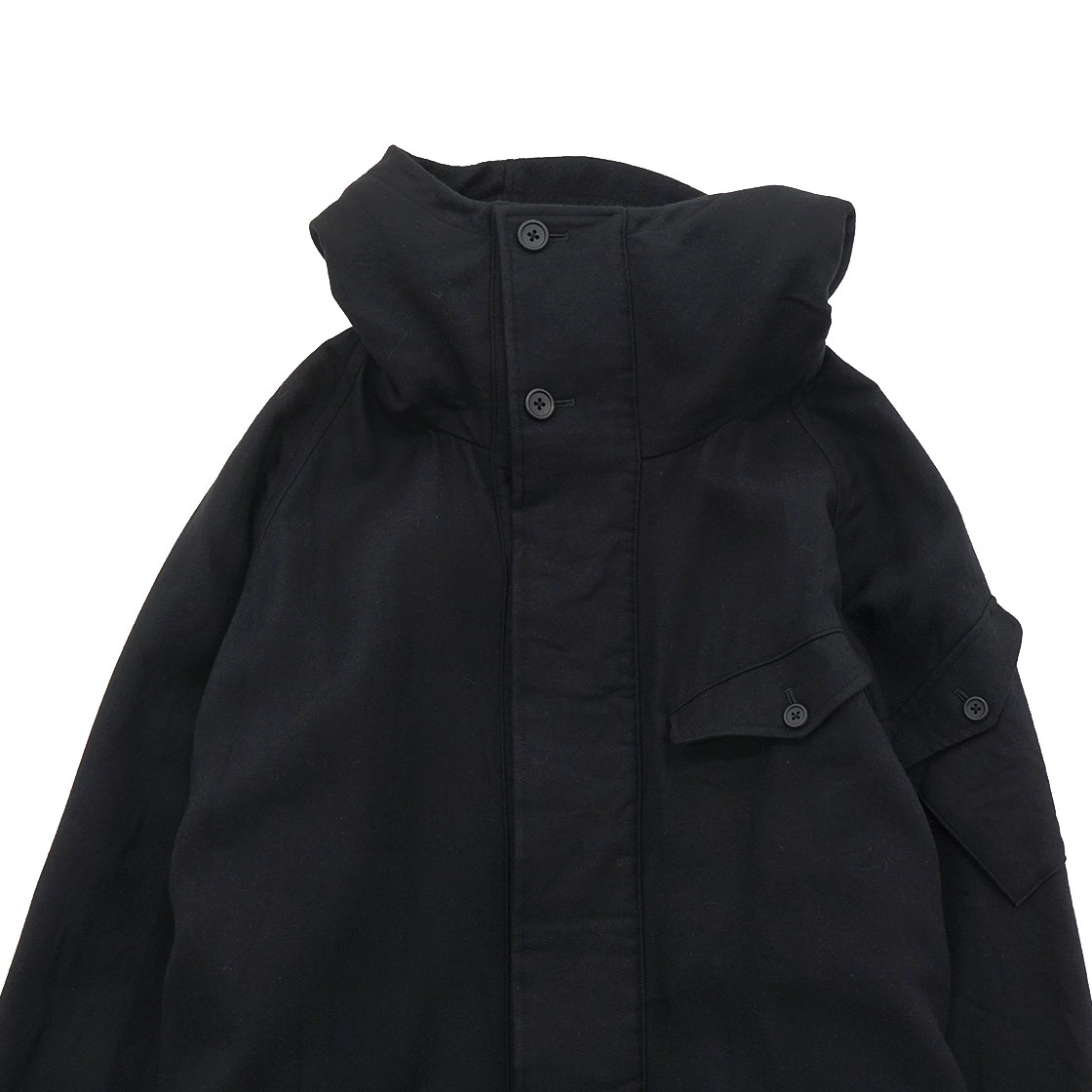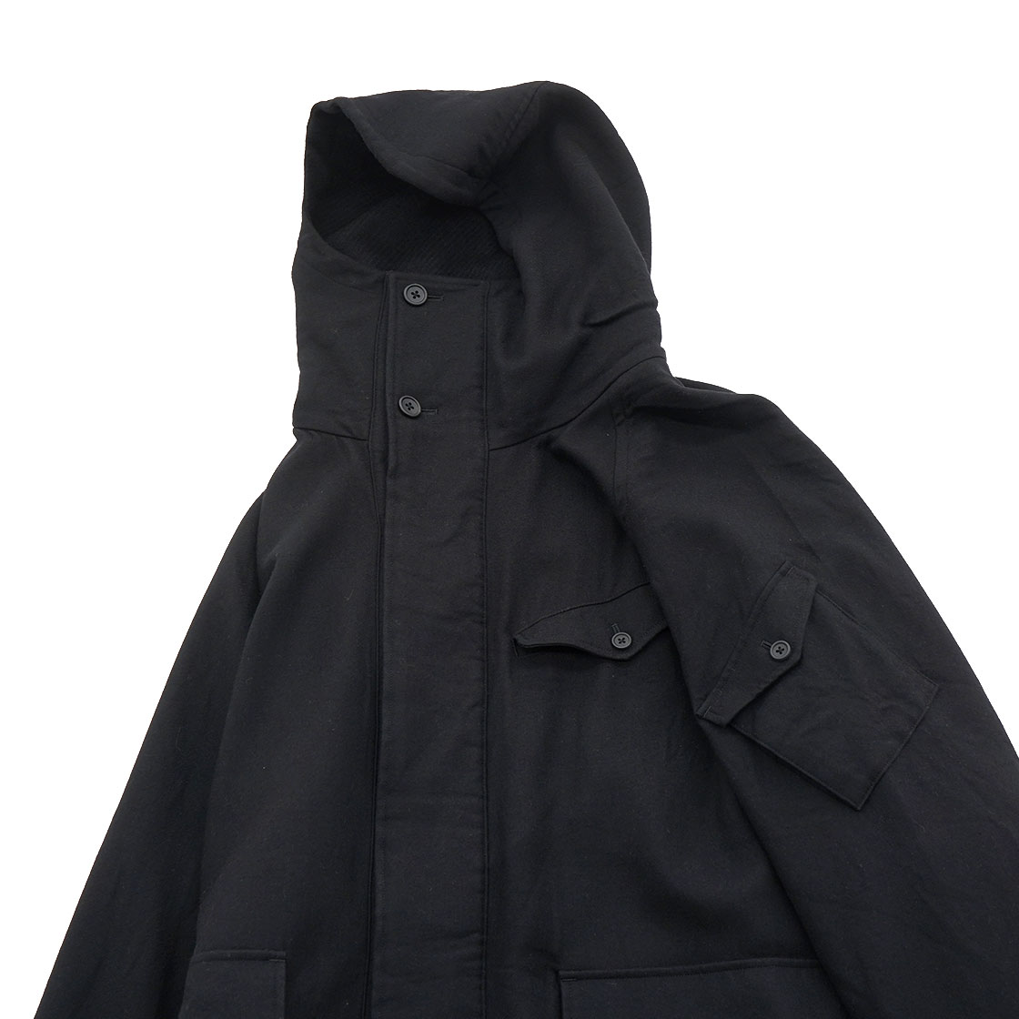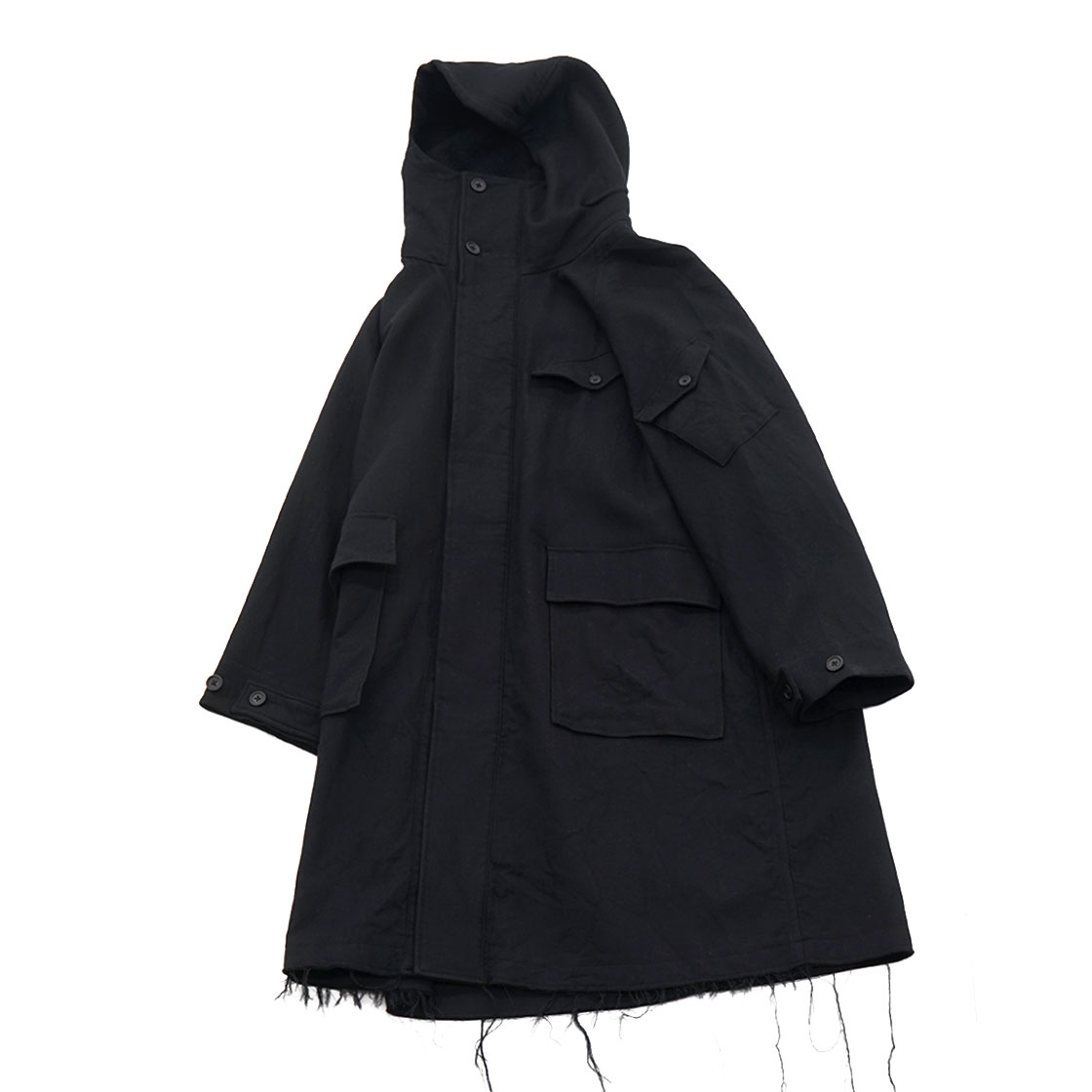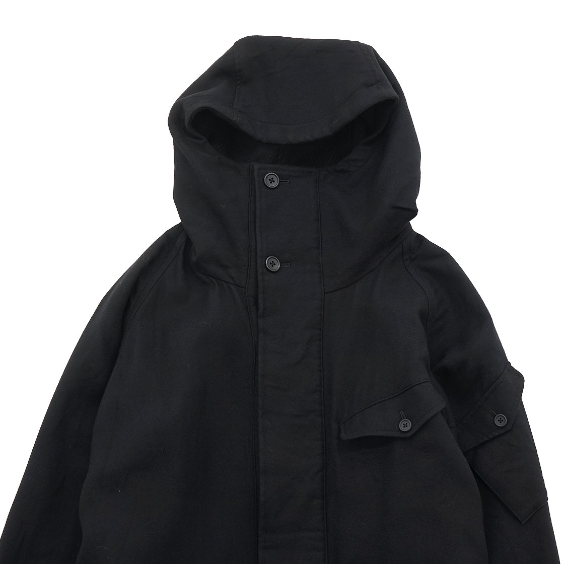 デザインは、フード付ウールコート。フードとウェストのストラップでシルエットをアレンジでき、この特別な生地をたっぷりと使いドレープが楽しめるようになっています。釦は本水牛。フード裏や前立て裏などには、ウール80%・シルク20%の生地を使用することで肌触りもよく、また見た目のアクセントにも。左腕のポケット・胸ポケットにスマートフォンやカードケースを入れることを想定。大きめな腰ポケットにはロングウォレットも収まり、特別な日だけに着る服ではなく、日常から着てほしいスペシャルなコートです。