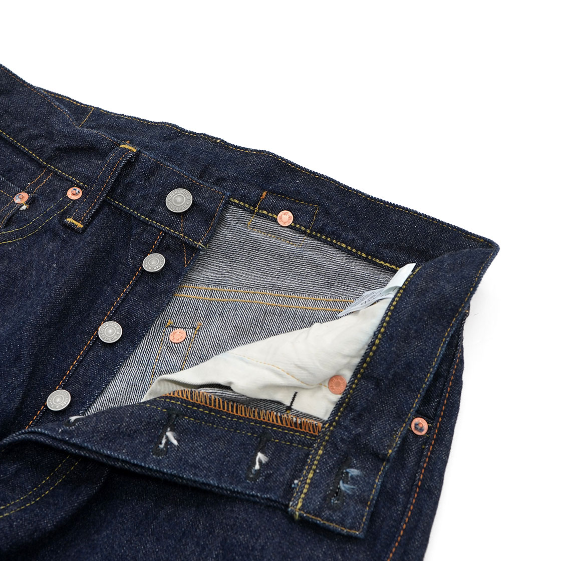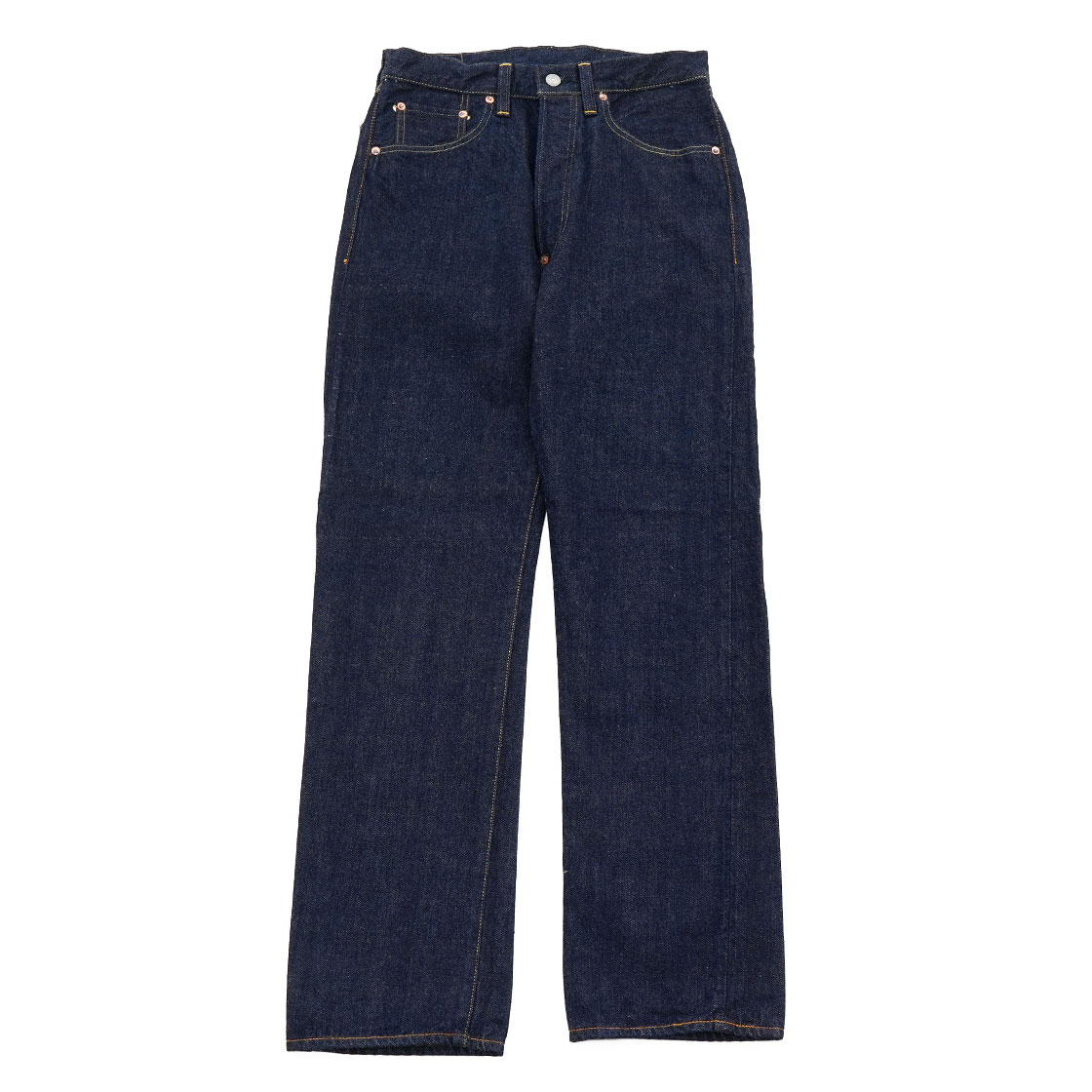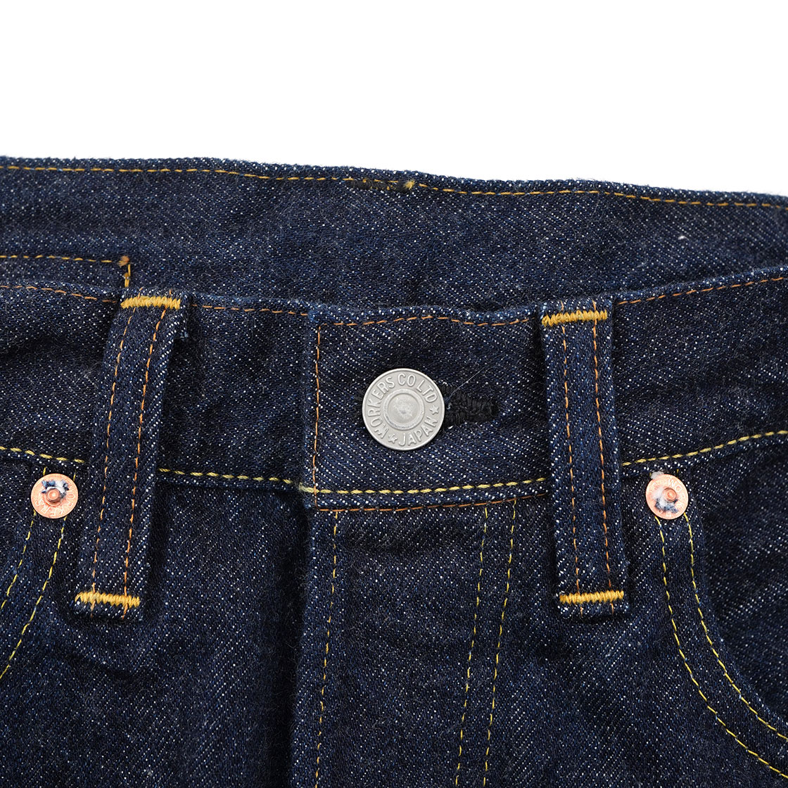 裾幅は以前作られた太いストレートの801XHより少し細く、定番の801 より太く。仕様は以前の801XHが大戦風でしたが、今回はバックシンチが付き、サスペンダーボタンが排除された時の37モデル風です。針シンチ&股リベットと特徴的なディテール。隠しリベットはいつも使う隠しリベット専用のものでは無く、刻印入り打ち抜きリベットを転用しているためふくらみが大きくなっています。革パッチは洗うとある程度固くなる鹿革を使用。