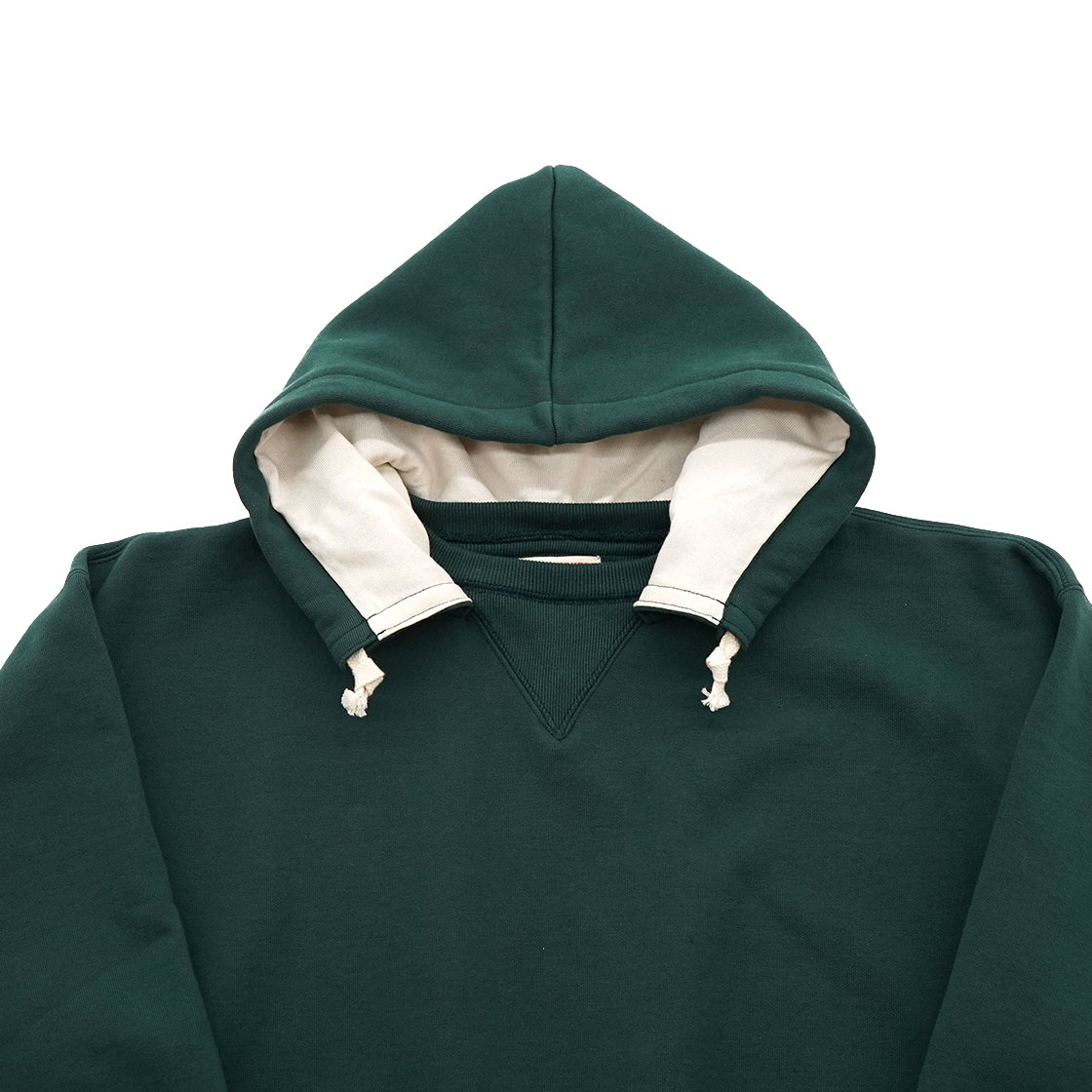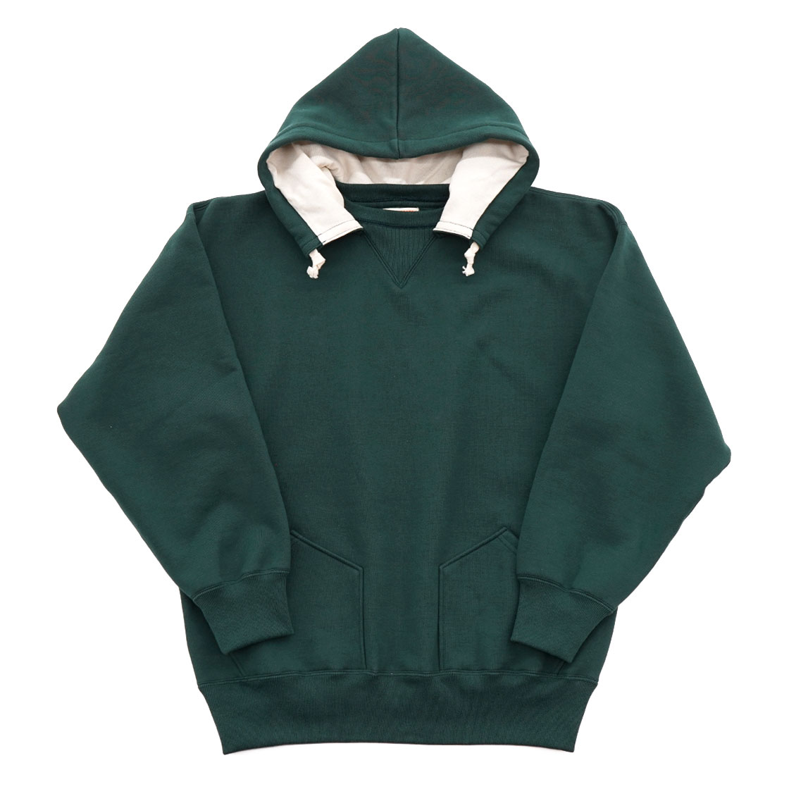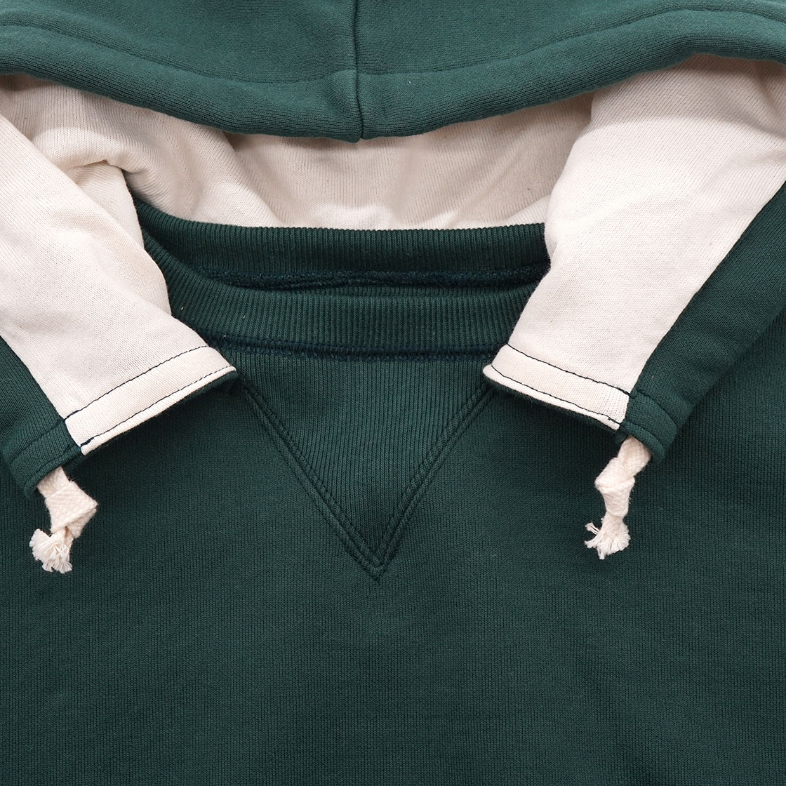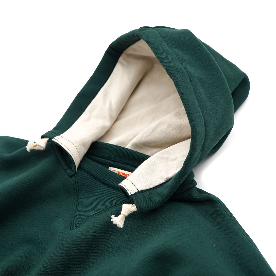 後付けフードは、クルーネックを作った後からフードを取り付けてパーカにしたもの。スウェットパーカというものが誕生した初期のディテールなので、1940年代以前にしか見られません。また「後付け」と言いながら、オリジナルにはフードを襟に流し込んで途中でつけているものもありますが、WORKERS の後付けは本当に「後付け」になっています。先にクルーネックのボディを作ってから最後にフードをつけています。フードの裏は切り替えにしてボディの裏毛よりは薄いT シャツ生地。ビンテージをリサーチしている時に発見した、数少ない仕様。フード裏までボディと同じ裏毛だと、厚みがありすぎて洗濯した時に洗濯後の乾きが遅くなってしまうので、それを解消するためにフード裏だけは別生地にしたのだと想定しています。さらに着用した時のメリットとして、フードが厚すぎないので首回りがゴワゴワしないということも考えられます。