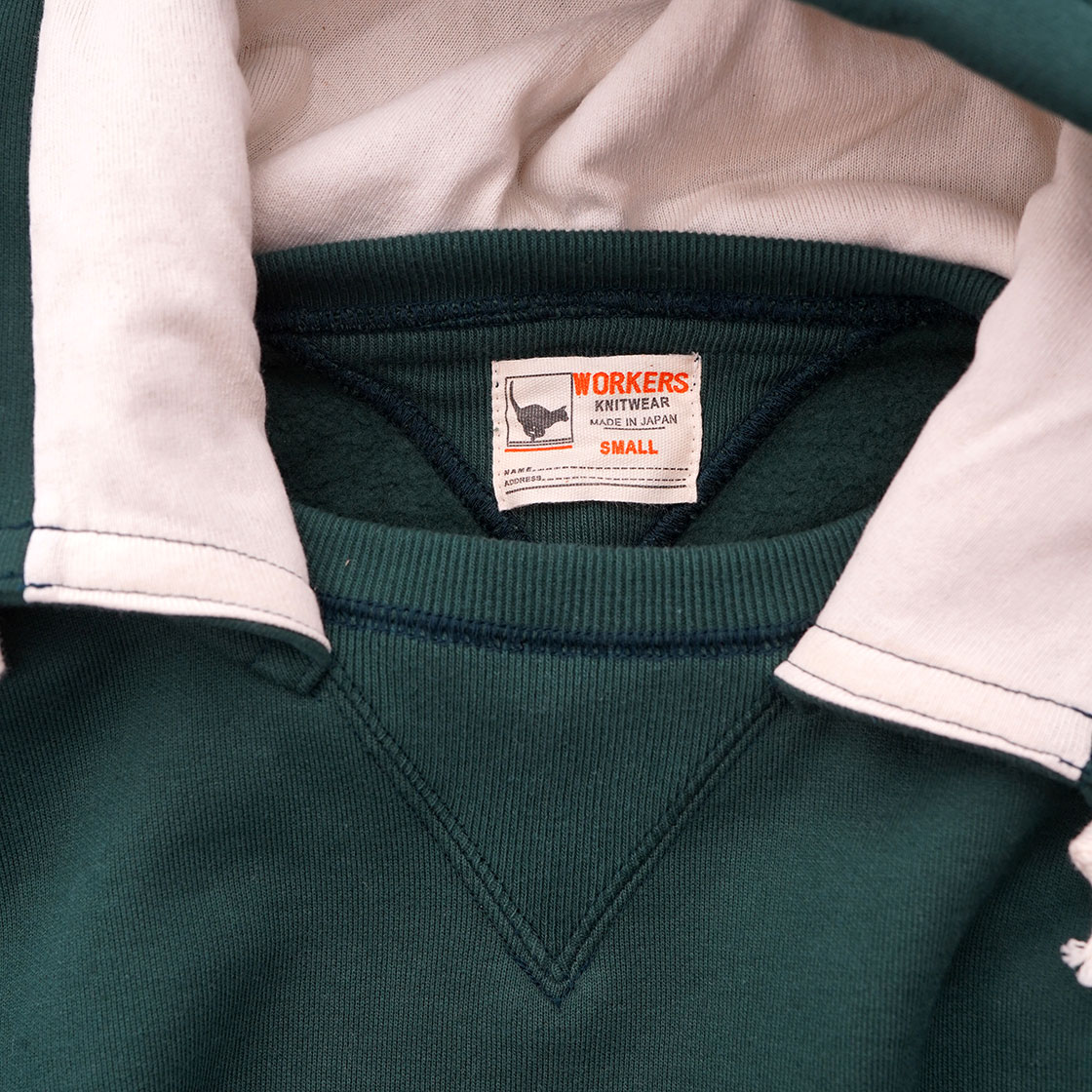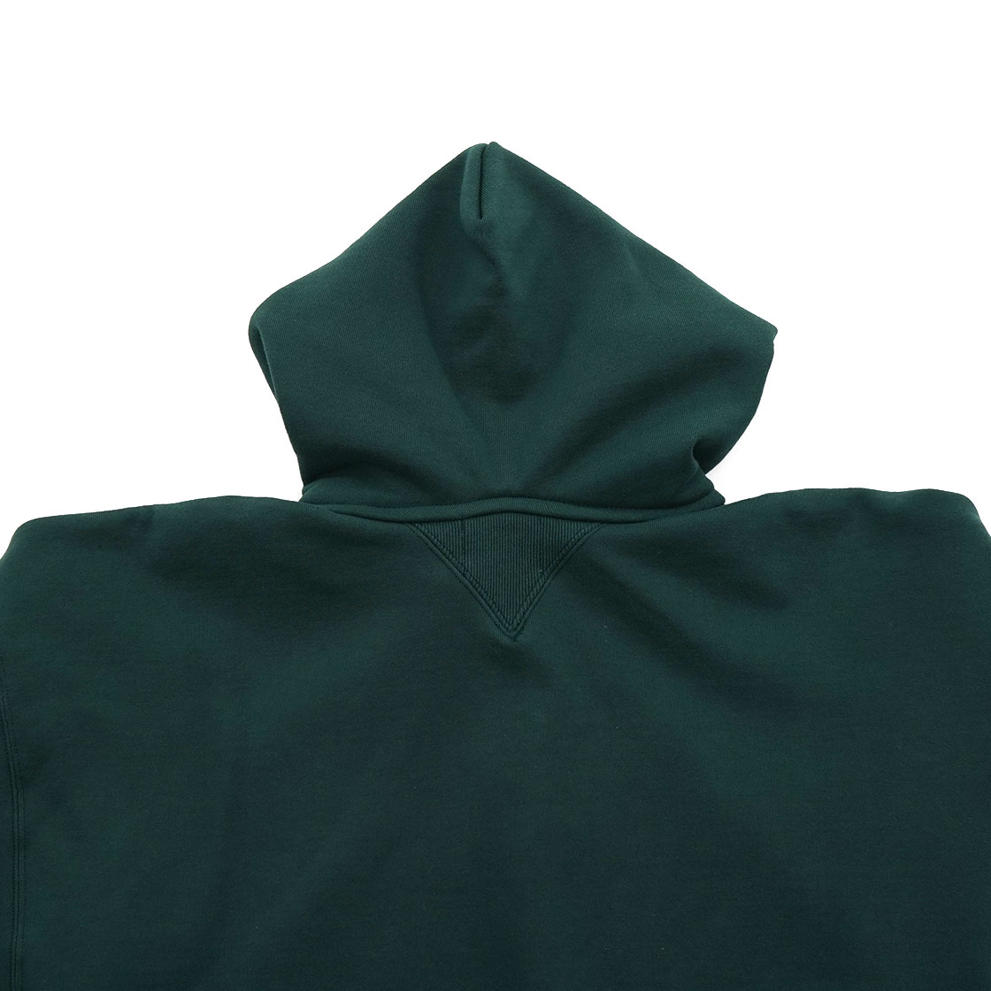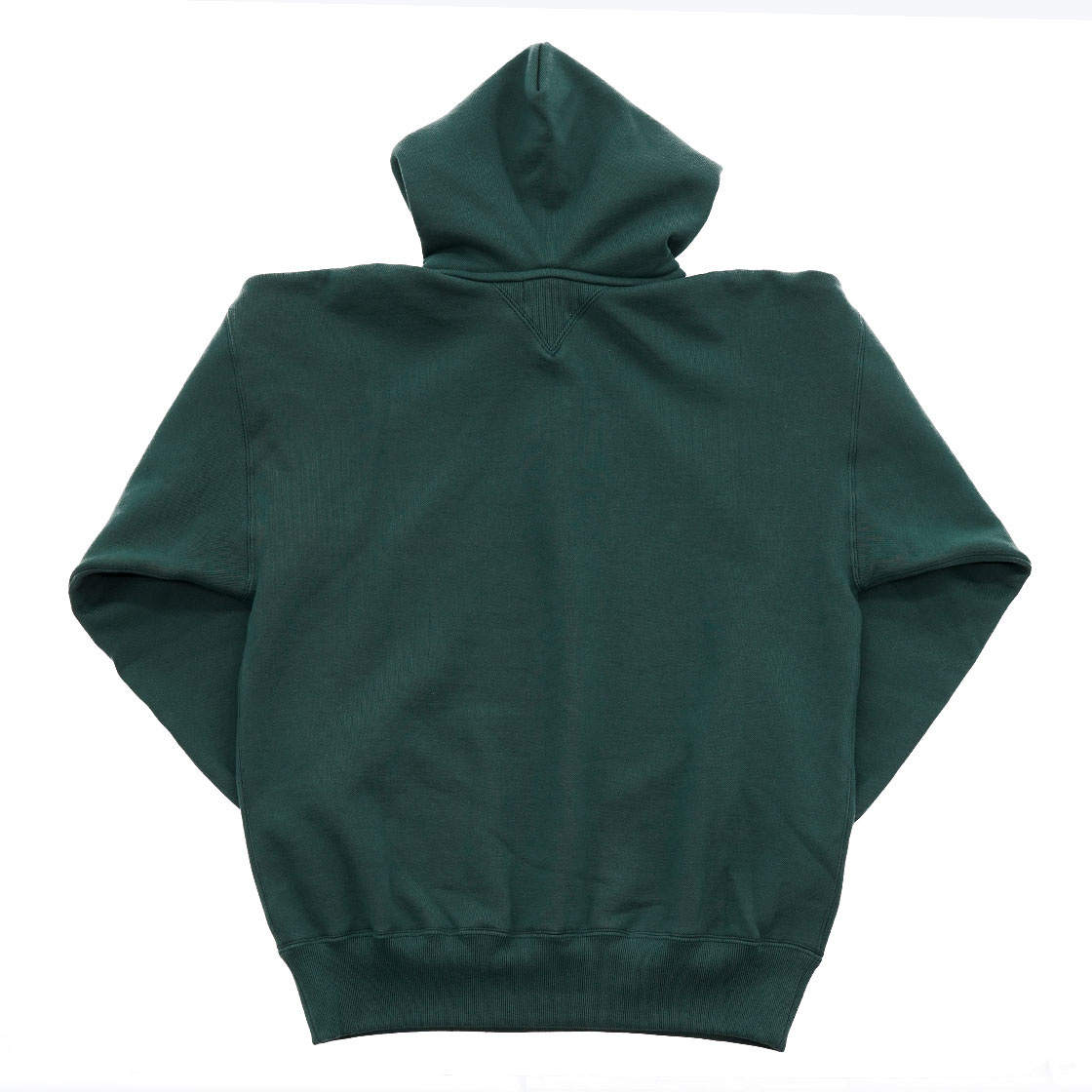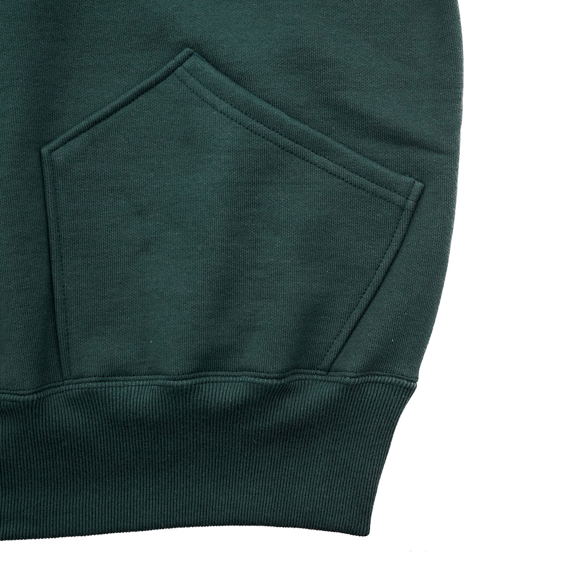 後付けフードは、クルーネックを作った後からフードを取り付けてパーカにしたもの。スウェットパーカというものが誕生した初期のディテールなので、1940年代以前にしか見られません。また「後付け」と言いながら、オリジナルにはフードを襟に流し込んで途中でつけているものもありますが、WORKERS の後付けは本当に「後付け」になっています。先にクルーネックのボディを作ってから最後にフードをつけています。フードの裏は切り替えにしてボディの裏毛よりは薄いT シャツ生地。ビンテージをリサーチしている時に発見した、数少ない仕様。フード裏までボディと同じ裏毛だと、厚みがありすぎて洗濯した時に洗濯後の乾きが遅くなってしまうので、それを解消するためにフード裏だけは別生地にしたのだと想定しています。さらに着用した時のメリットとして、フードが厚すぎないので首回りがゴワゴワしないということも考えられます。