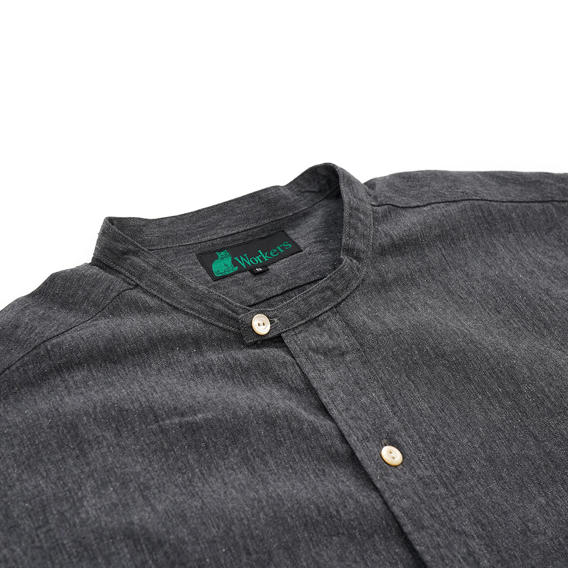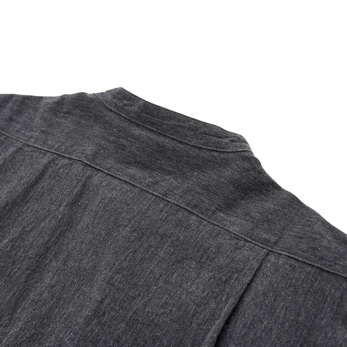 生地はブラックシャンブレー。1950年代頃のアメリカのワークシャツに見られるブラックシャンブレーシャツも、この型にあてはめればフレンチな印象に様変わり。