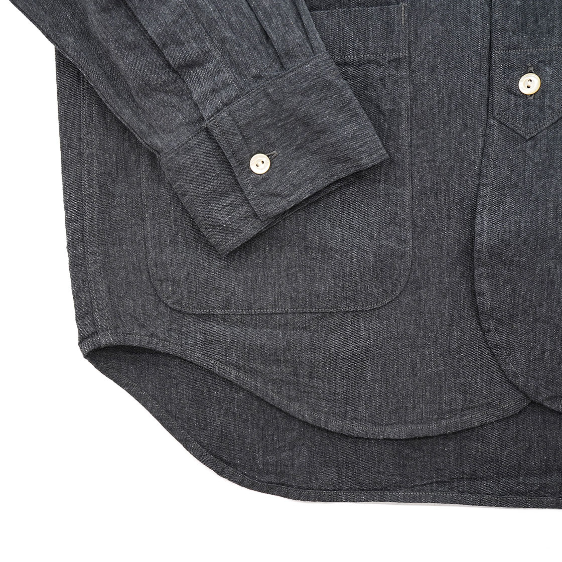 胸ポケはシャツならだいたい1個の所、2個に。サイズも少し大きくして腰の左右に配置することで、シャツからジャケット寄りの印象を与えることができます。反対に、シャツらしさを残したのが裾と袖口。裾をスクエアカットにすればジャケット風になりますが、今回は一筆に三巻縫いしたラウンド形状。ラウンド形状はクラシックな雰囲気が出るので、ジャケットぽさよりもクラシックさでフォレスティエールにアプローチしています。