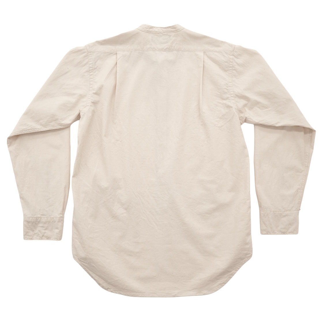 フォレスティエールと言えば、スタンドカラー に飛び出したチンストラップが特徴。しかしシャツの場合、襟が太すぎるとバランスが悪いので、ビンテージのバンドカラーシャツを参考に幅を細く修正しています。