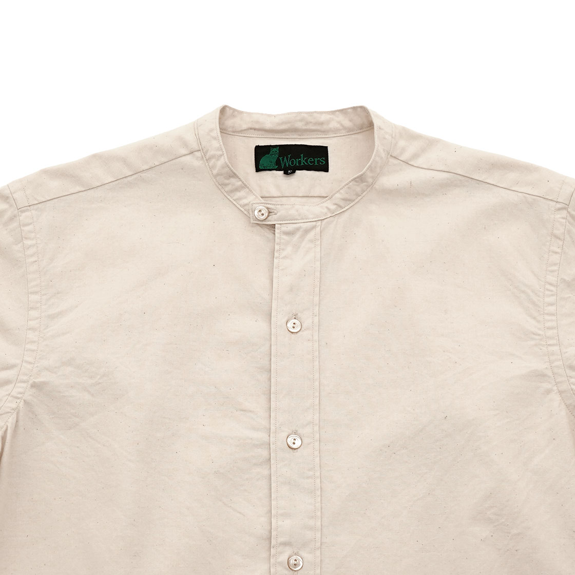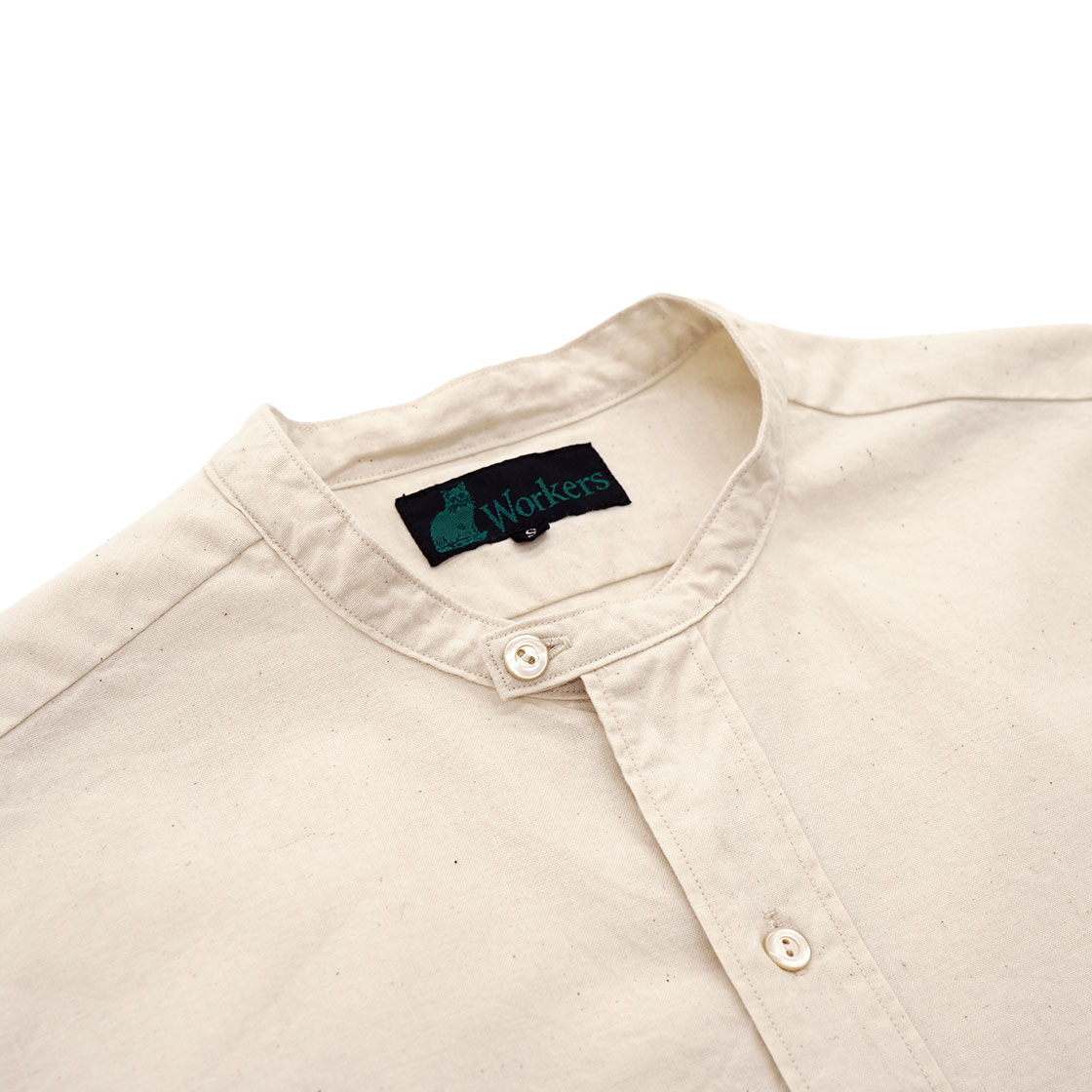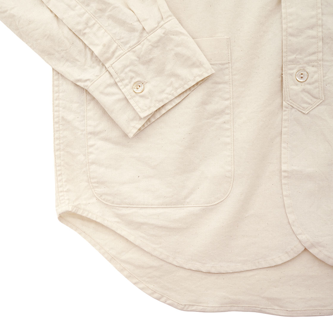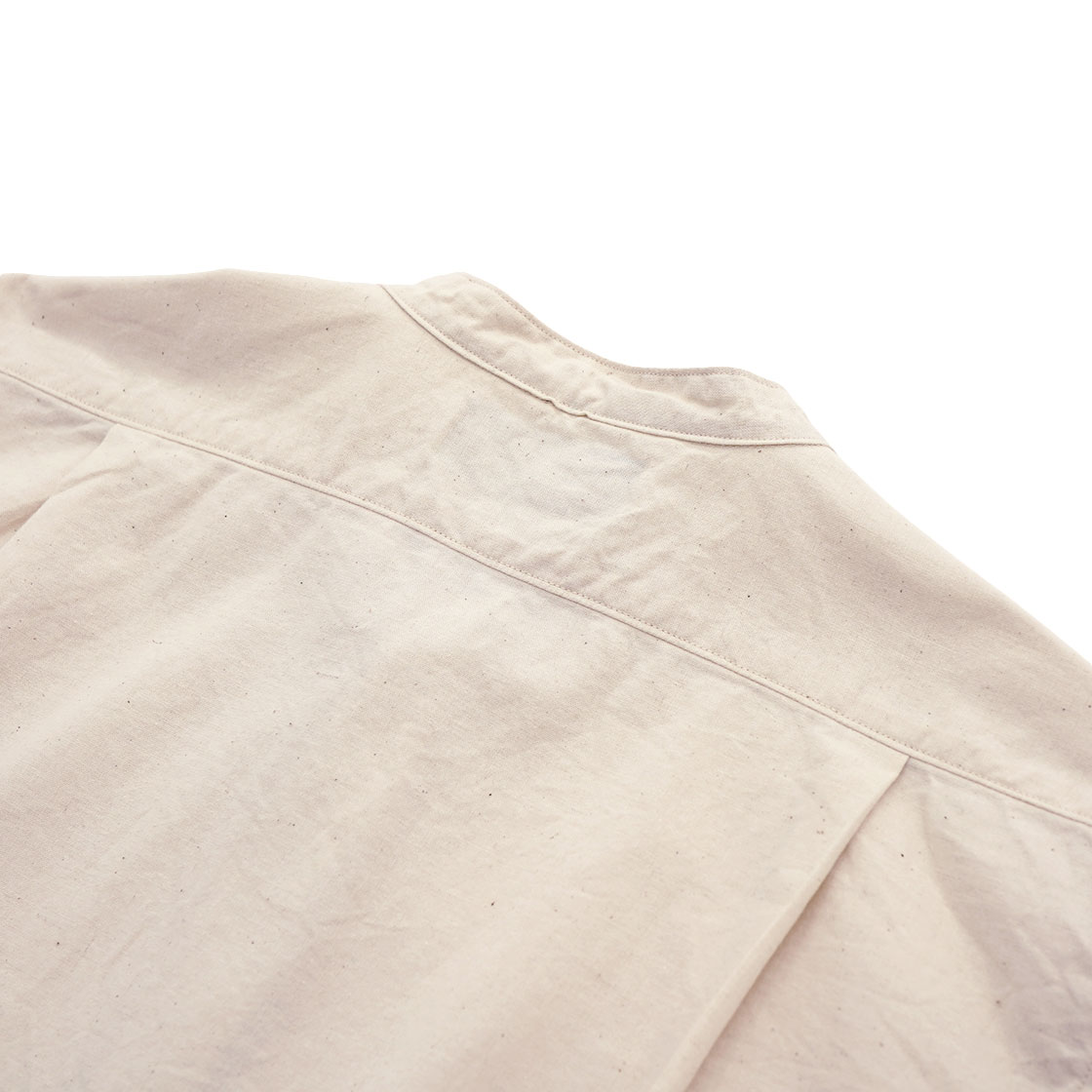 生地は漂白せずに綿カスを残した、自然な風合いの生成り。洗って育てていく楽しみもあります。シャツとしても、夏場のライトアウターとしても使いやすい厚みです。