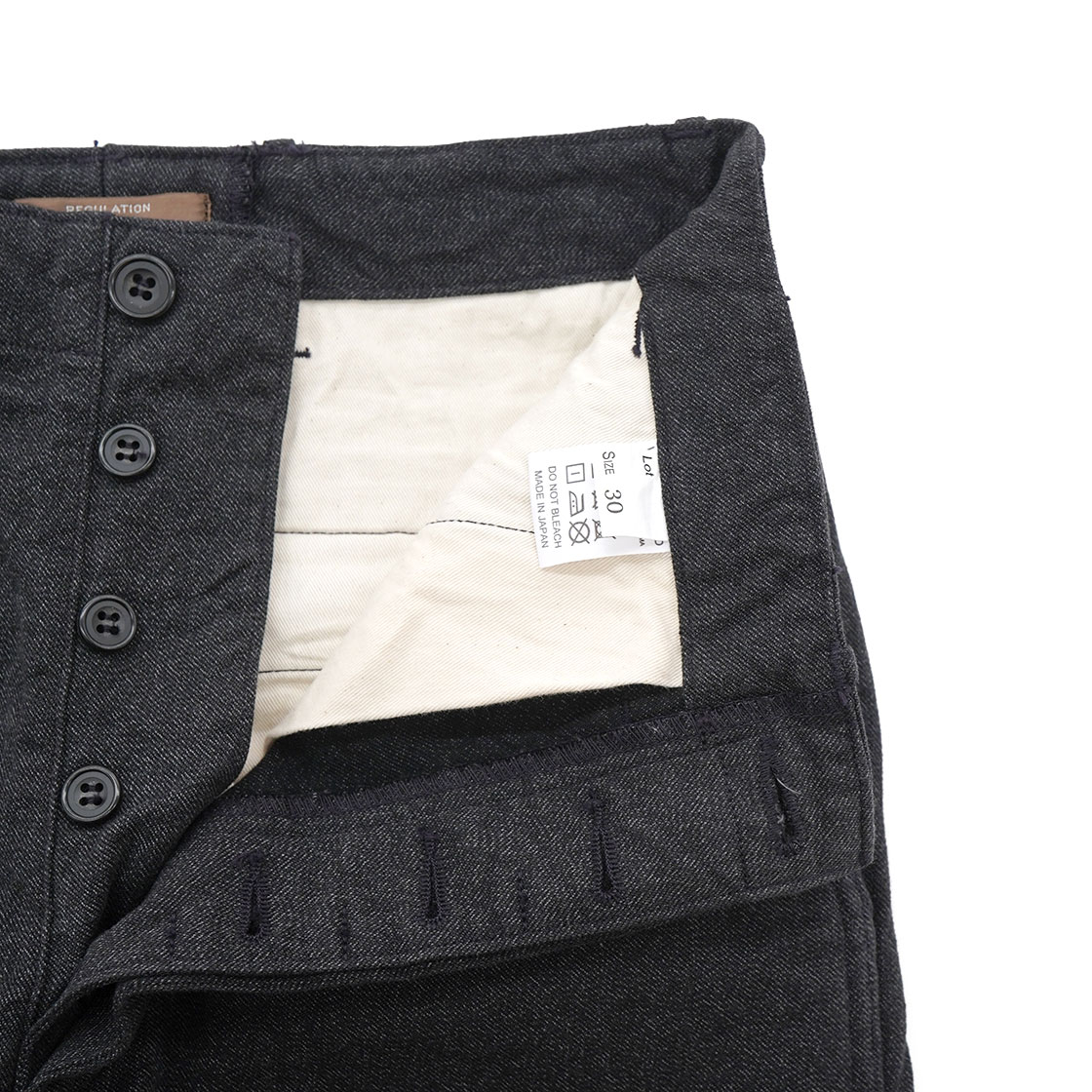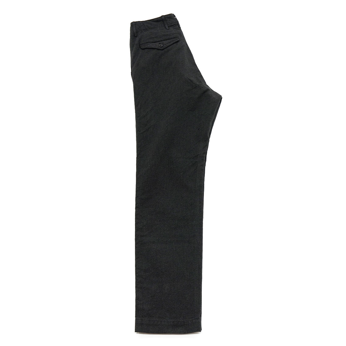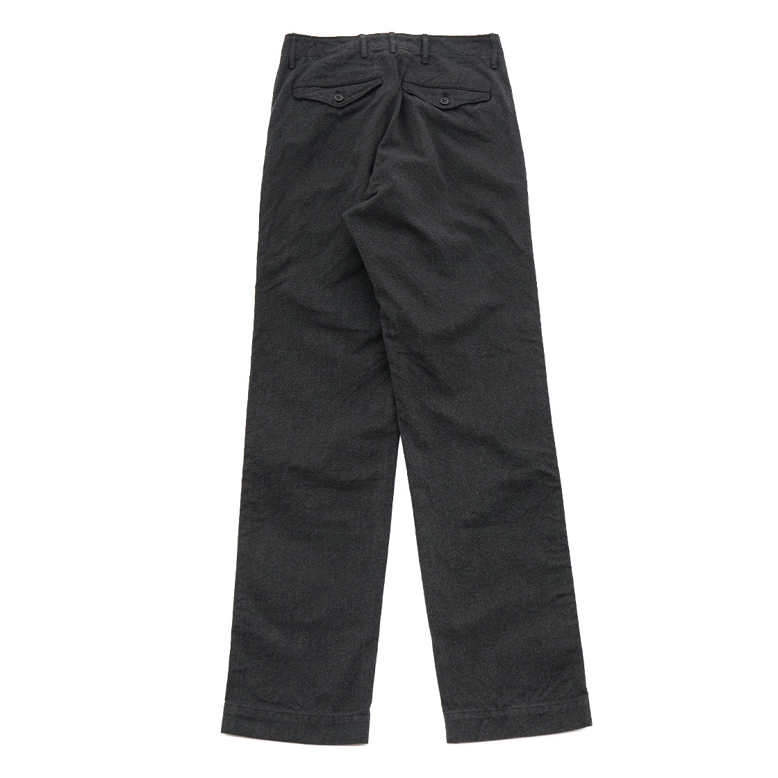 例えばSlim Fitでは、ふくらはぎが細くて穿けないという方にお勧めです。バックポケットが両玉縁ではなく、フラップ付きポケットにしているのは、ミリタリーチノよりもトラウザーズに寄せたいという思いから。後ろ中心の縫製も、巻き(ダブルステッチ)ではなく割りでスッキリとさせています。内股と脇の縫製は、ダブルステッチのType 2 バージョン。フロントはボタンフライ、比翼止めステッチ有りと、クラシックなトラウザーズの仕様です。