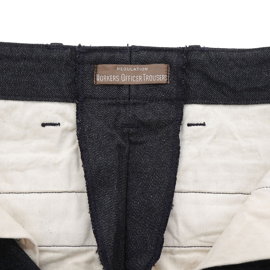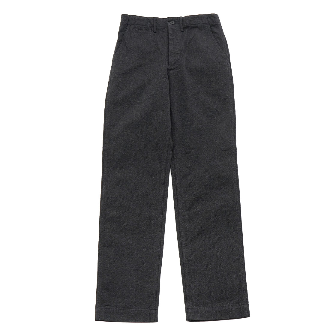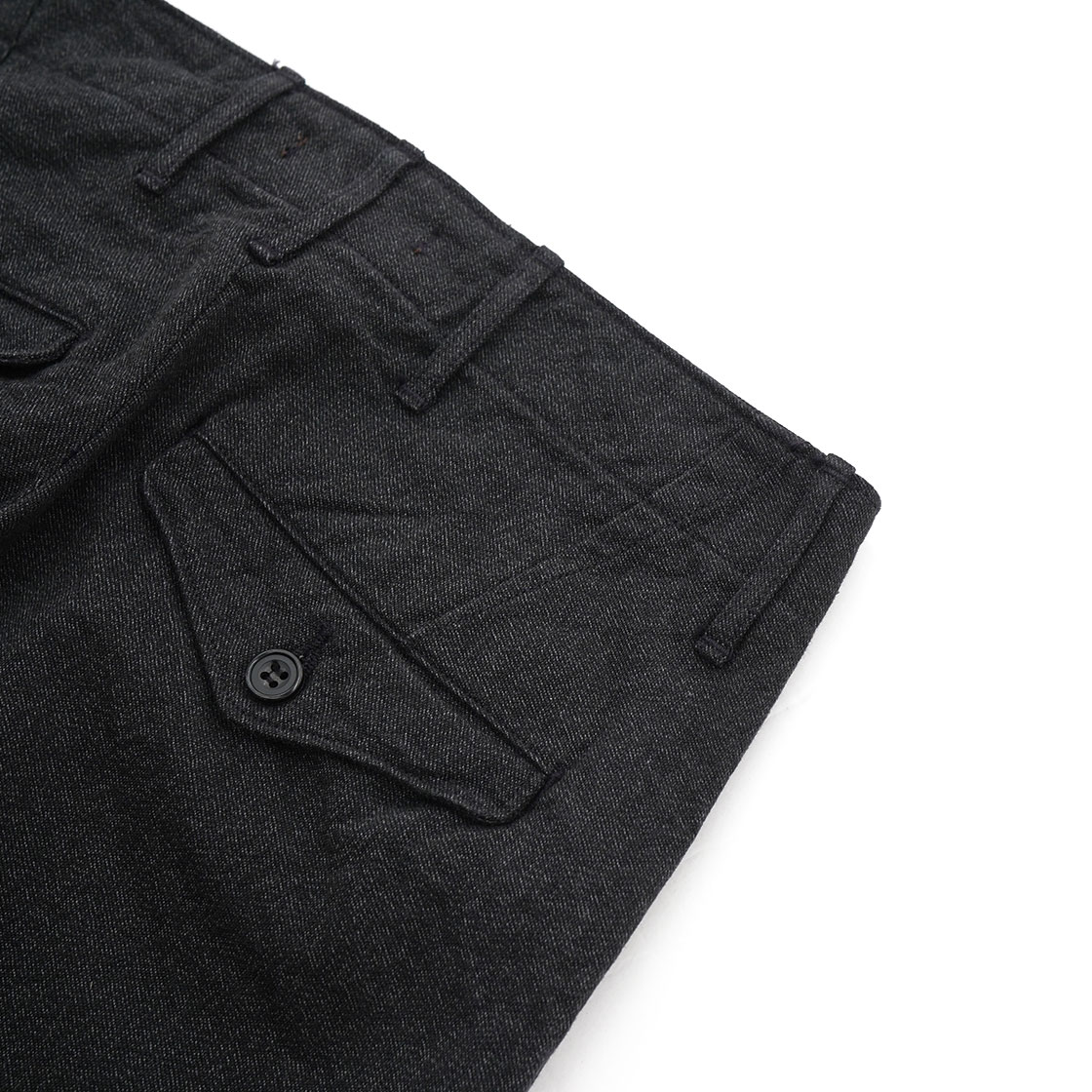 例えばSlim Fitでは、ふくらはぎが細くて穿けないという方にお勧めです。バックポケットが両玉縁ではなく、フラップ付きポケットにしているのは、ミリタリーチノよりもトラウザーズに寄せたいという思いから。後ろ中心の縫製も、巻き(ダブルステッチ)ではなく割りでスッキリとさせています。内股と脇の縫製は、ダブルステッチのType 2 バージョン。フロントはボタンフライ、比翼止めステッチ有りと、クラシックなトラウザーズの仕様です。
