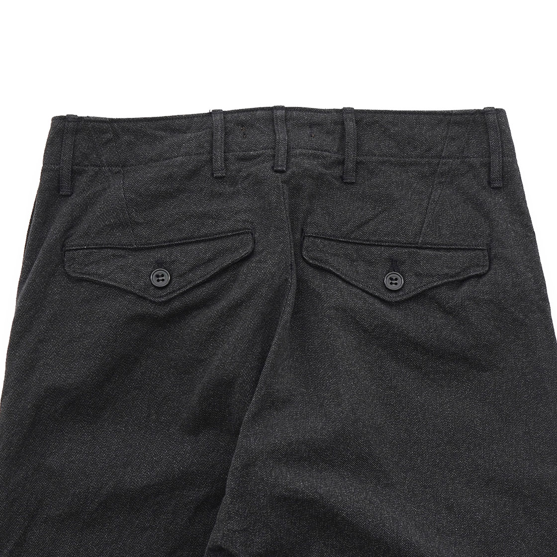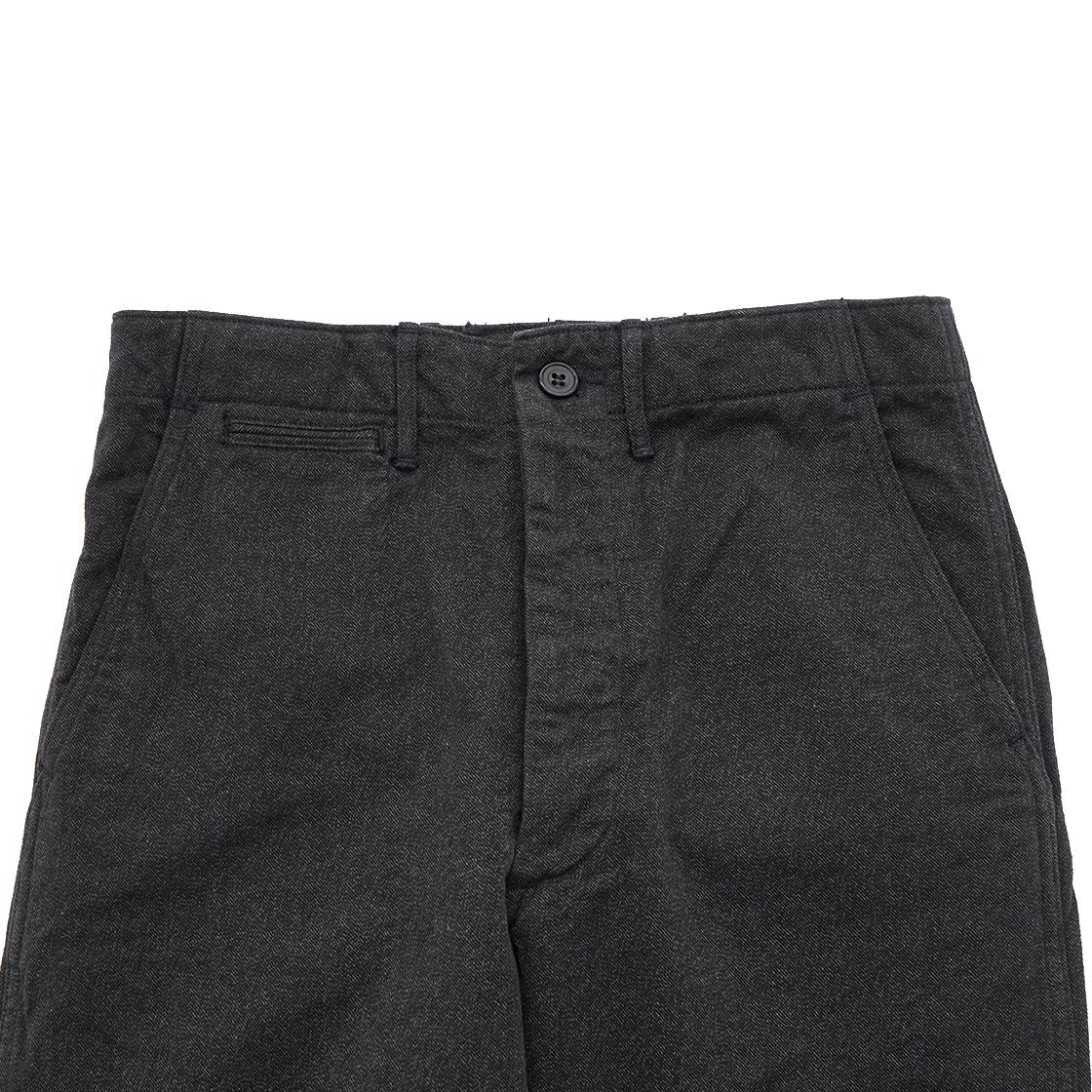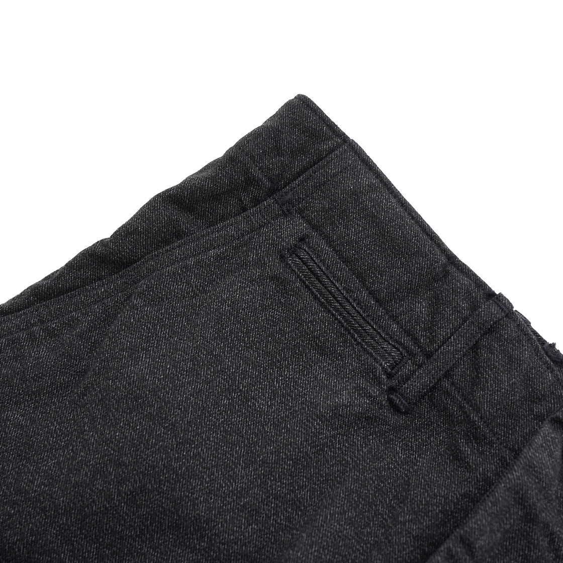 生地はWKS Covertと名付けた別注生地。「撚り杢(よりもく)」という生地で、濃いブラック系と薄っすらグレー系に染めた糸を「撚り」合わせてタテ糸を作ったもの。糸を2 色染め、さらにより合わせてから織ることで生まれる「杢(もく)」という表情。糸に撚りがかかっているからか手触りは固めで、見た目のヴィンテージ感だけでなく経年変化も楽しみな生地です。